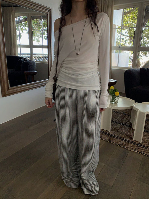 繊細な透け感と、ゆるやかなドレープが美しいオフショルダートップス。程よいシアー素材が女性らしい抜け感を演出し、どんなボトムにも自然と溶け込みます。肩を落としてデコルテを綺麗に魅せるシルエットは、抜け感のある大人カジュアルにぴったり。デニムでカジュアルダウンしたり、スラックスでモードに寄せても◎夏の軽やかなレイヤードコーデに活躍する、主役級アイテムです。