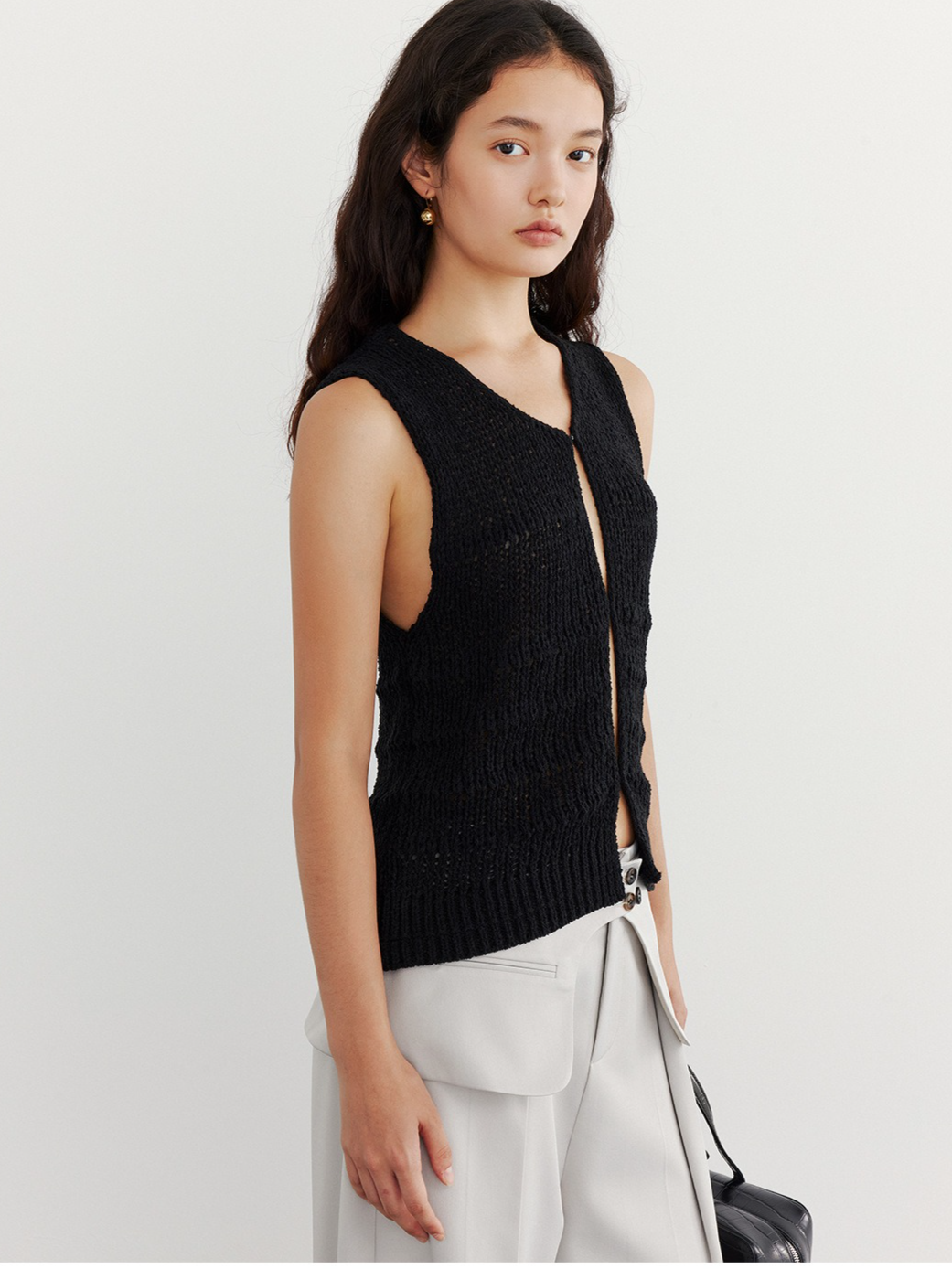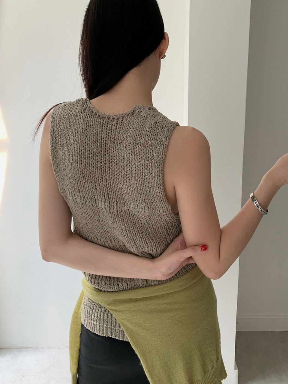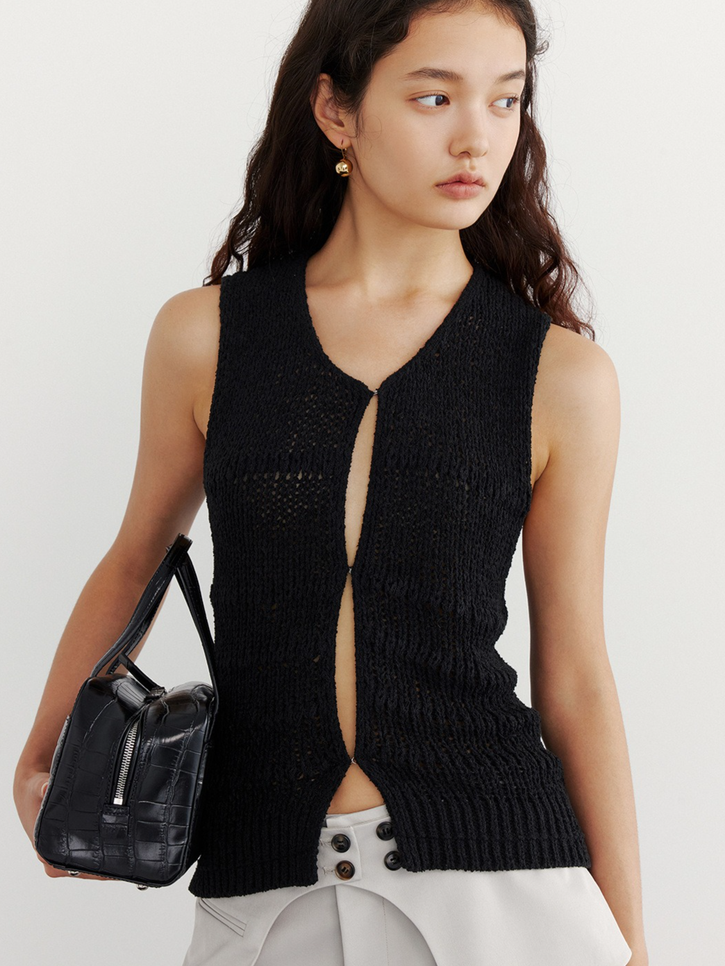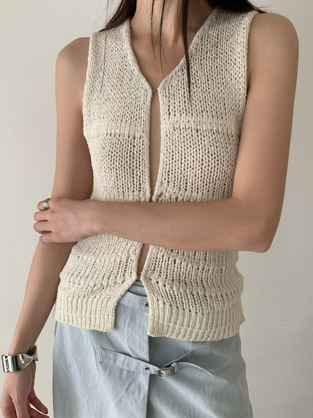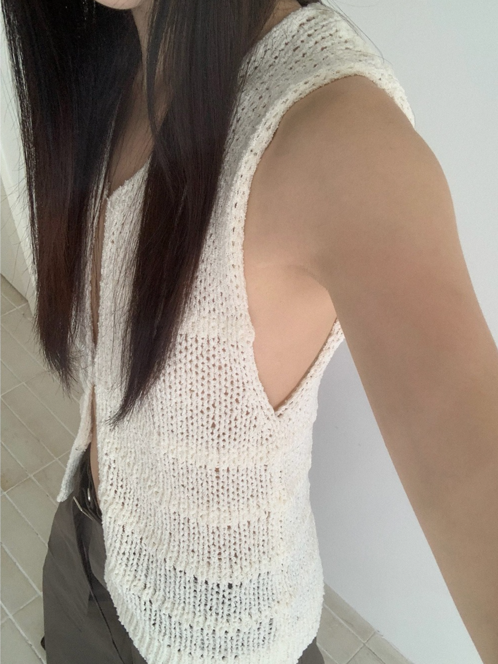 立体的な編み地と程よい透け感のある、表情豊かなミックスメッシュニットベスト。
