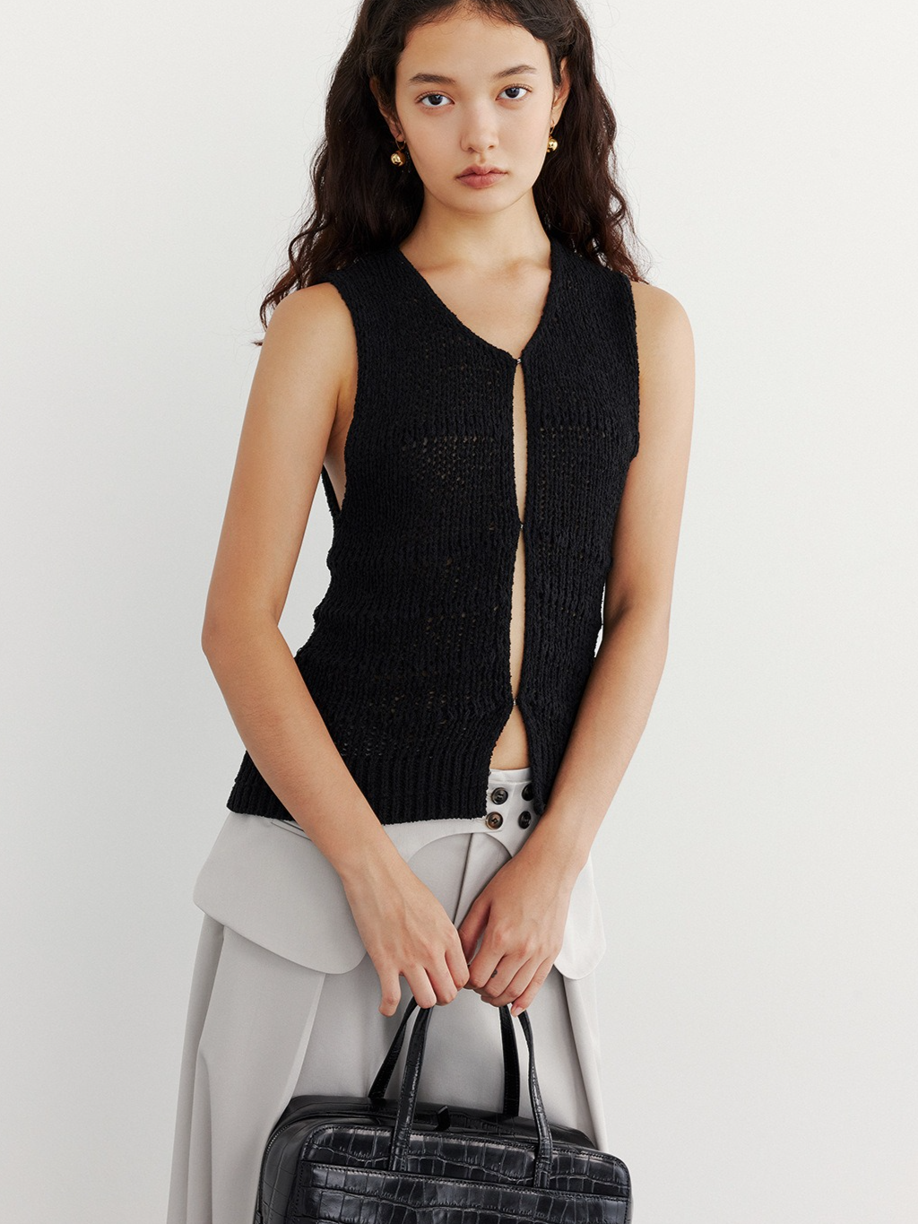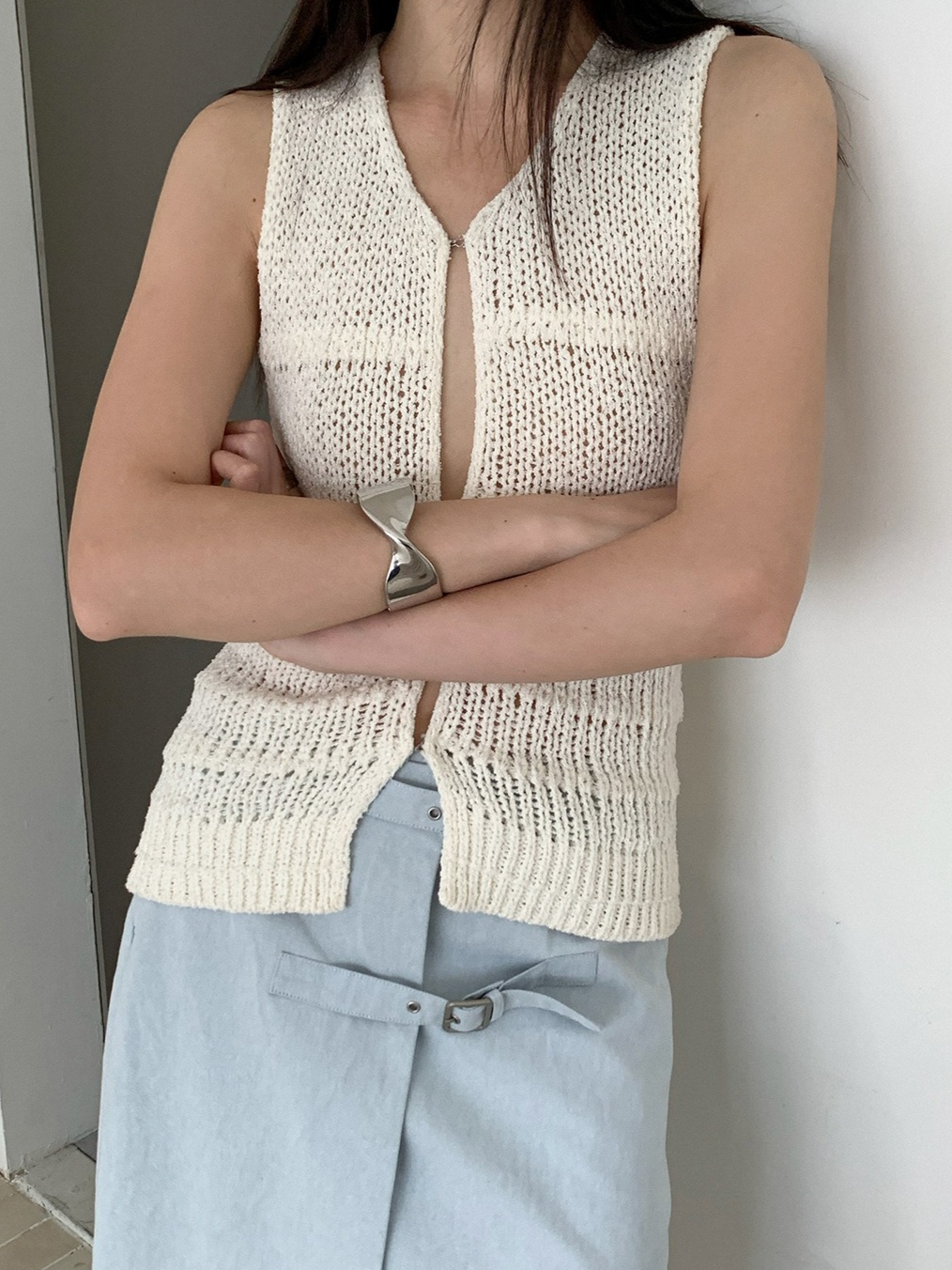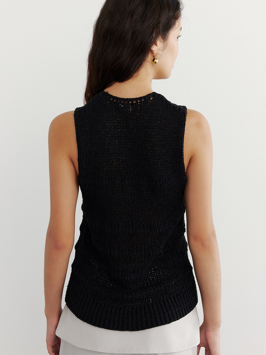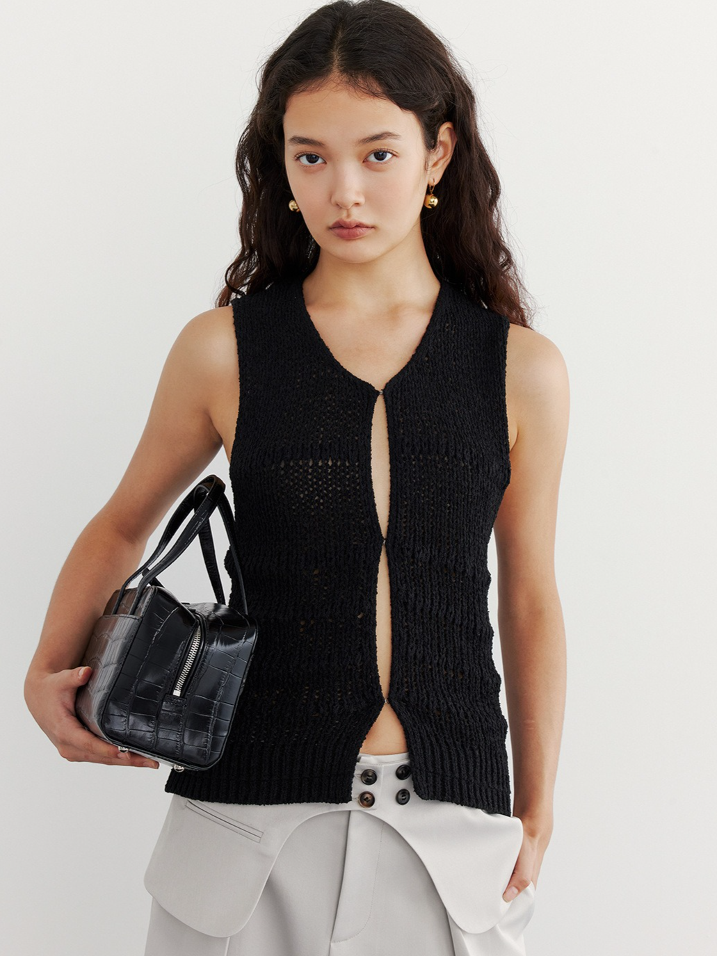 立体的な編み地と程よい透け感のある、表情豊かなミックスメッシュニットベスト。
