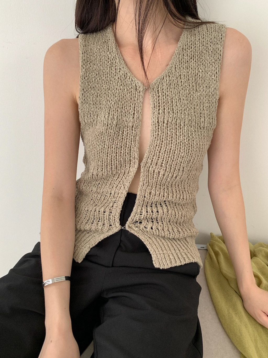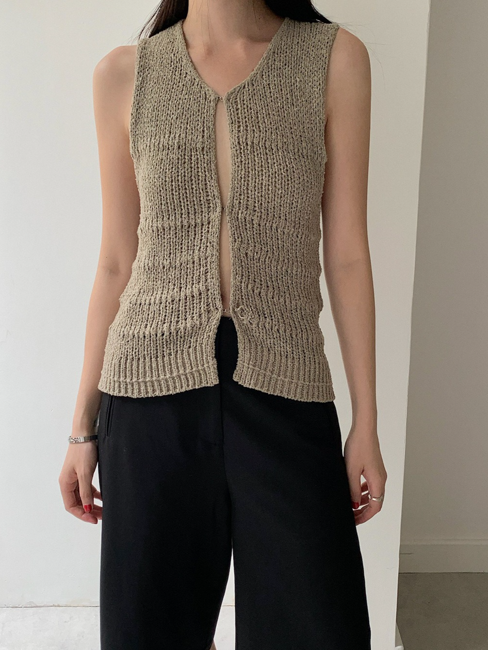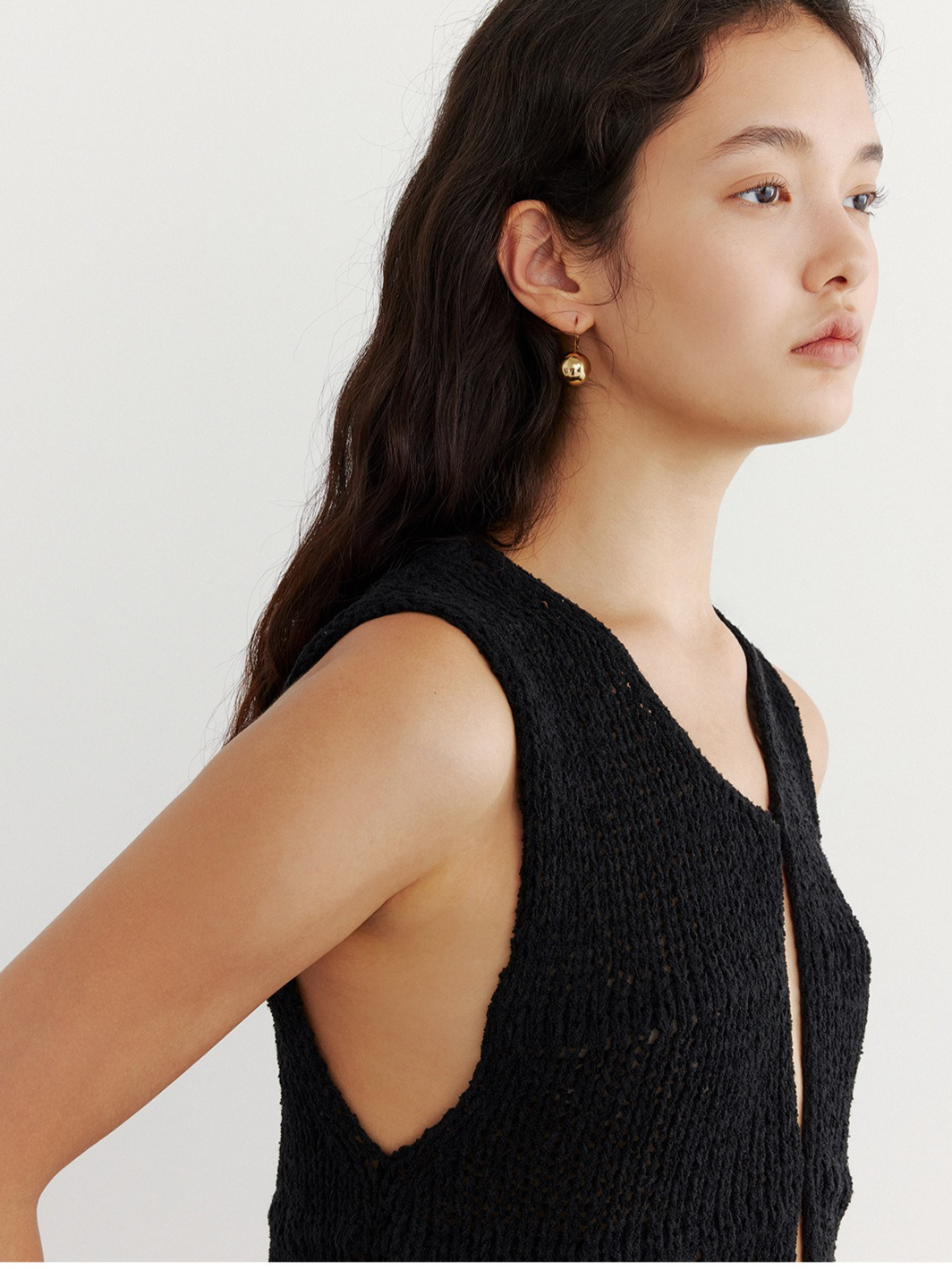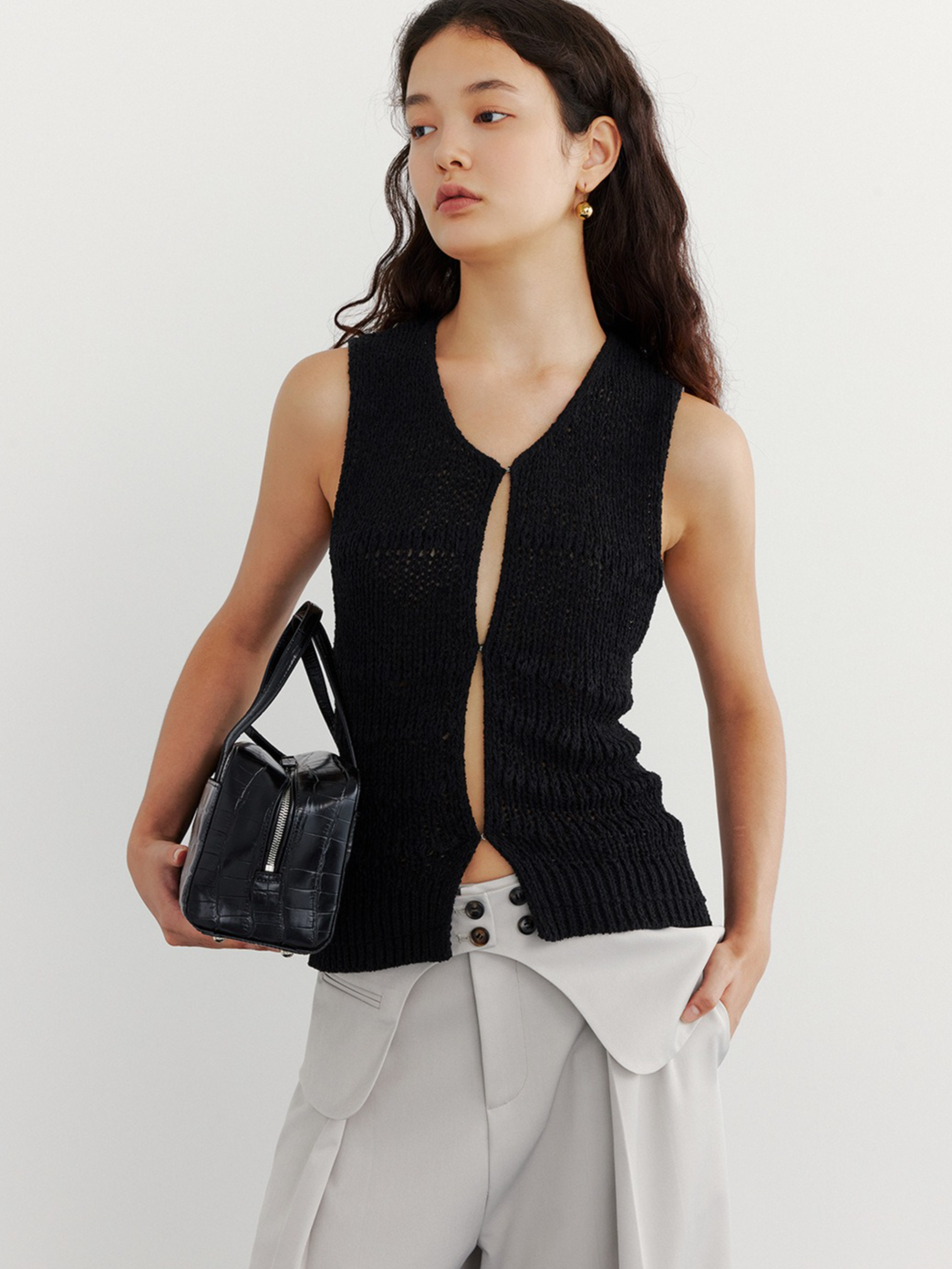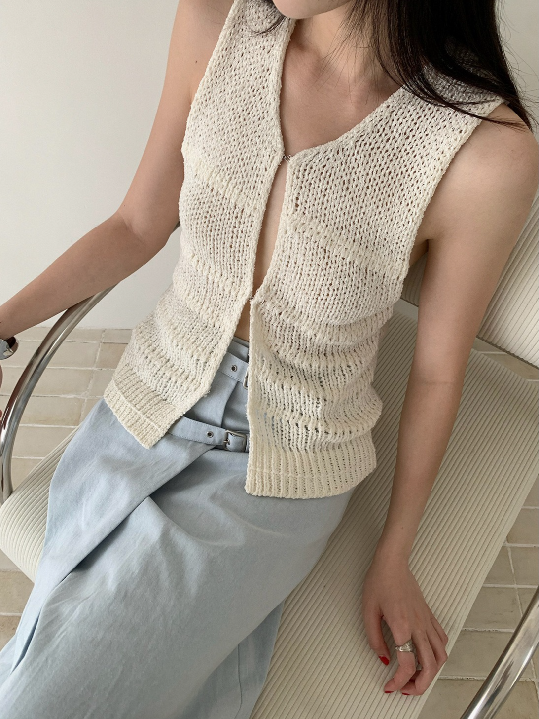 立体的な編み地と程よい透け感のある、表情豊かなミックスメッシュニットベスト。