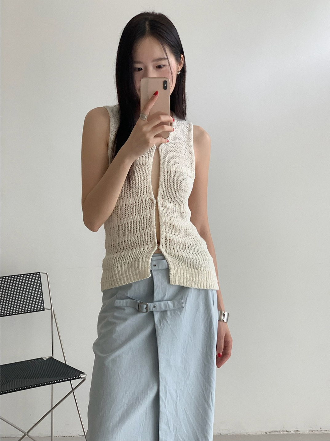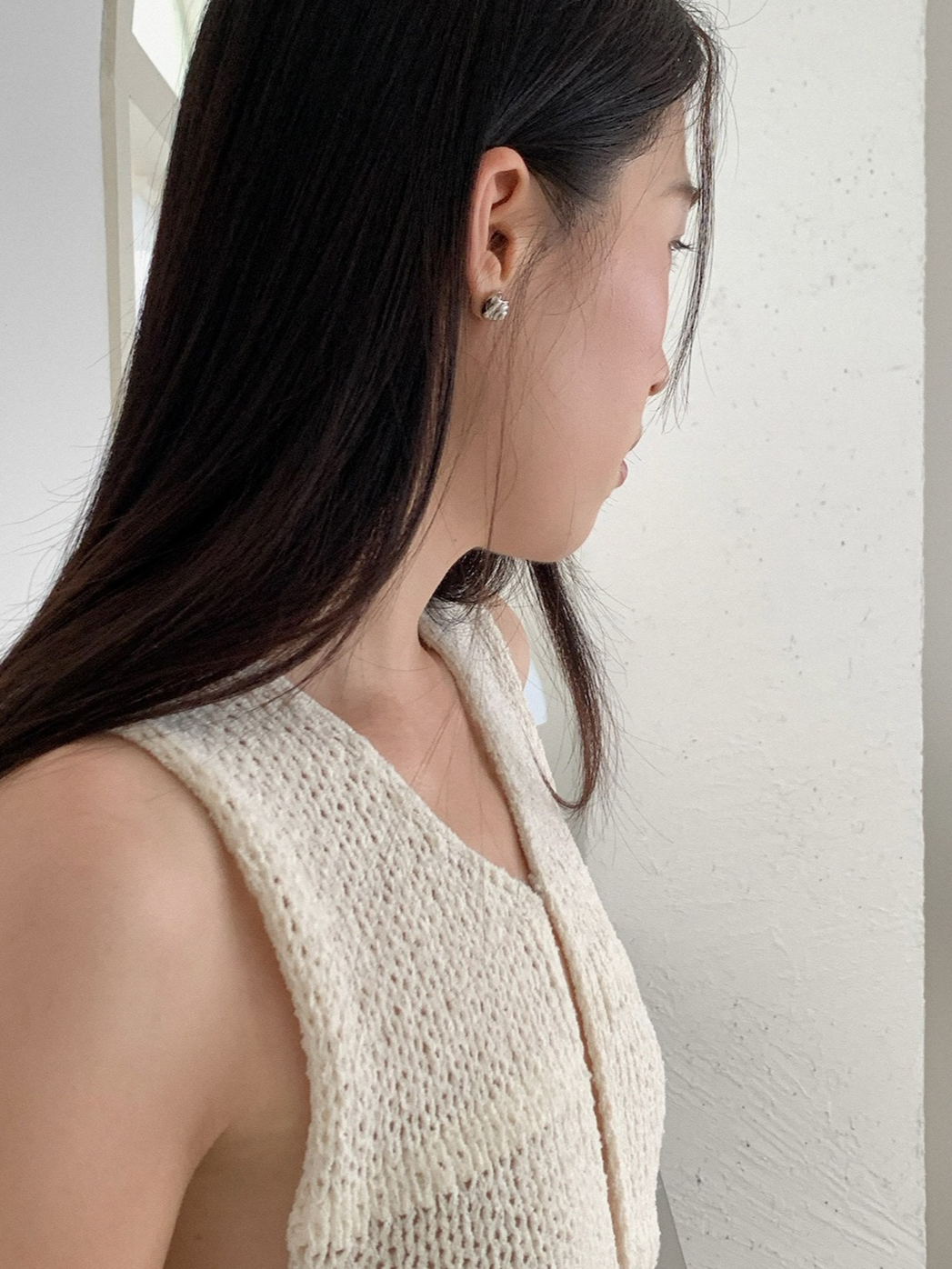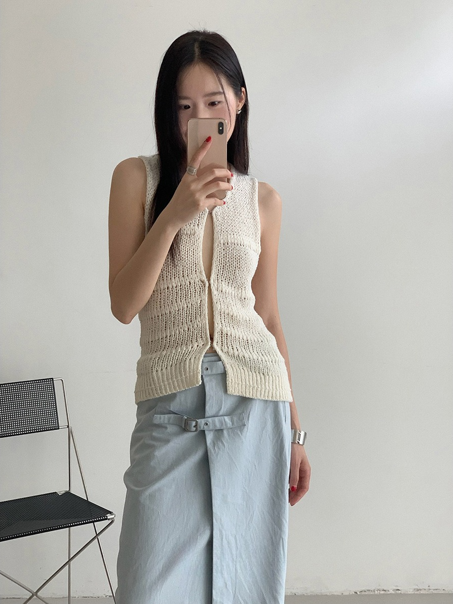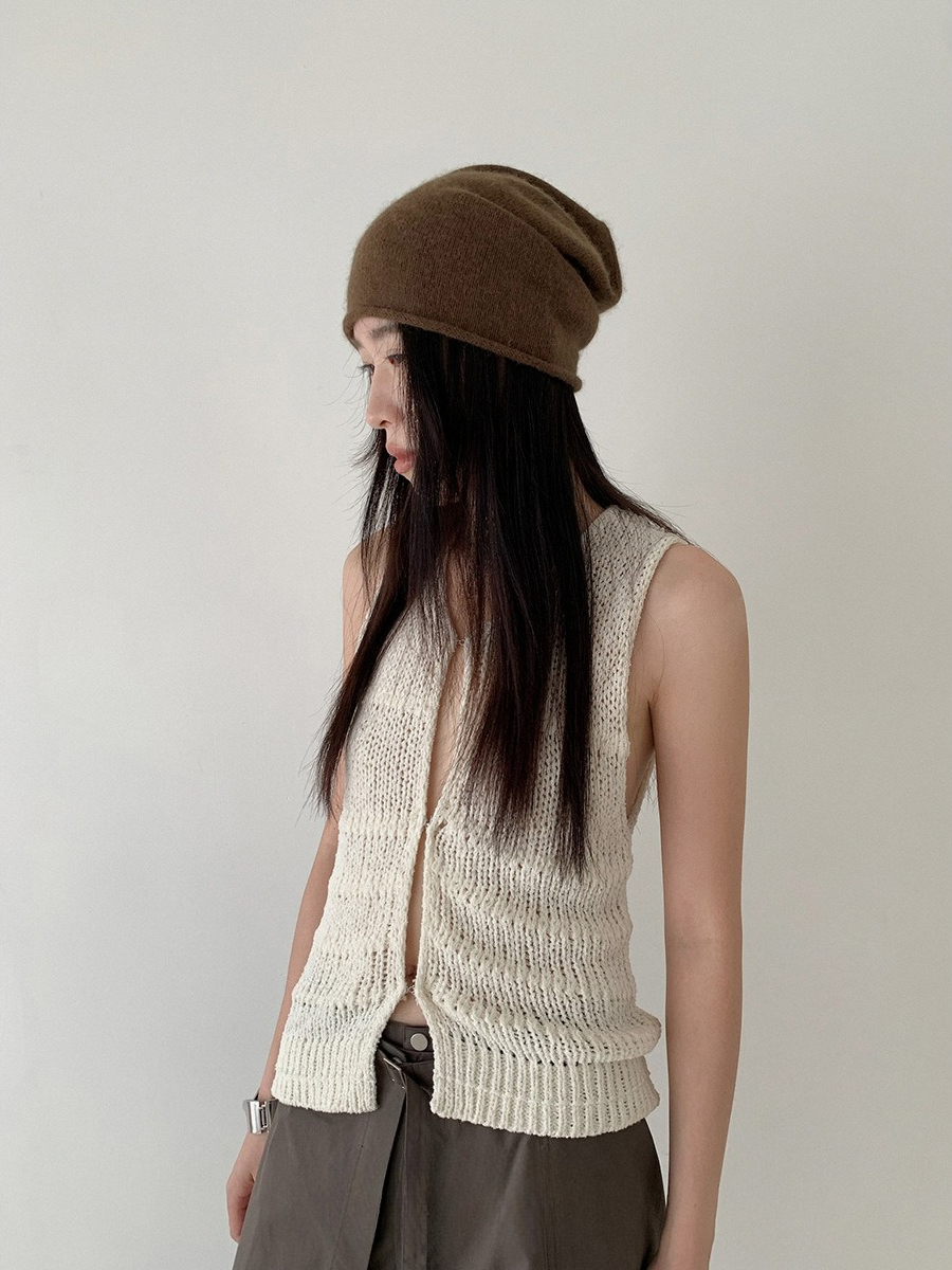 立体的な編み地と程よい透け感のある、表情豊かなミックスメッシュニットベスト。