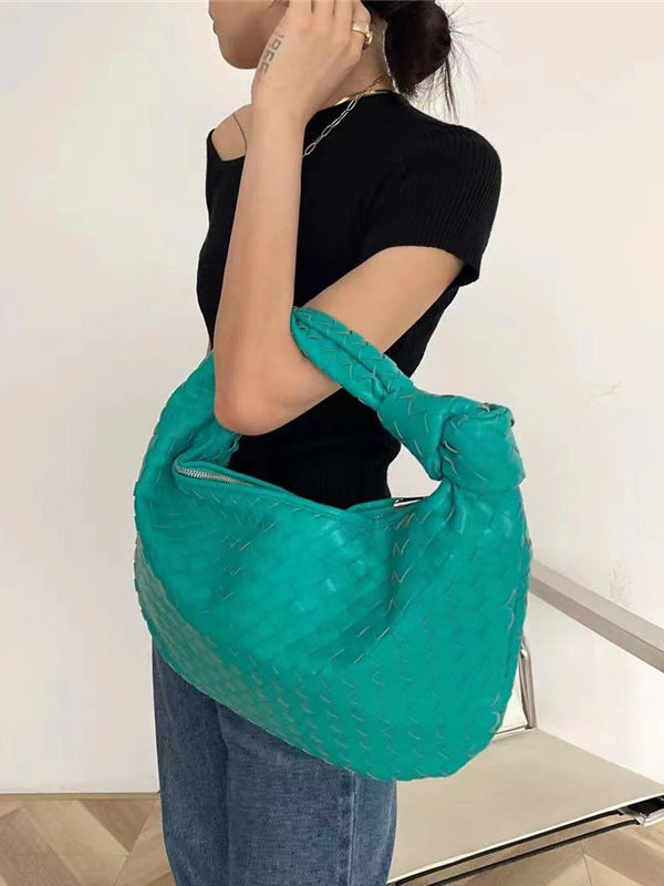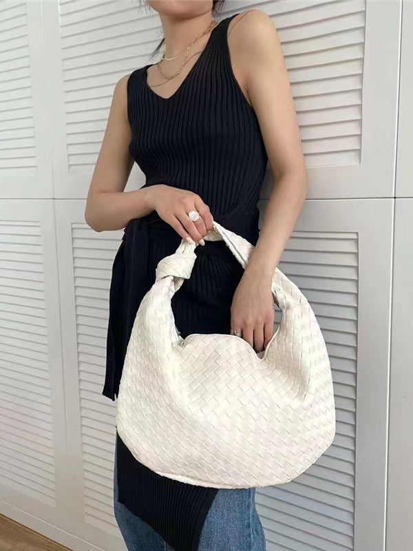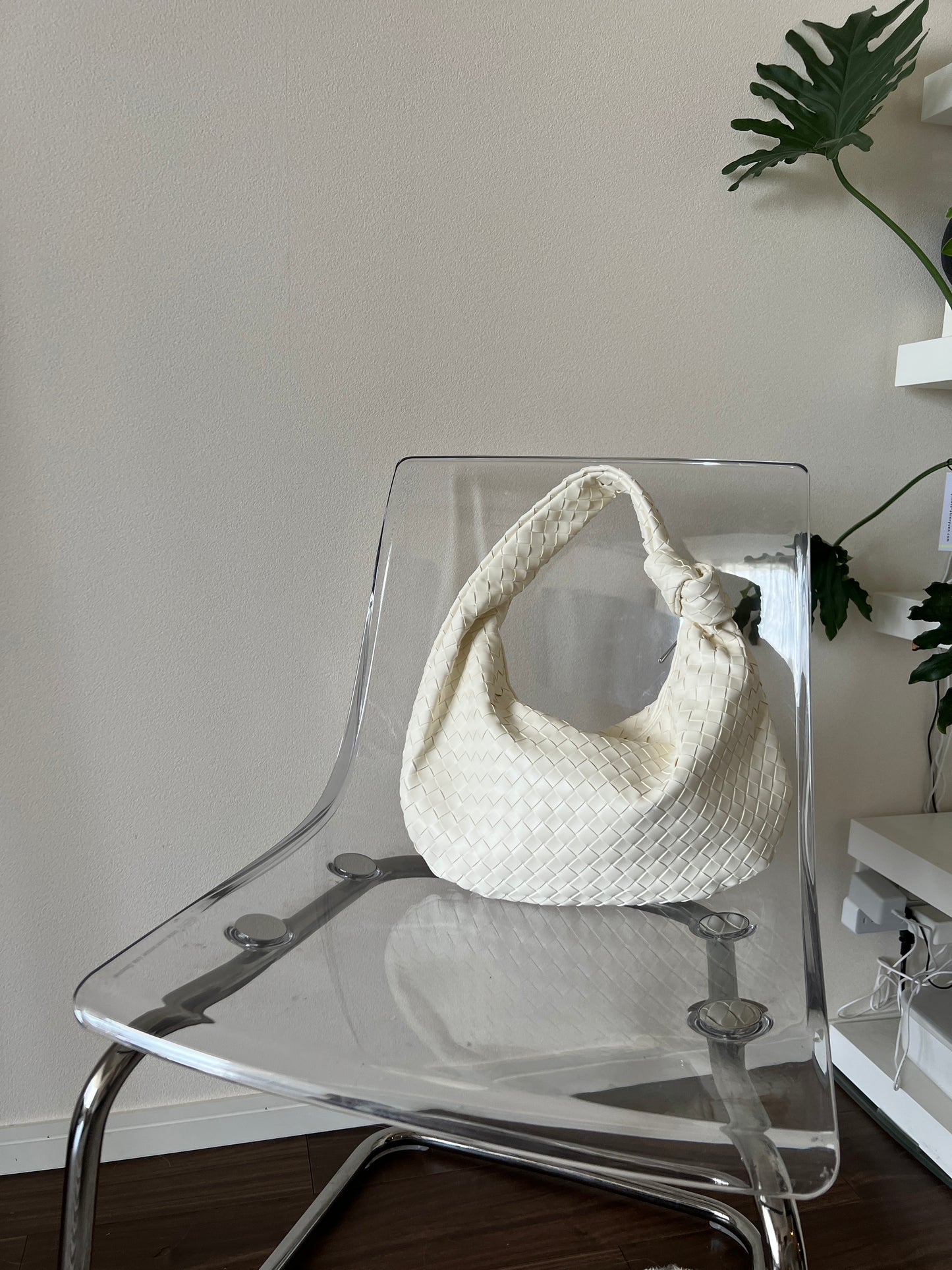 トレンド感のある持ち手の結び目デザインと細やかな編み込み生地がポイント。