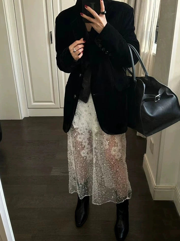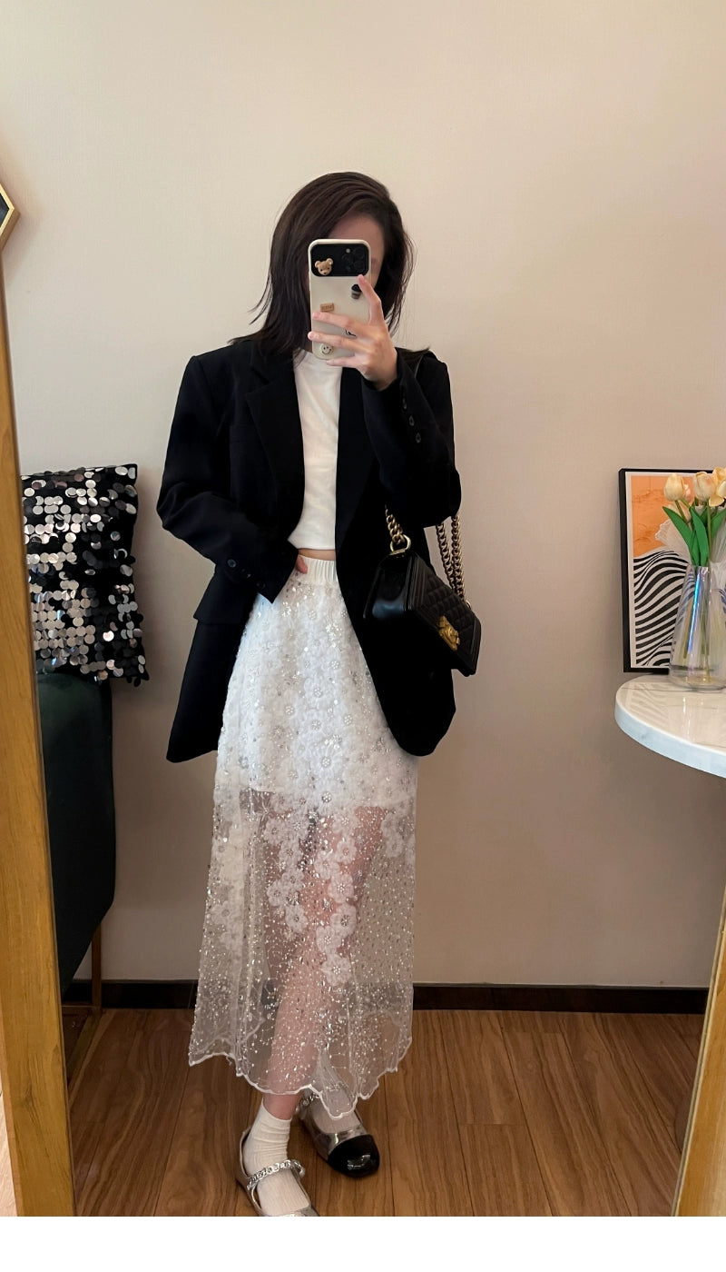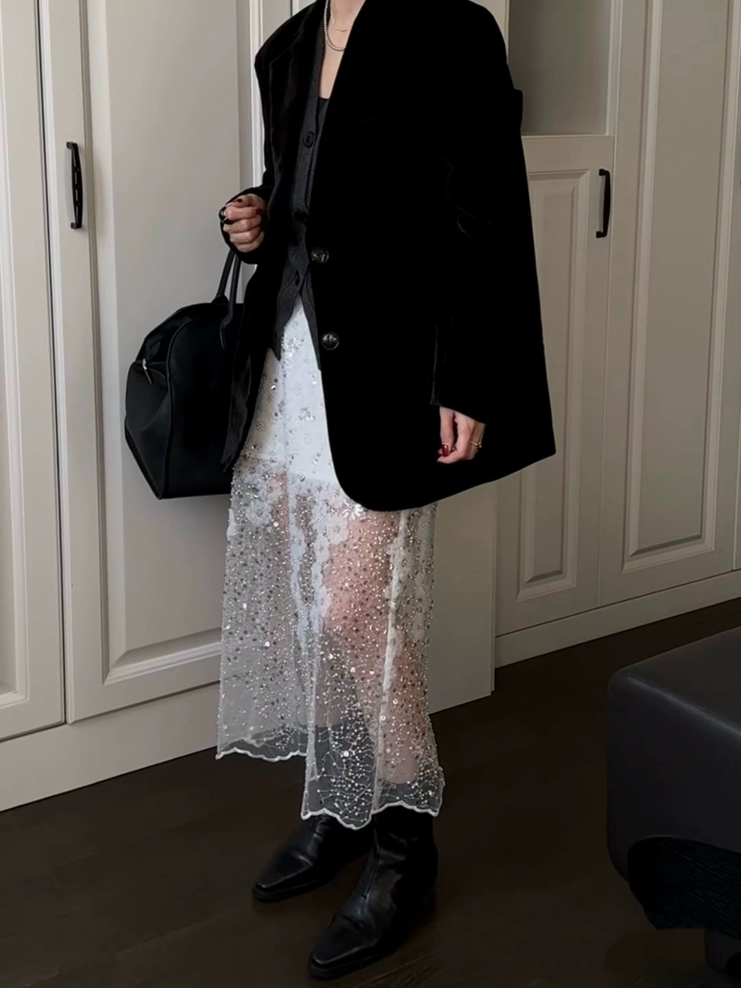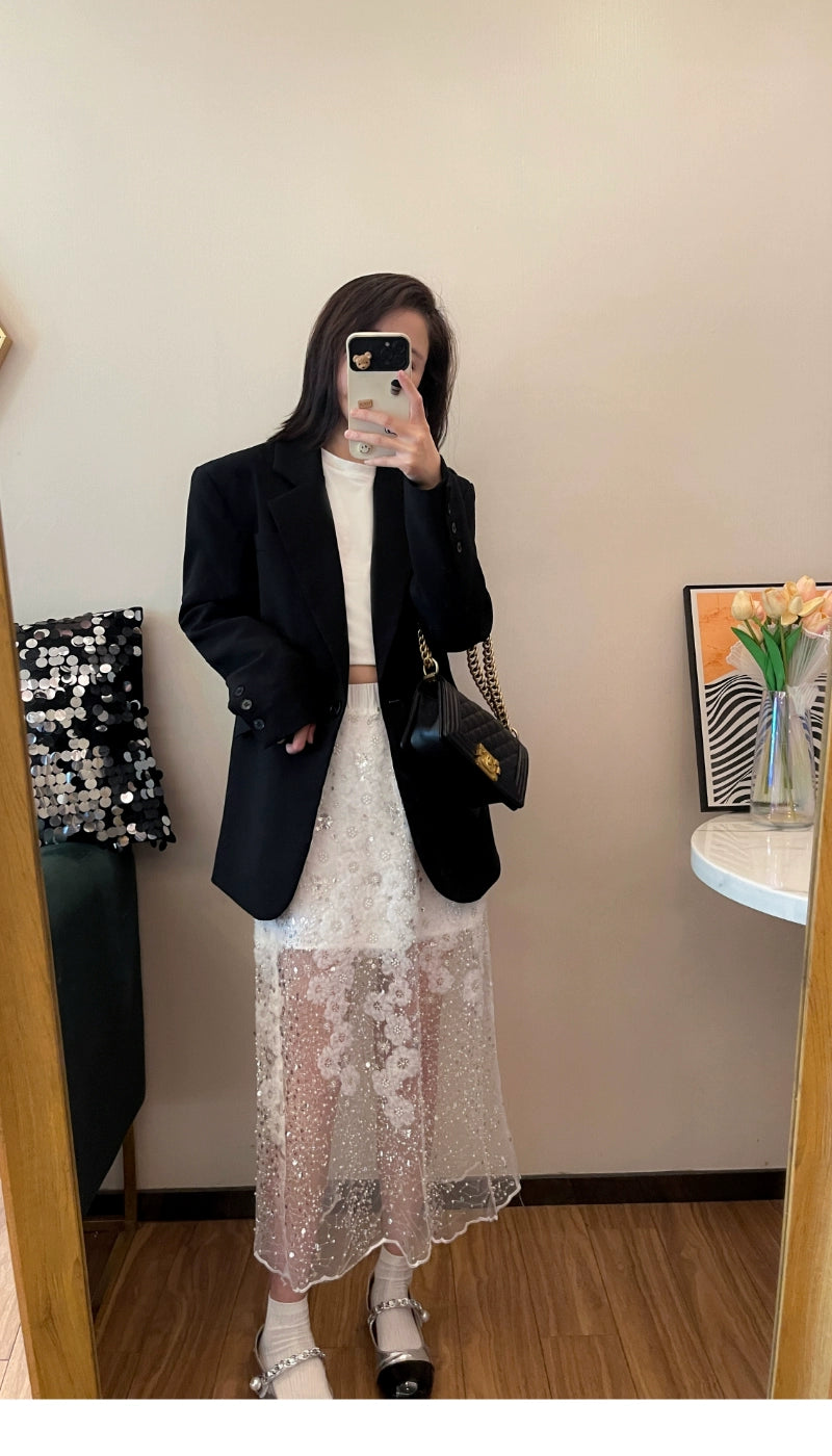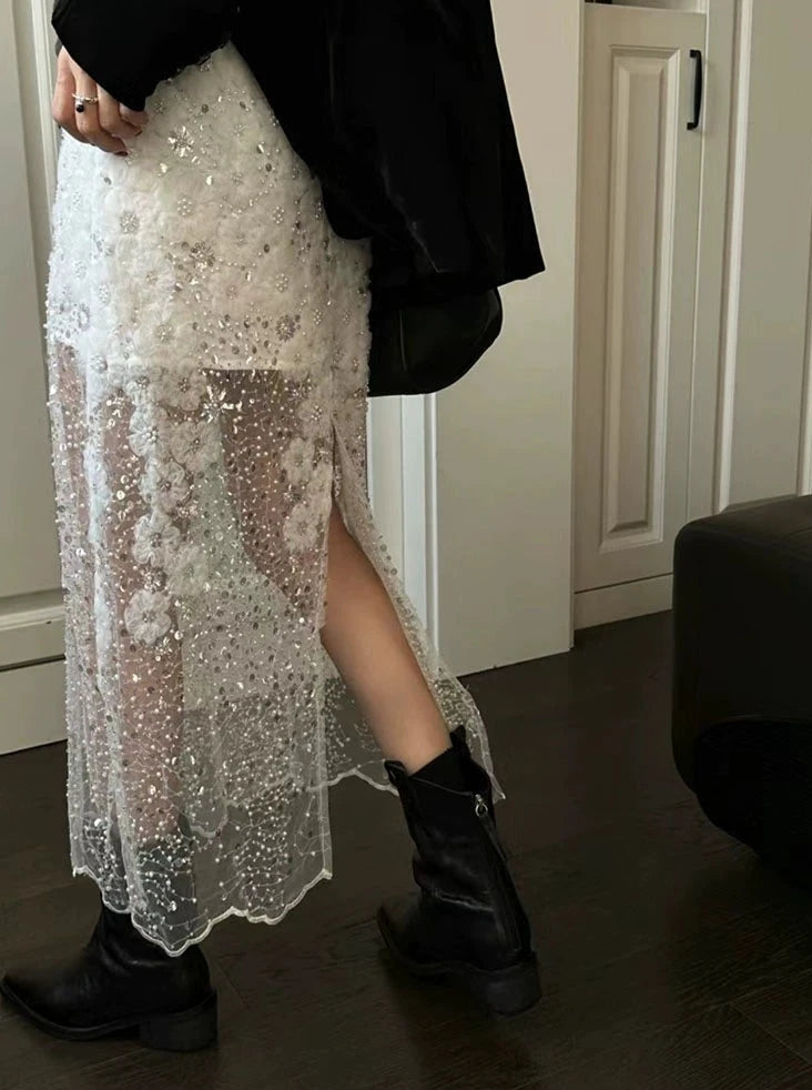フラワー刺繍にスパンコールとビーズを一面に散りばめたリュクスなタイトスカート。