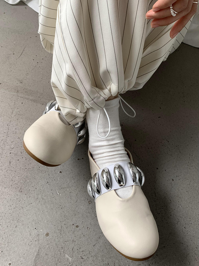 フロントのゴム部分にメタルビジューを施した存在感のあるフラットシューズ。コロンとした形のバレエシューズがビジューの存在感を和らげてくれます。テーパードパンツの足元に合わせてカジュアルな印象に。