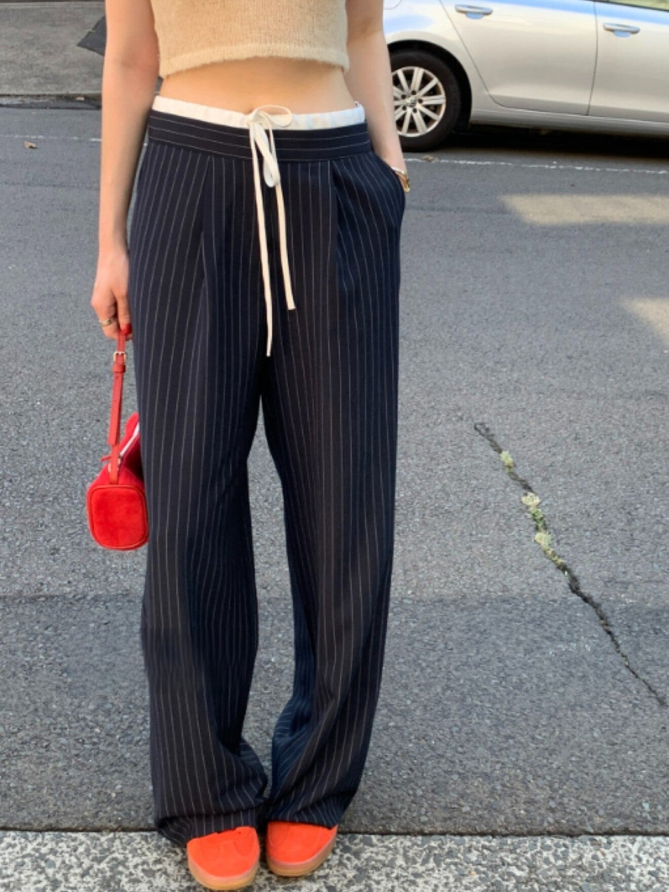 トレンドのダブルウエストパンツ。細目のピンストライプが大人な雰囲気を演出してくれます。ロゴTなどカジュアルなトップスとスニーカーで合わせてルーズな着こなしが海外スナップのような雰囲気に。