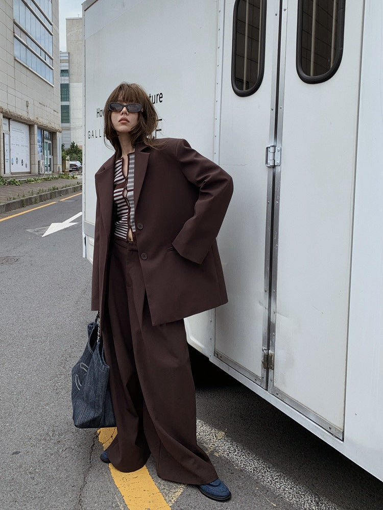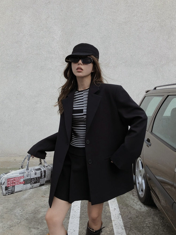 シルエット感のあるオールドマネールックのジャケットは、レーヨン・スパンデックスを混合したポリエステル繊維で作られており、生地は柔らかく滑らか。両サイドの肩パッドが肩のカーブをサポートしてくれます。