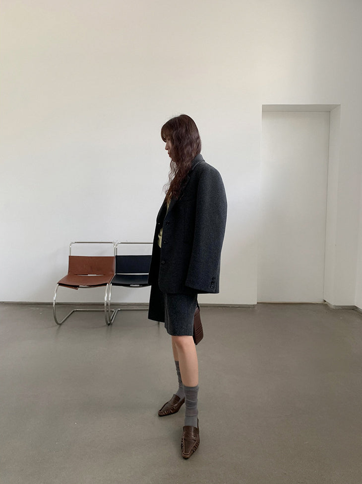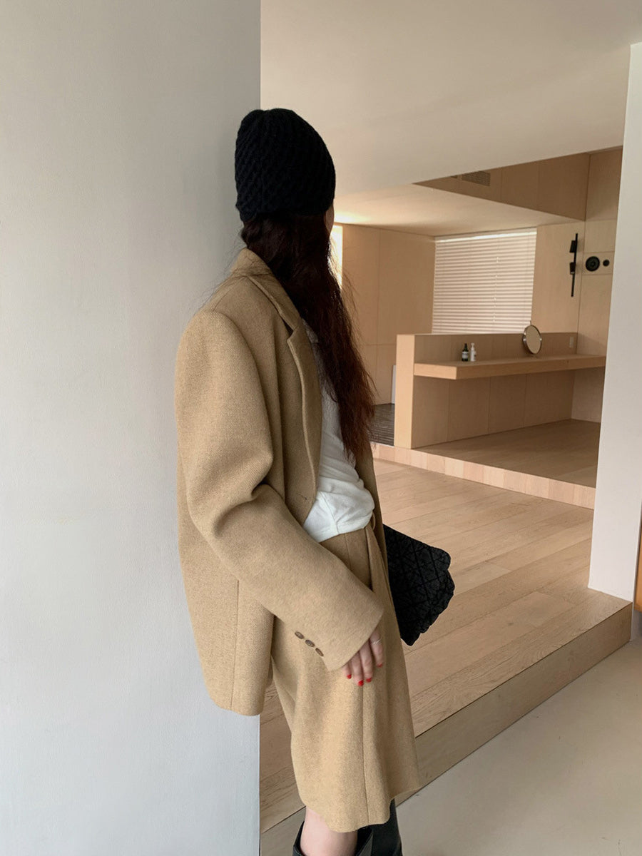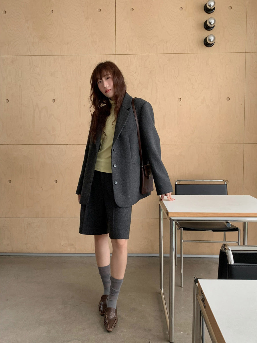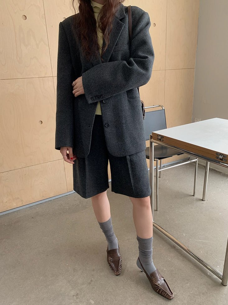 タックウールハーフパンツ(SETUP可) 1754とセットアップ可能。シングルボタンウールダディージャケット(SETUP可) 1753は、オーバーサイズで女性らしさを引き立たせる定番のダディジャケットです。上品なベージュと濃いめのグレーのカラーバリエーションで、ハンサムさと女性らしさのバランスが抜群です。同生地のハーフパンツとセットアップで着用すると、さらにオシャレなスタイリングが可能です。