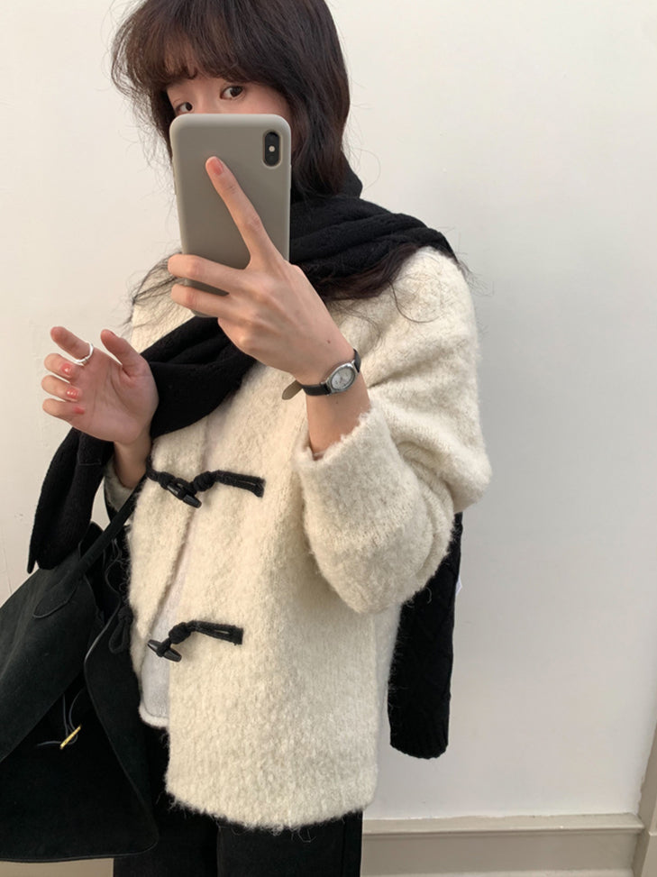 トグルボタンがポイントのウール混のコーディガン。カーディガンであるもののコートのようなデザインでこれからのシーズンアウターの中に忍ばせたいアイテム。ふんわりとした素材が女性らしい印象でカジュアルになりすぎないデザインがポイント。
