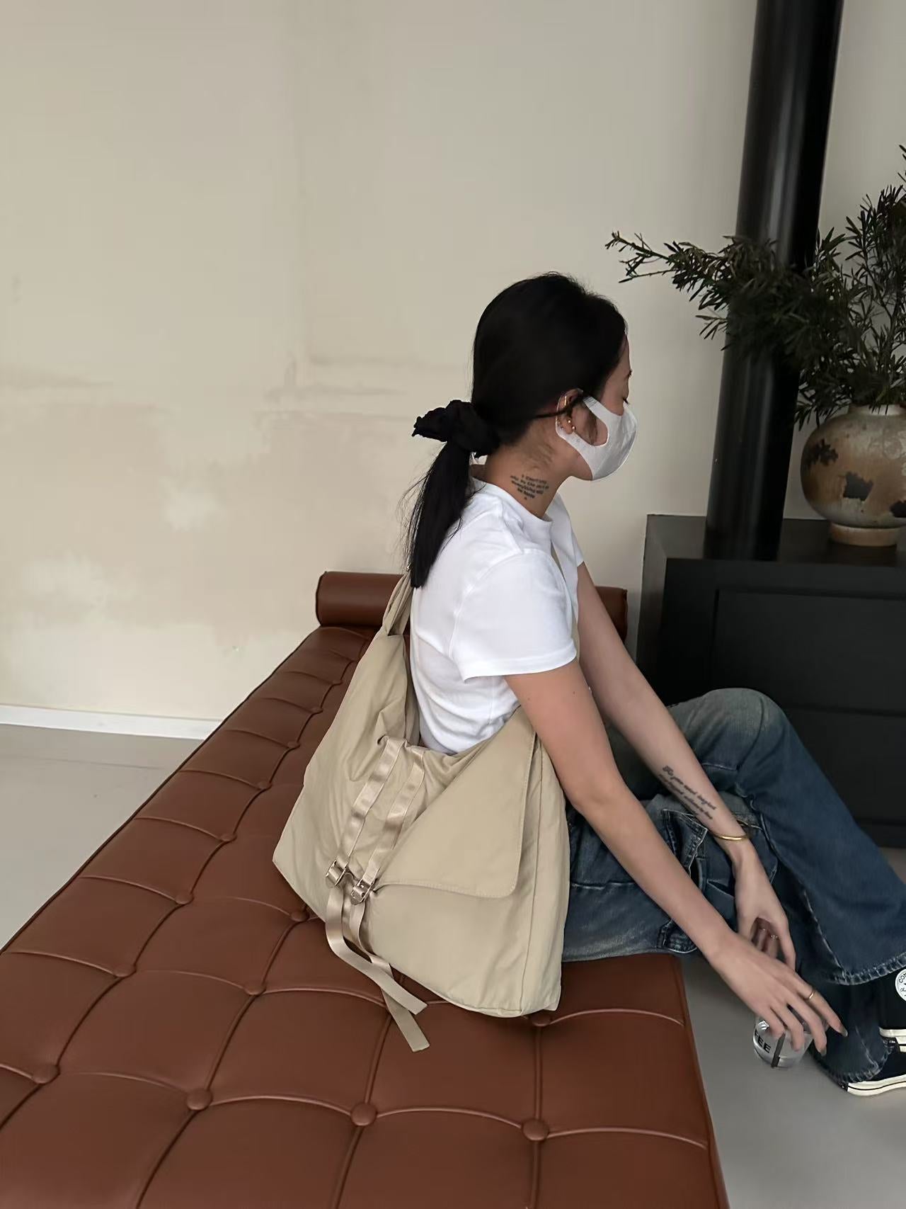 お洋服に馴染みの良いくたっとした生地感と軽量素材でストレスフリーに使用可能。