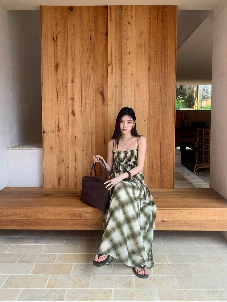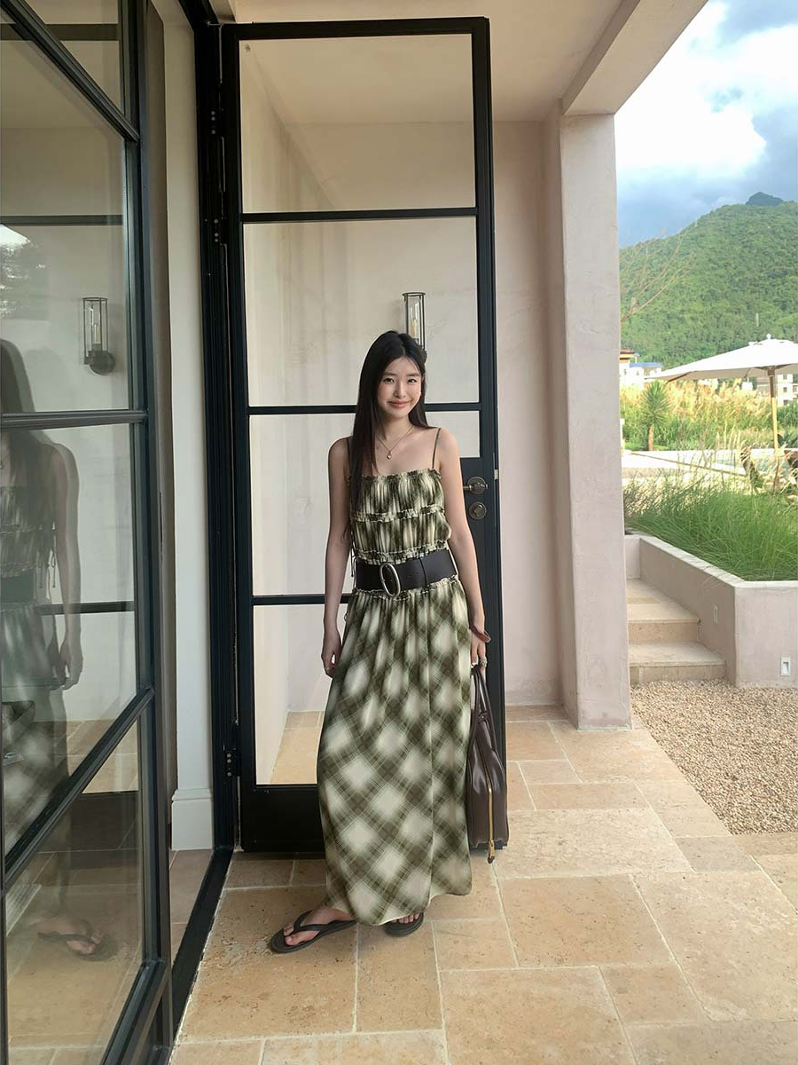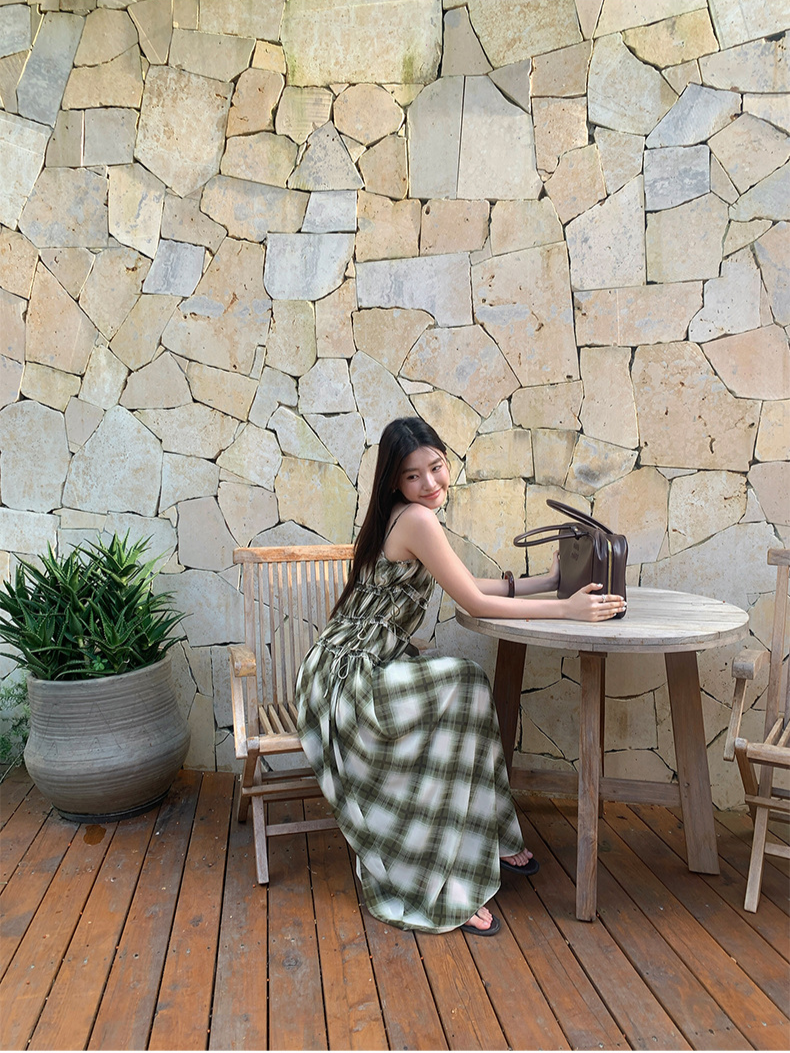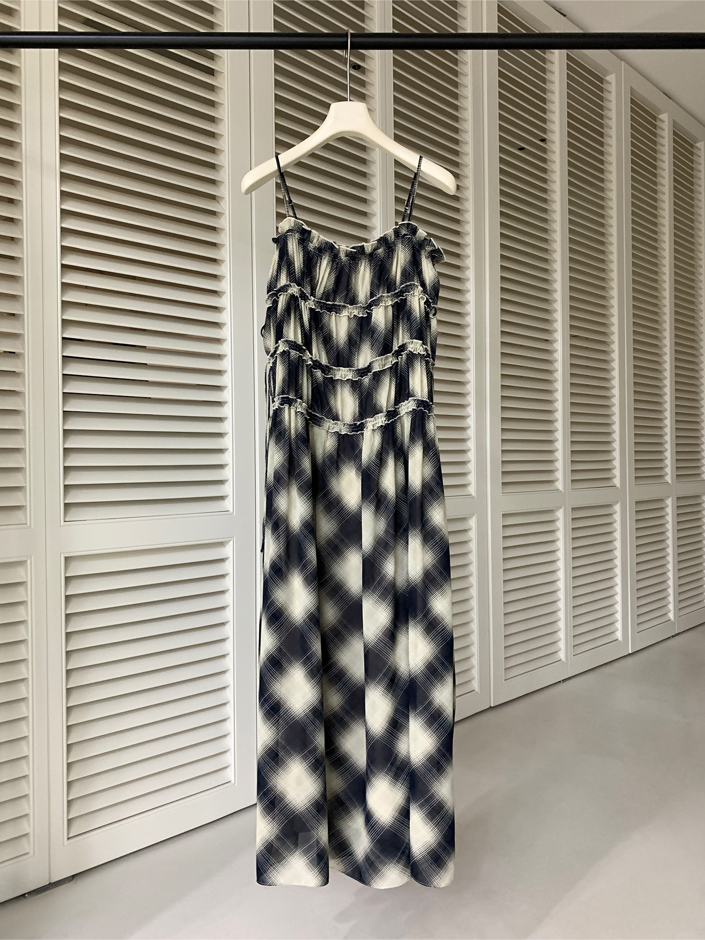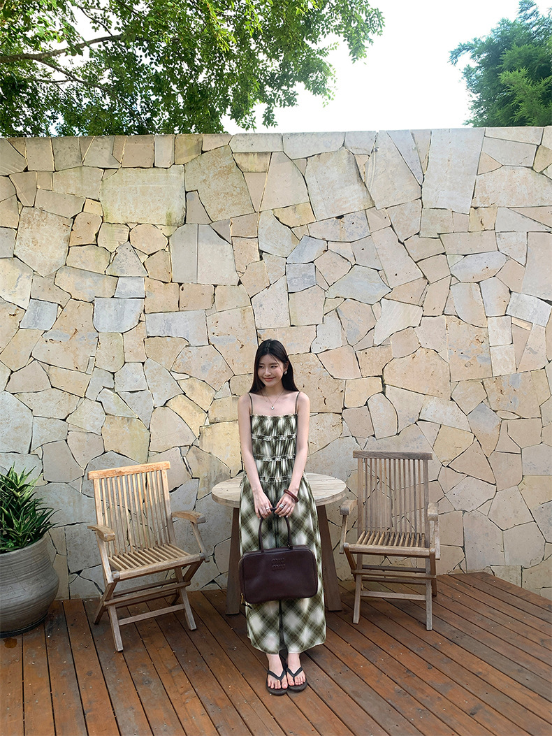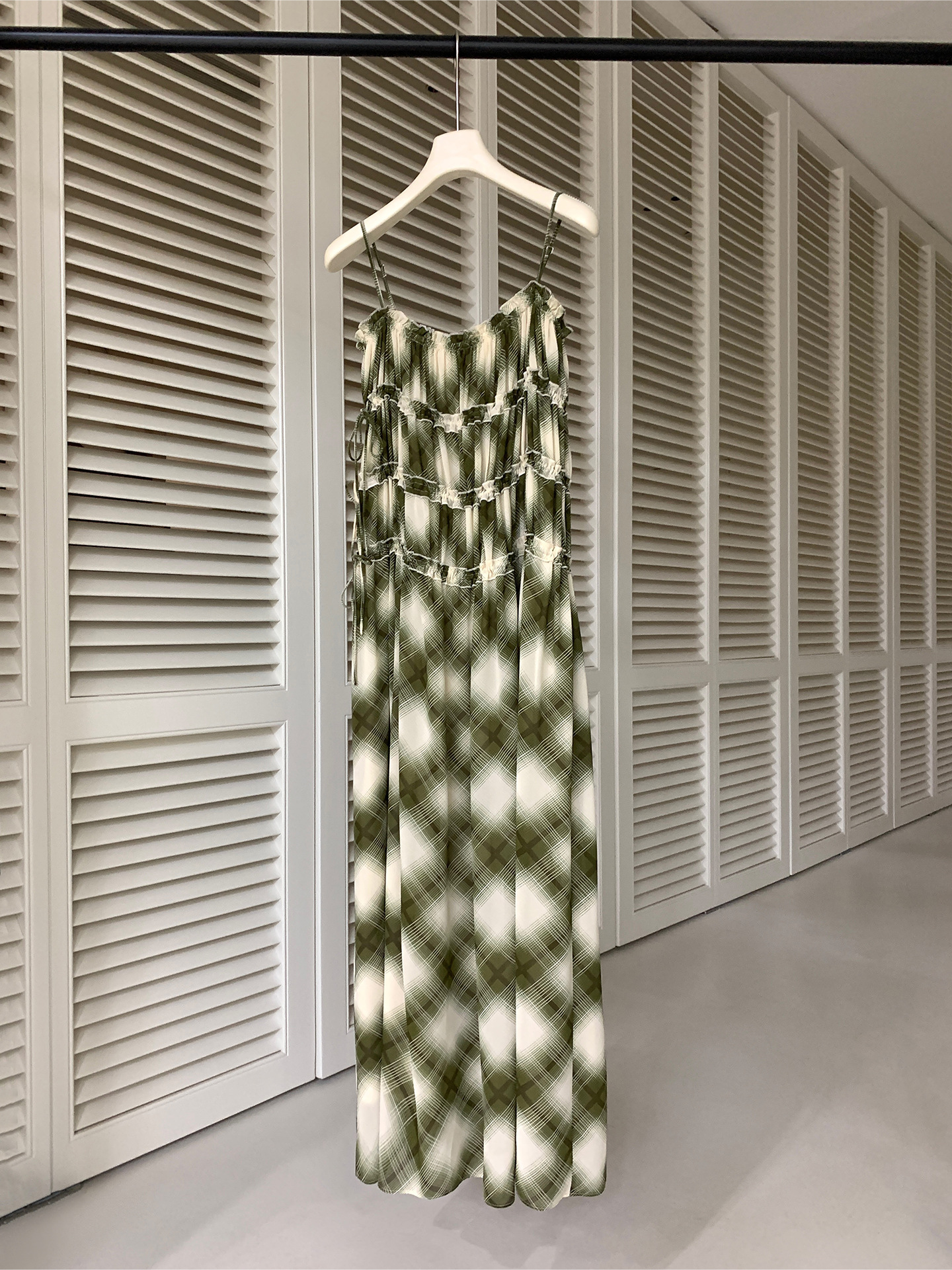 存在感のある大ぶりなブロックチェックが印象的なキャミソールワンピース。胸元のギャザーデザインが、スタイルアップ効果のあるラインシルエットを演出。シンプルなTシャツやシアーシャツとのレイヤードもおすすめ。リゾートやデイリー使いにもぴったりの一着。