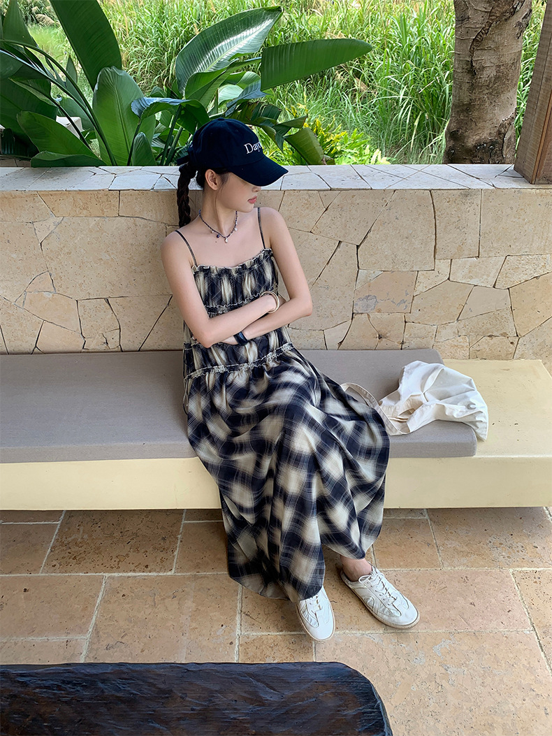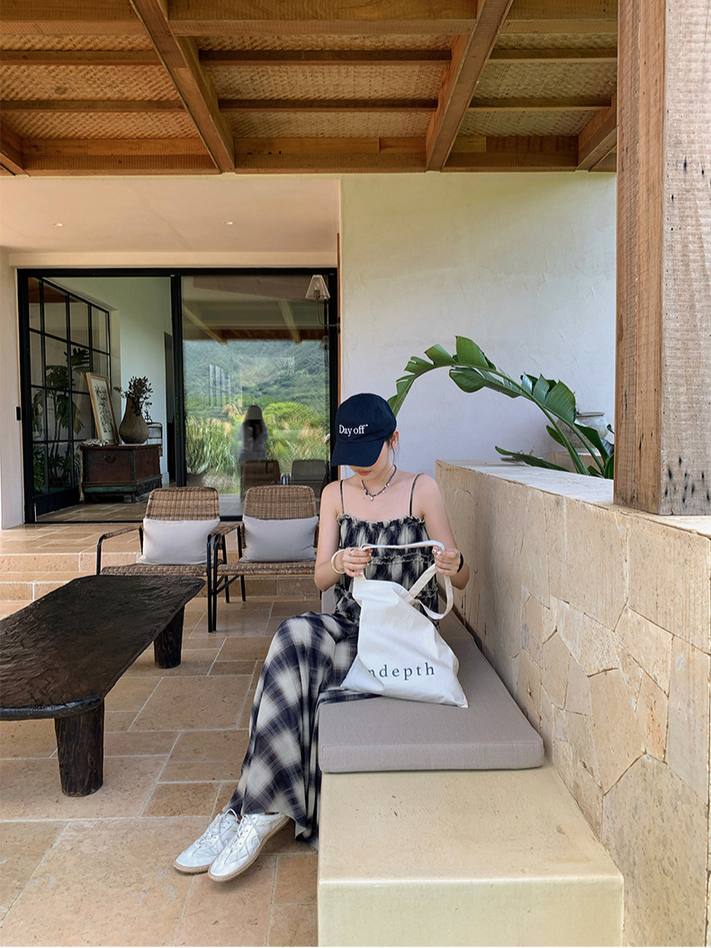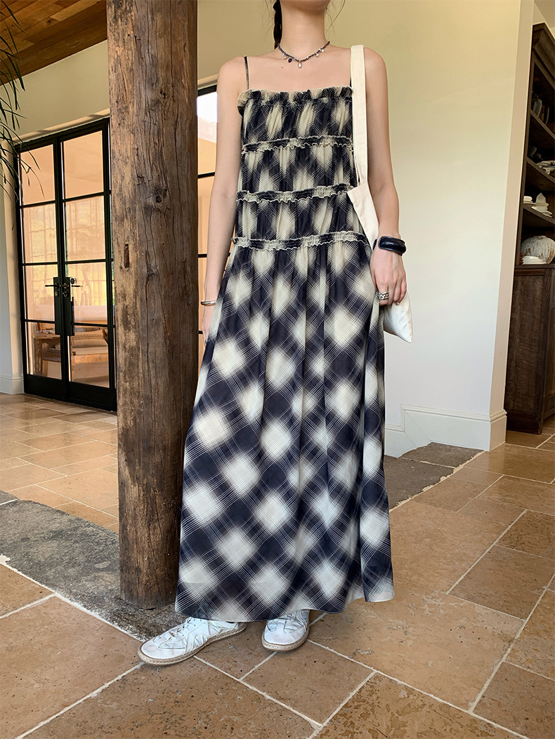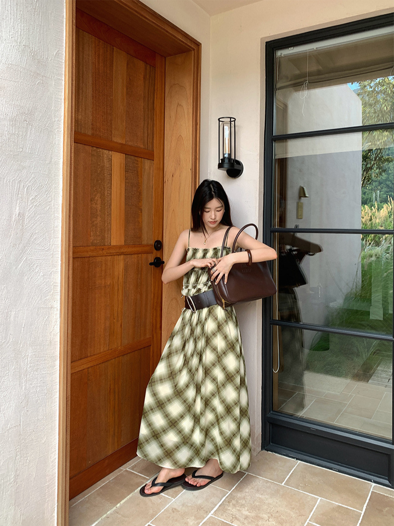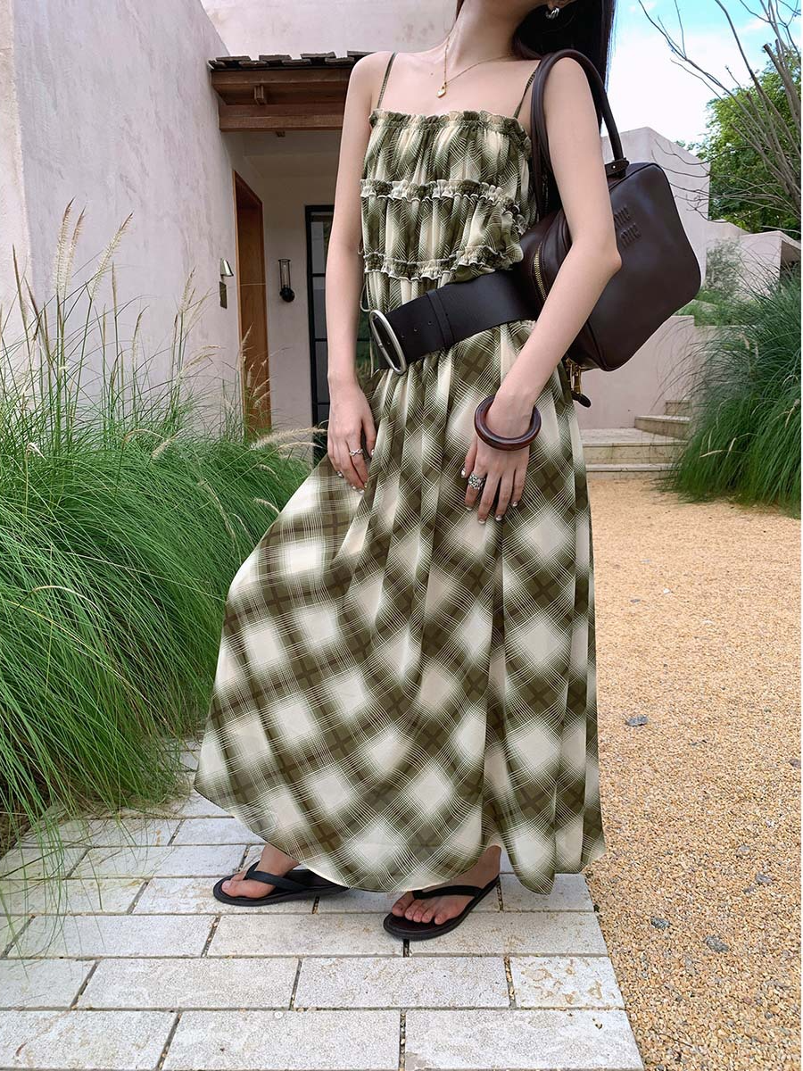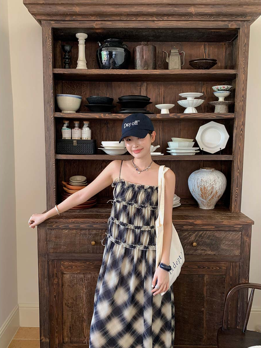 存在感のある大ぶりなブロックチェックが印象的なキャミソールワンピース。胸元のギャザーデザインが、スタイルアップ効果のあるラインシルエットを演出。シンプルなTシャツやシアーシャツとのレイヤードもおすすめ。リゾートやデイリー使いにもぴったりの一着。