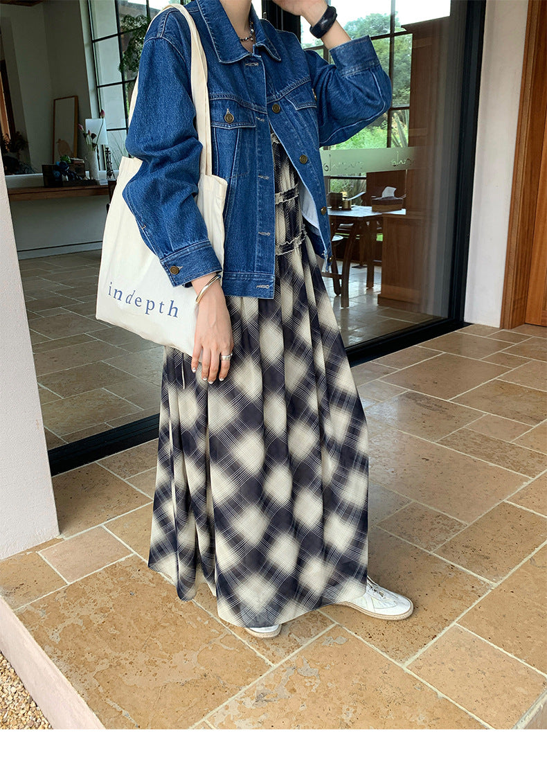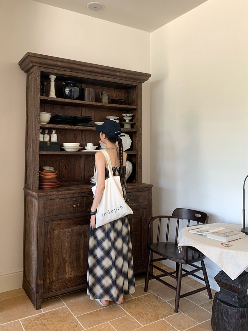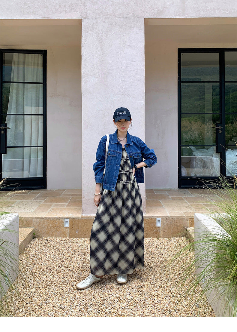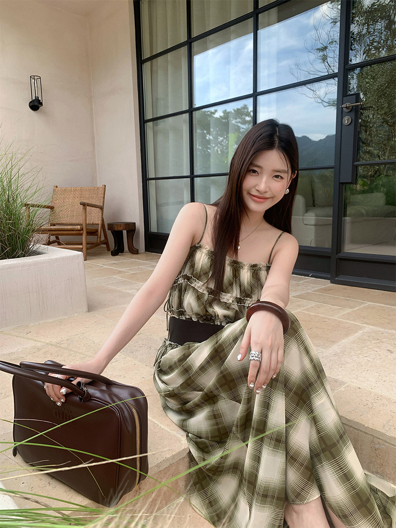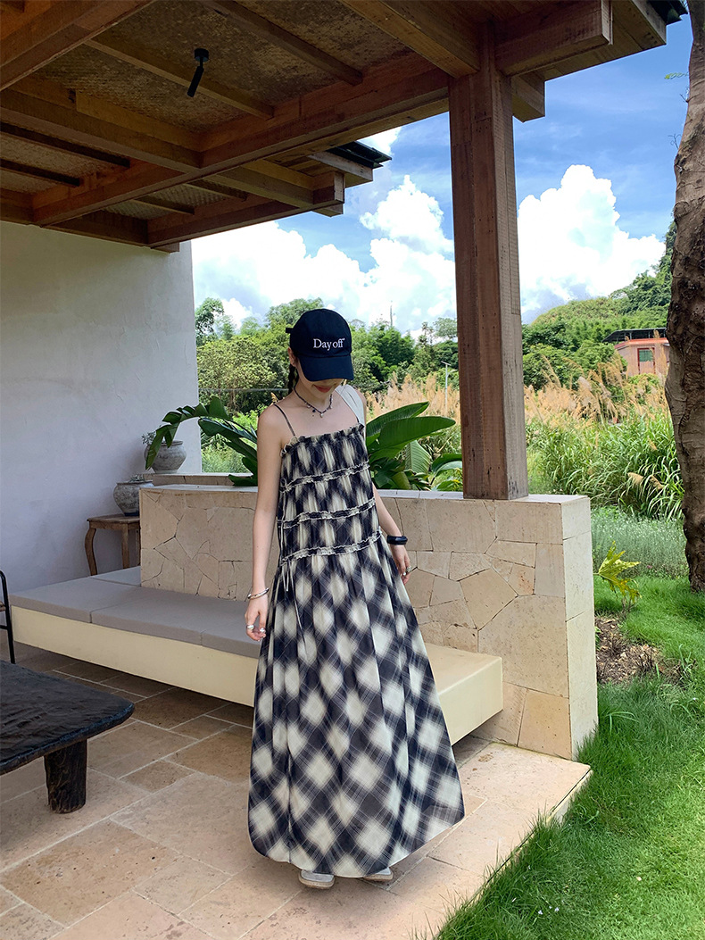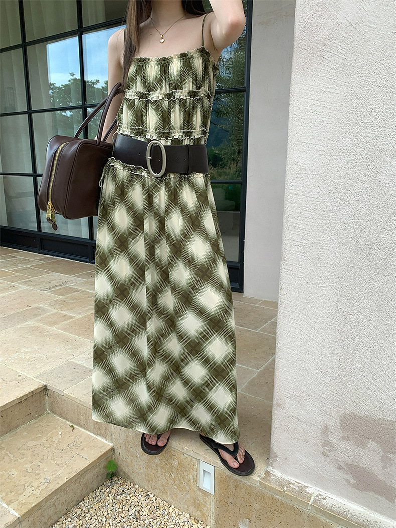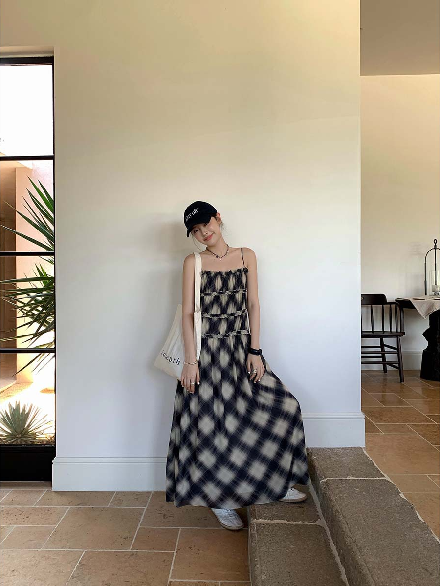 存在感のある大ぶりなブロックチェックが印象的なキャミソールワンピース。胸元のギャザーデザインが、スタイルアップ効果のあるラインシルエットを演出。シンプルなTシャツやシアーシャツとのレイヤードもおすすめ。リゾートやデイリー使いにもぴったりの一着。
