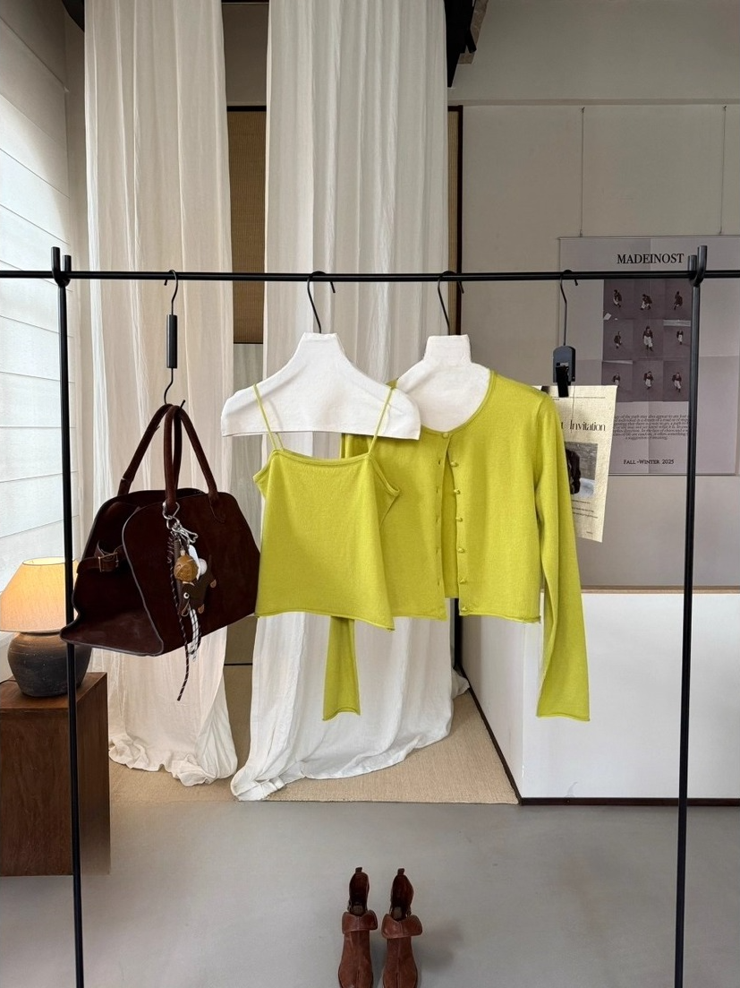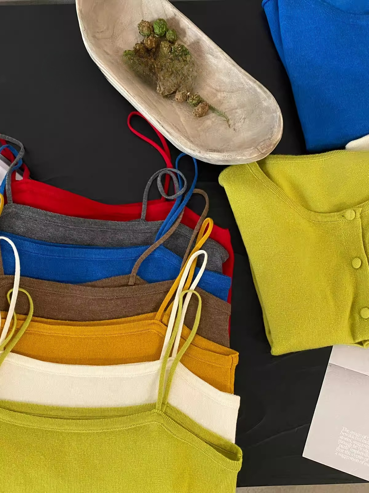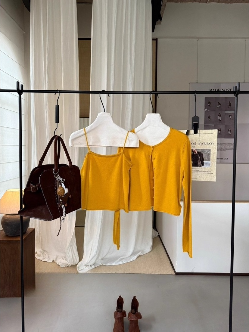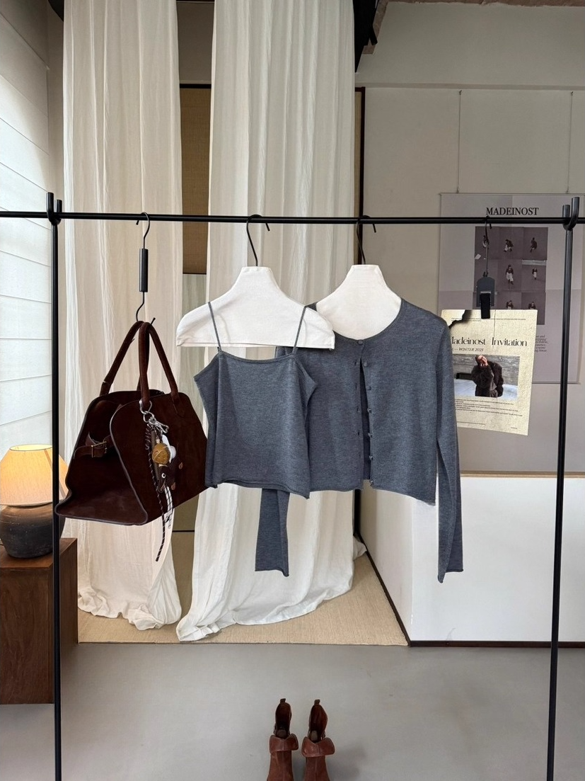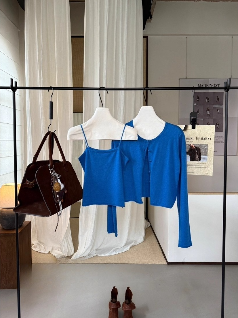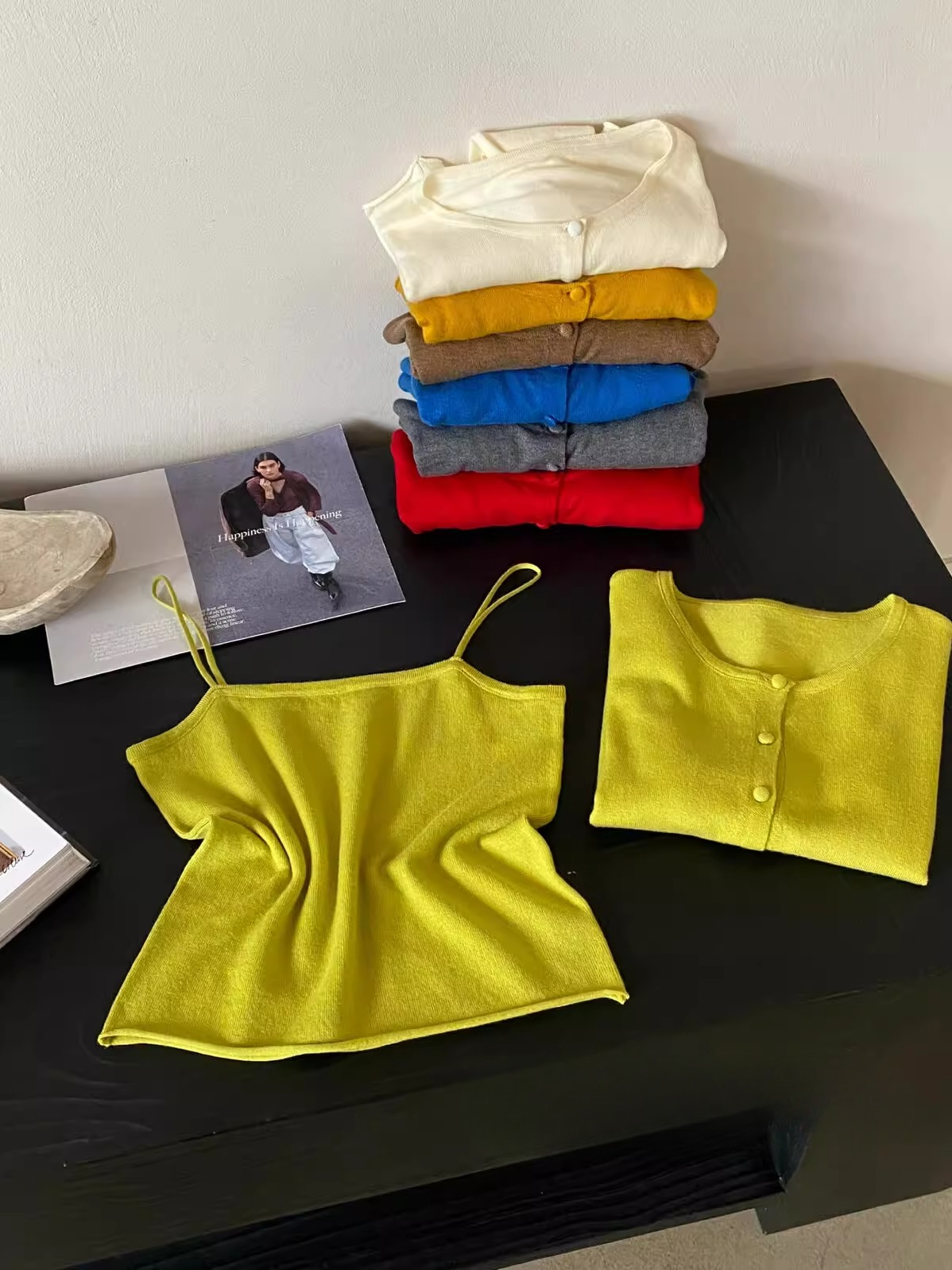 ループ紐でヘルシーな印象のキャミソールとショート丈ニットアンサンブル。