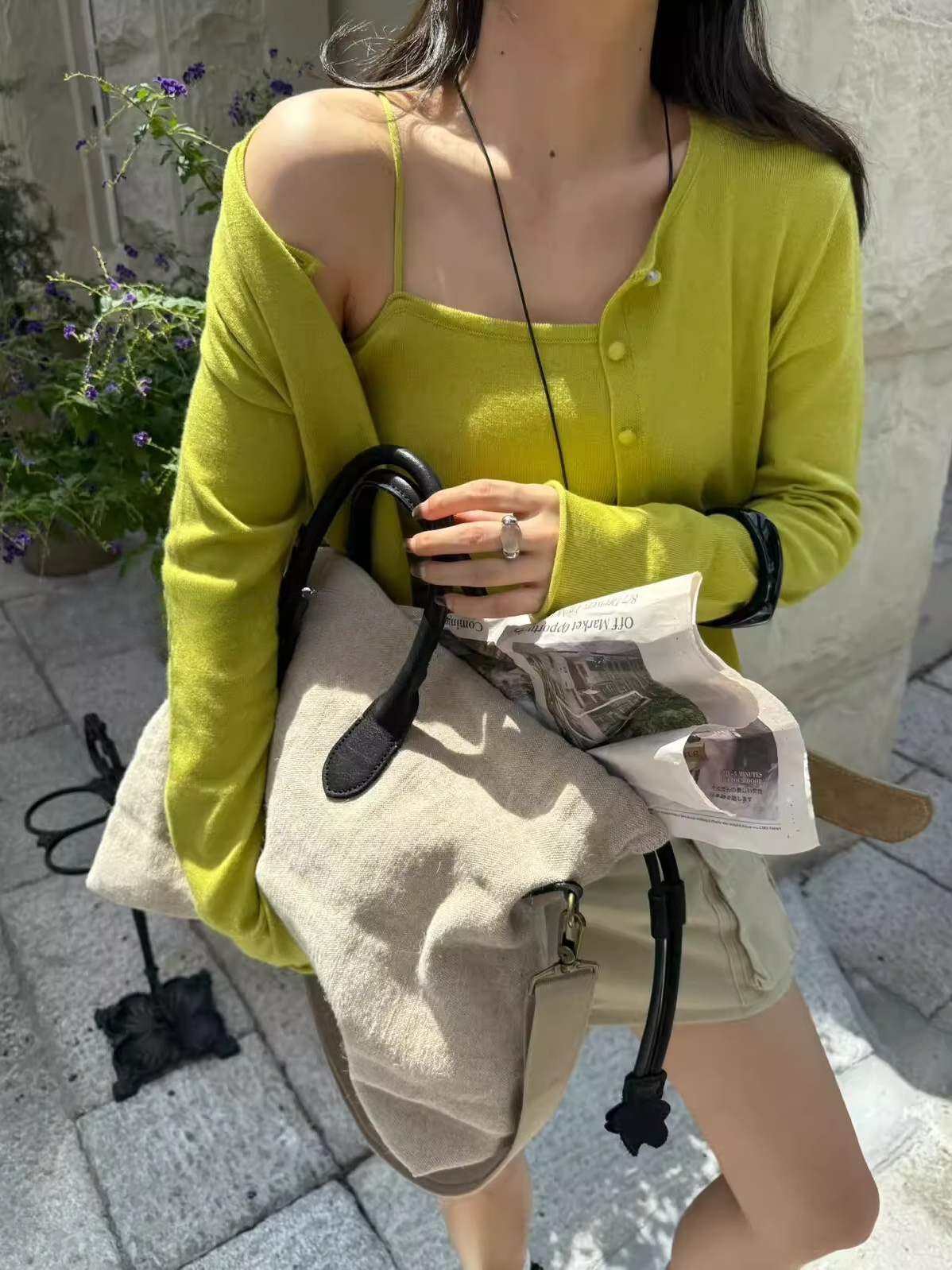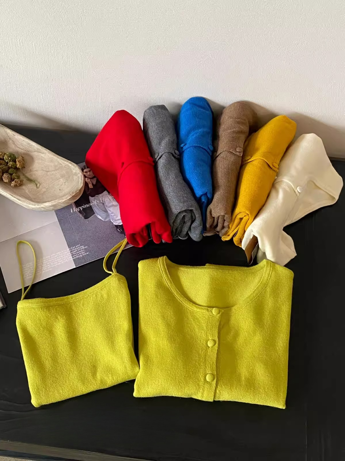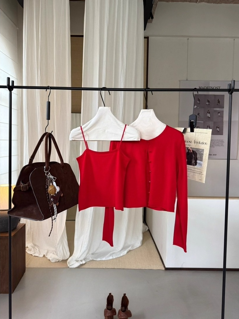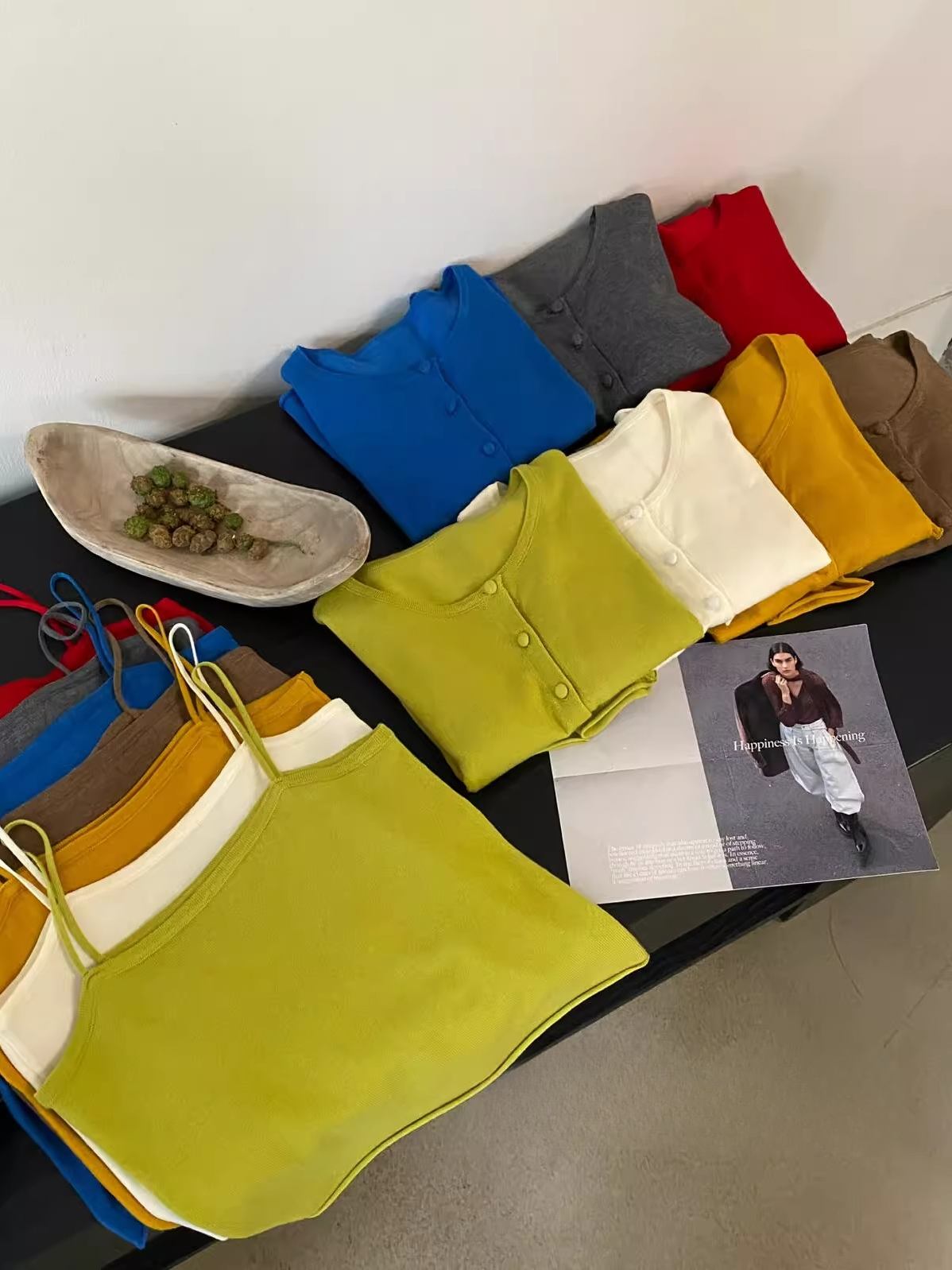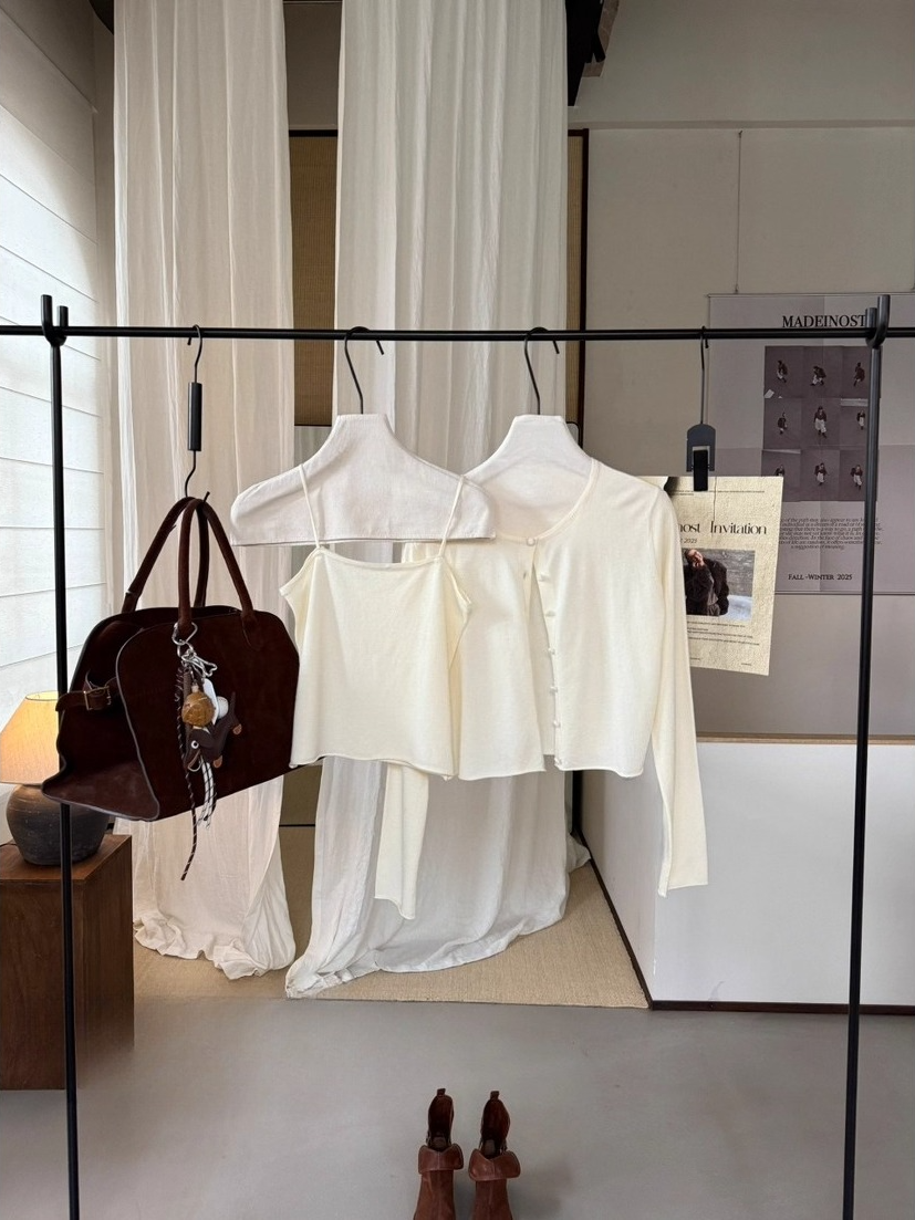 ループ紐でヘルシーな印象のキャミソールとショート丈ニットアンサンブル。