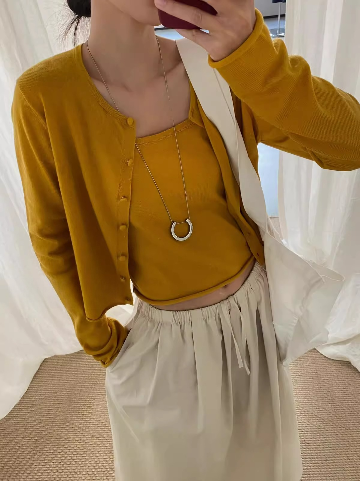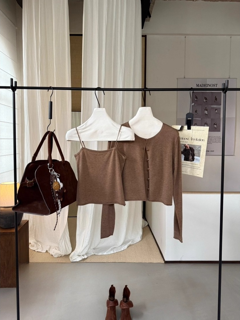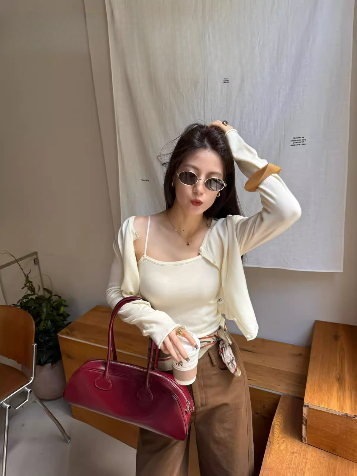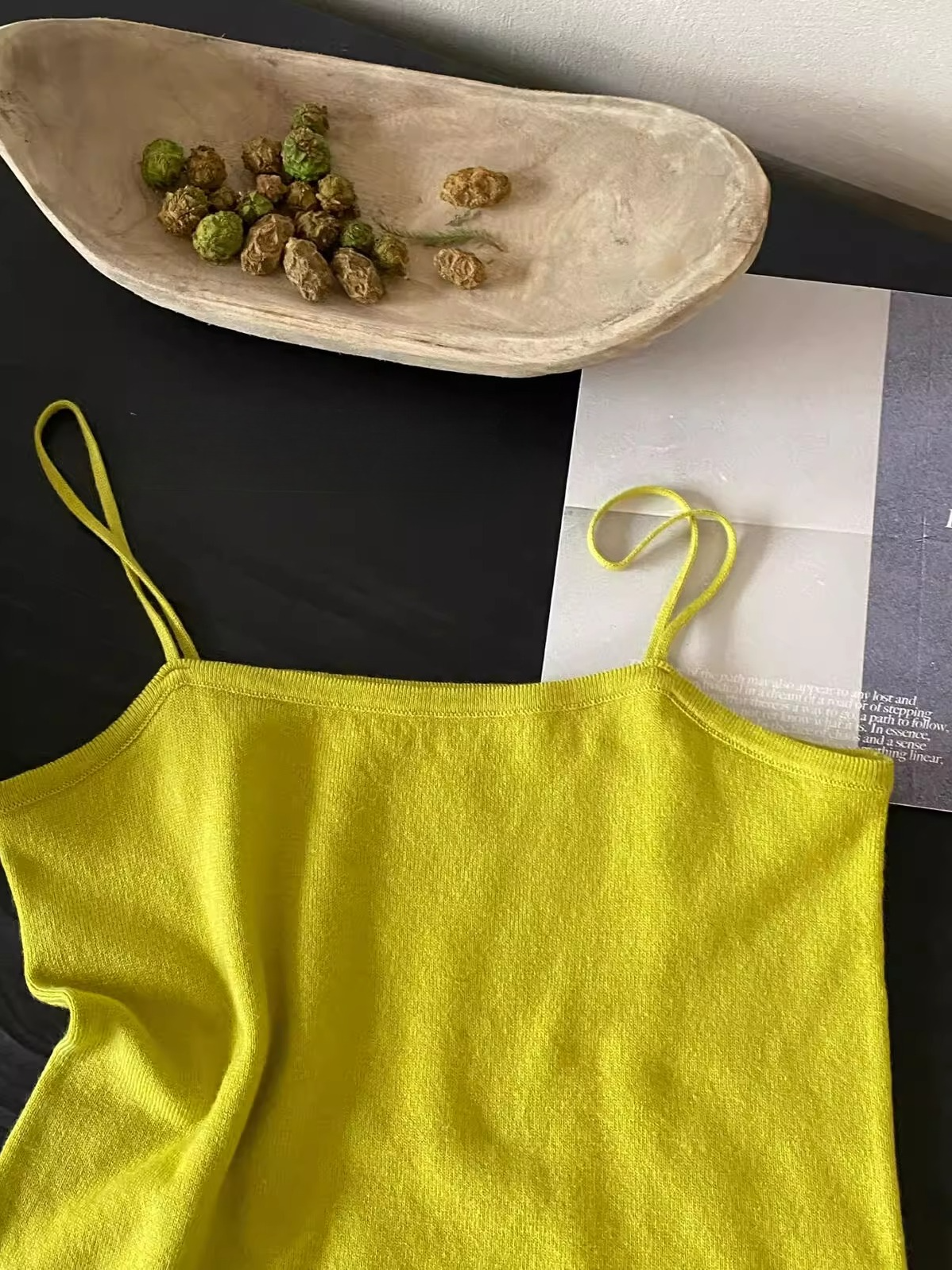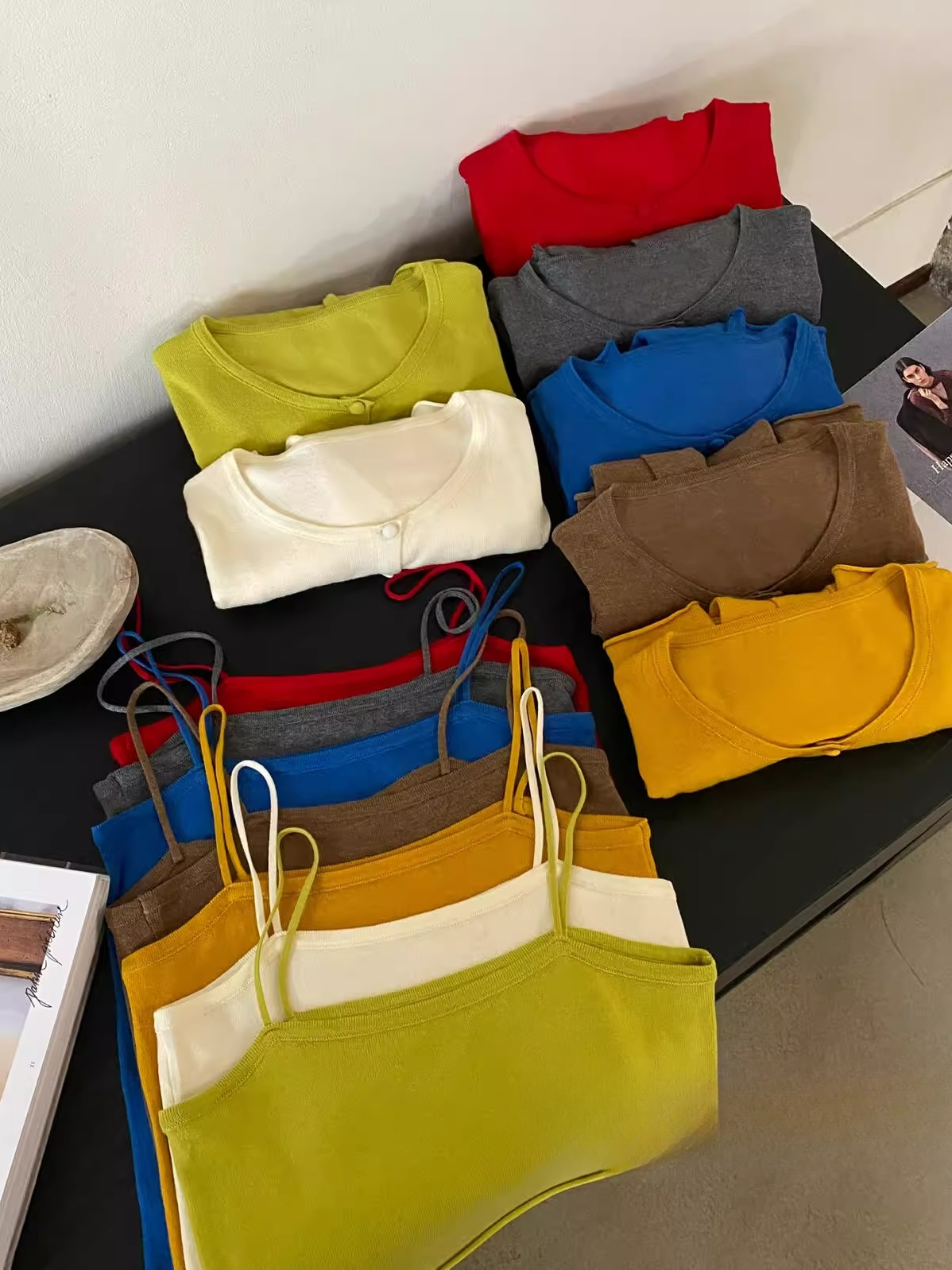 ループ紐でヘルシーな印象のキャミソールとショート丈ニットアンサンブル。