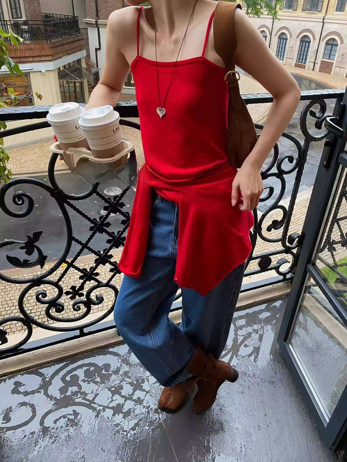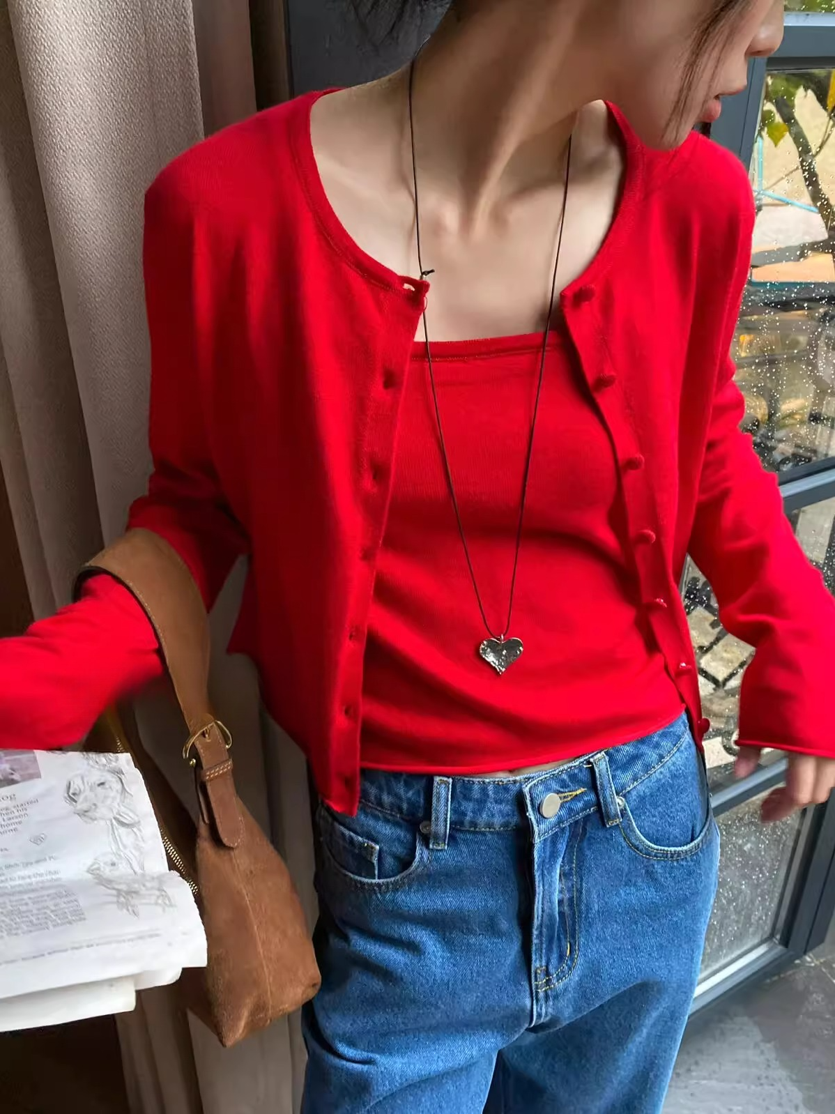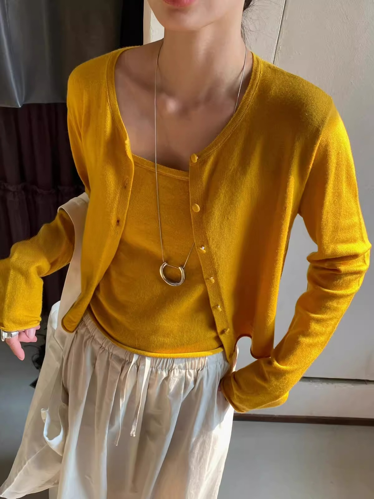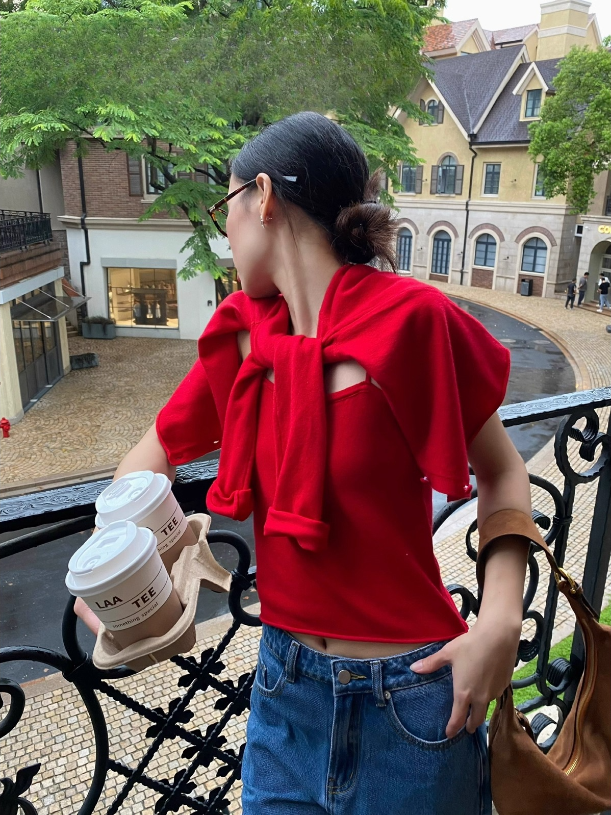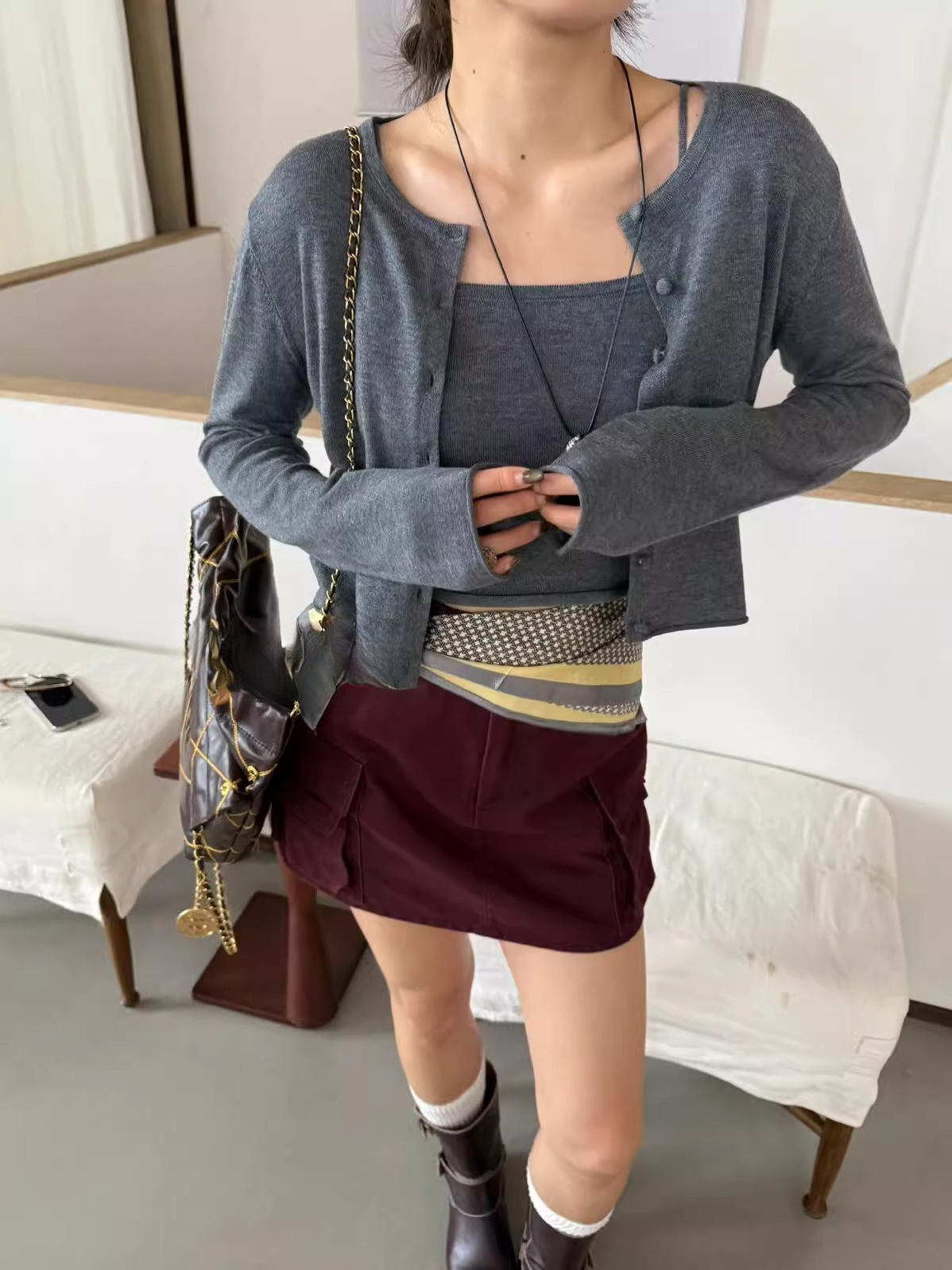 ループ紐でヘルシーな印象のキャミソールとショート丈ニットアンサンブル。
