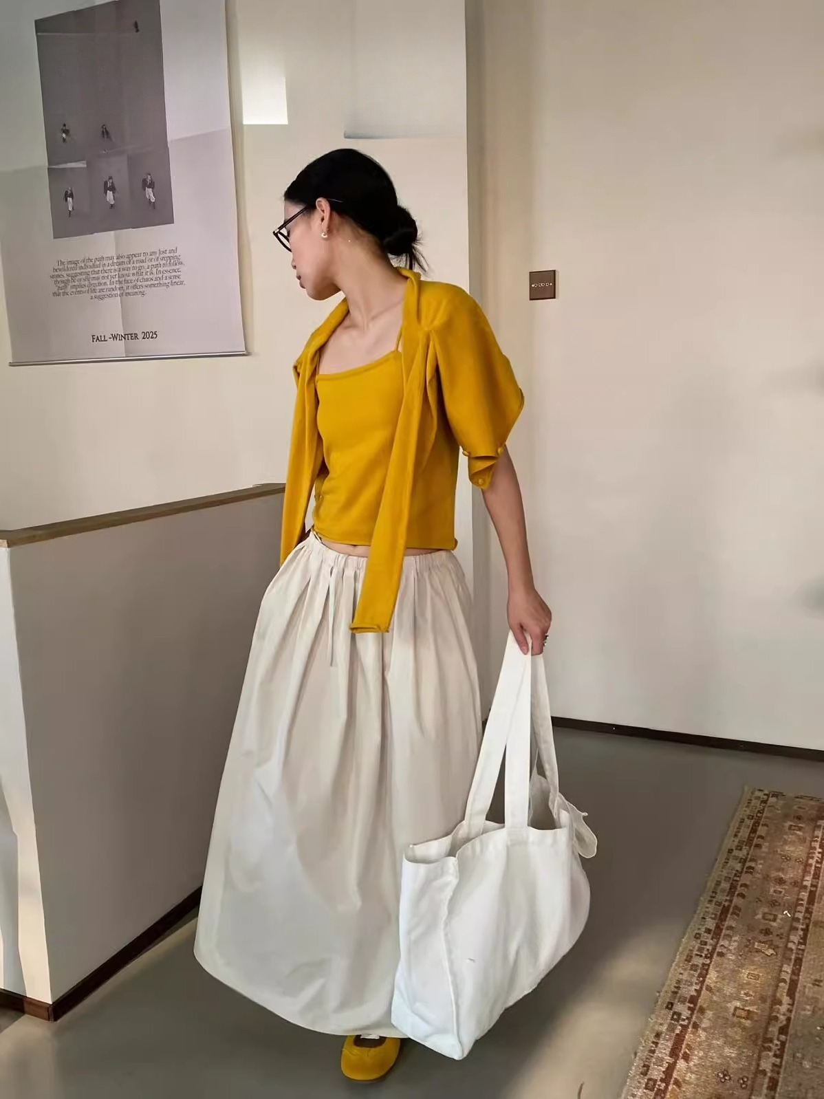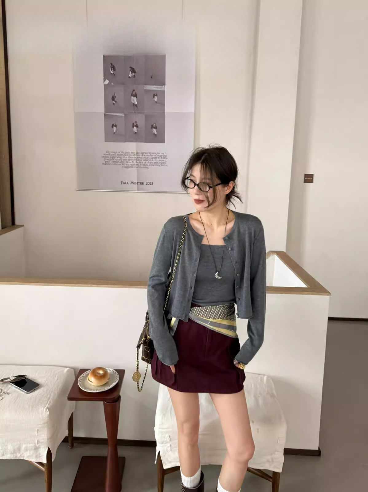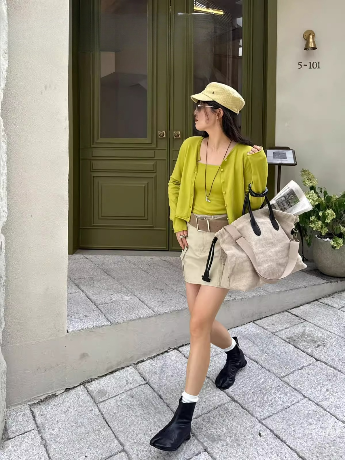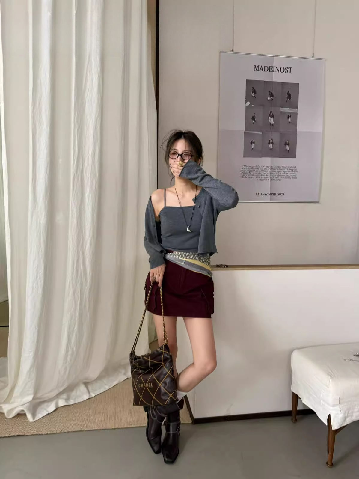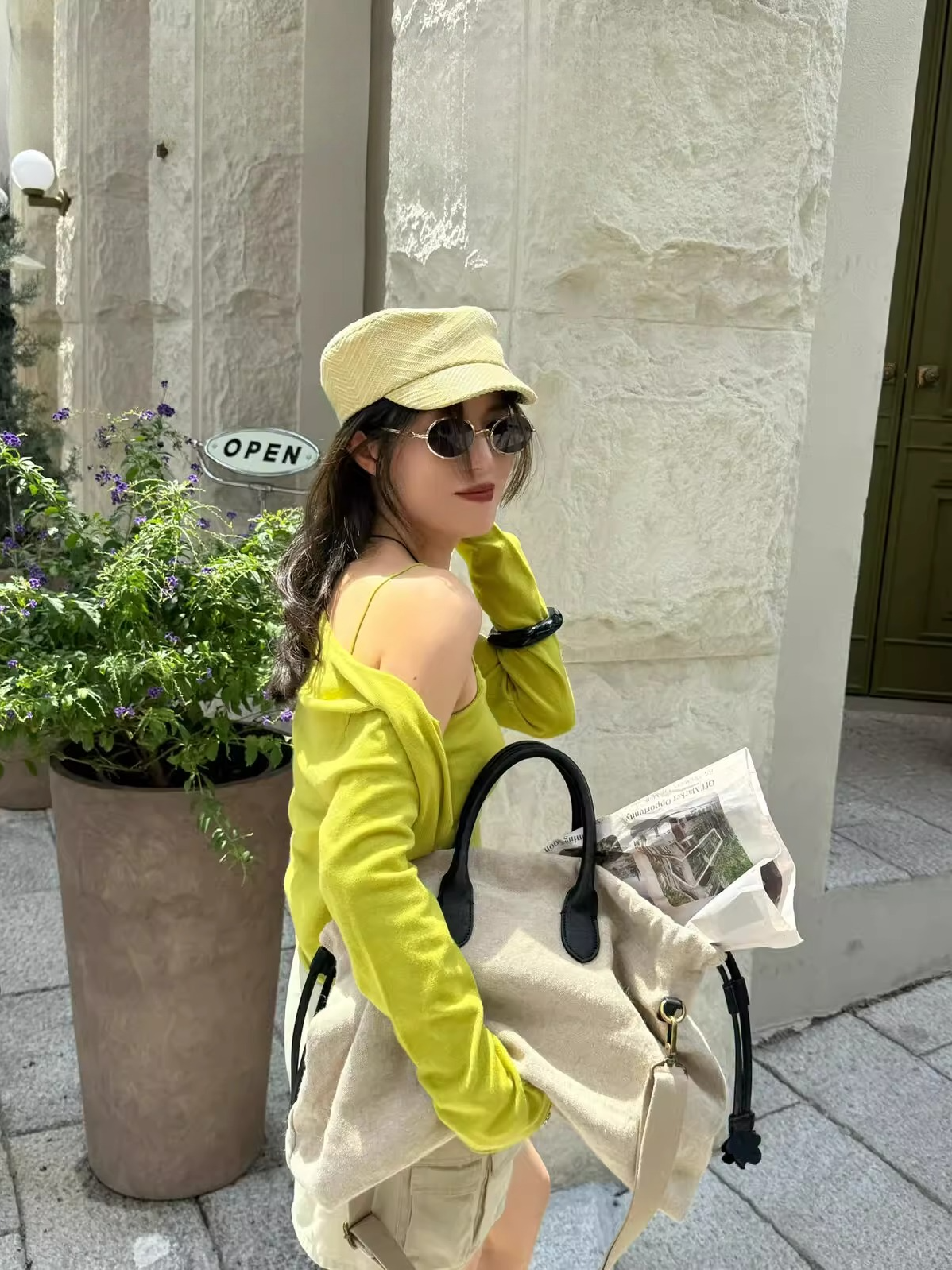 ループ紐でヘルシーな印象のキャミソールとショート丈ニットアンサンブル。