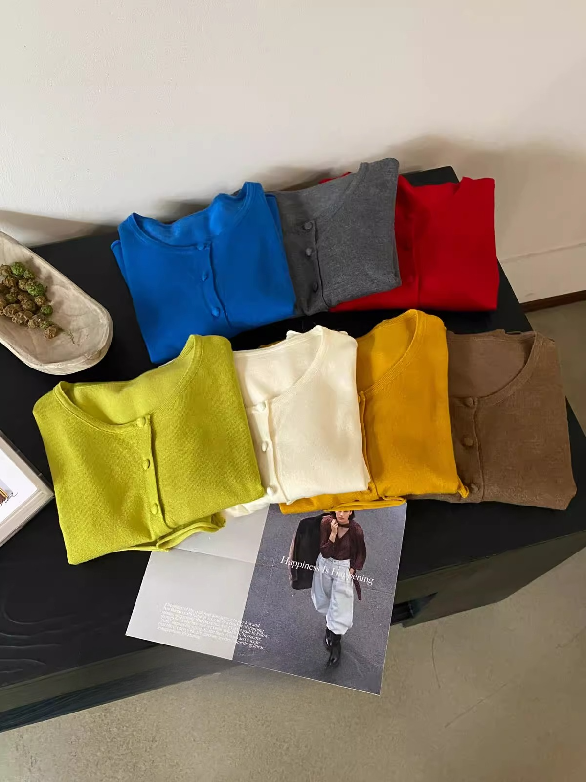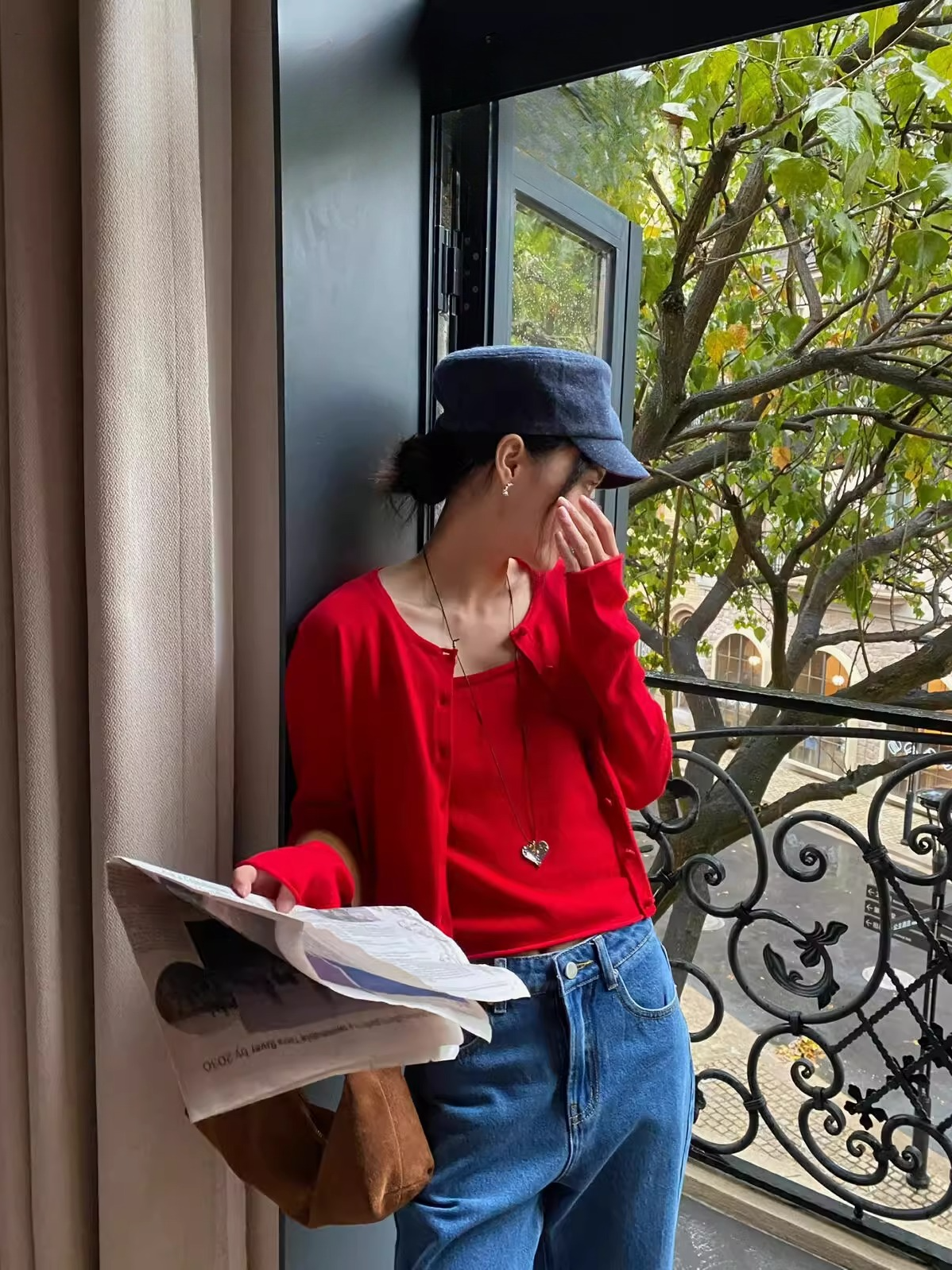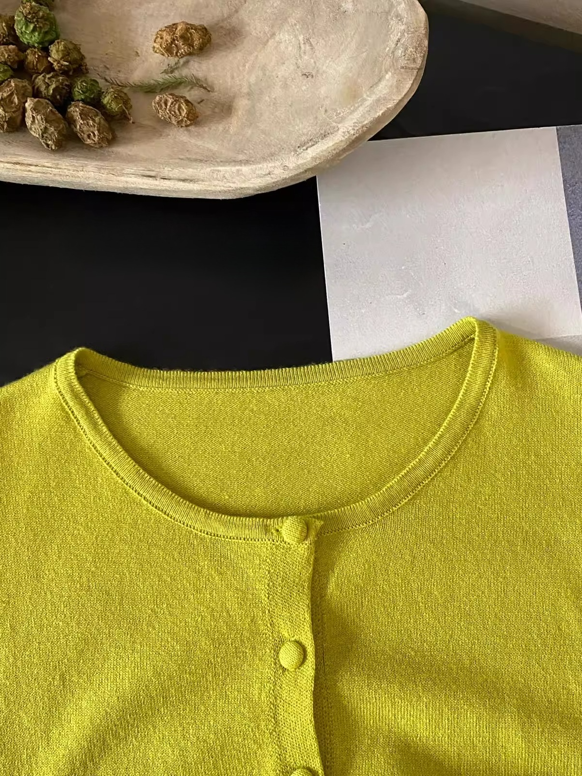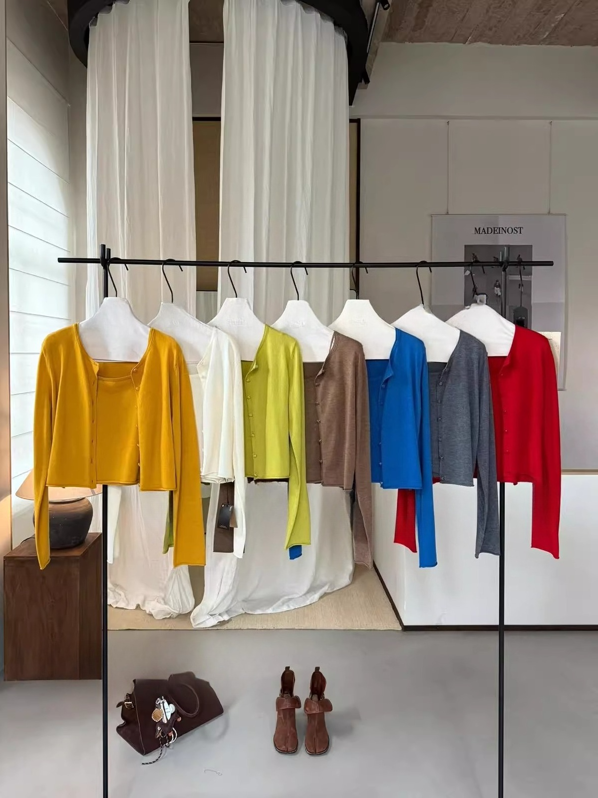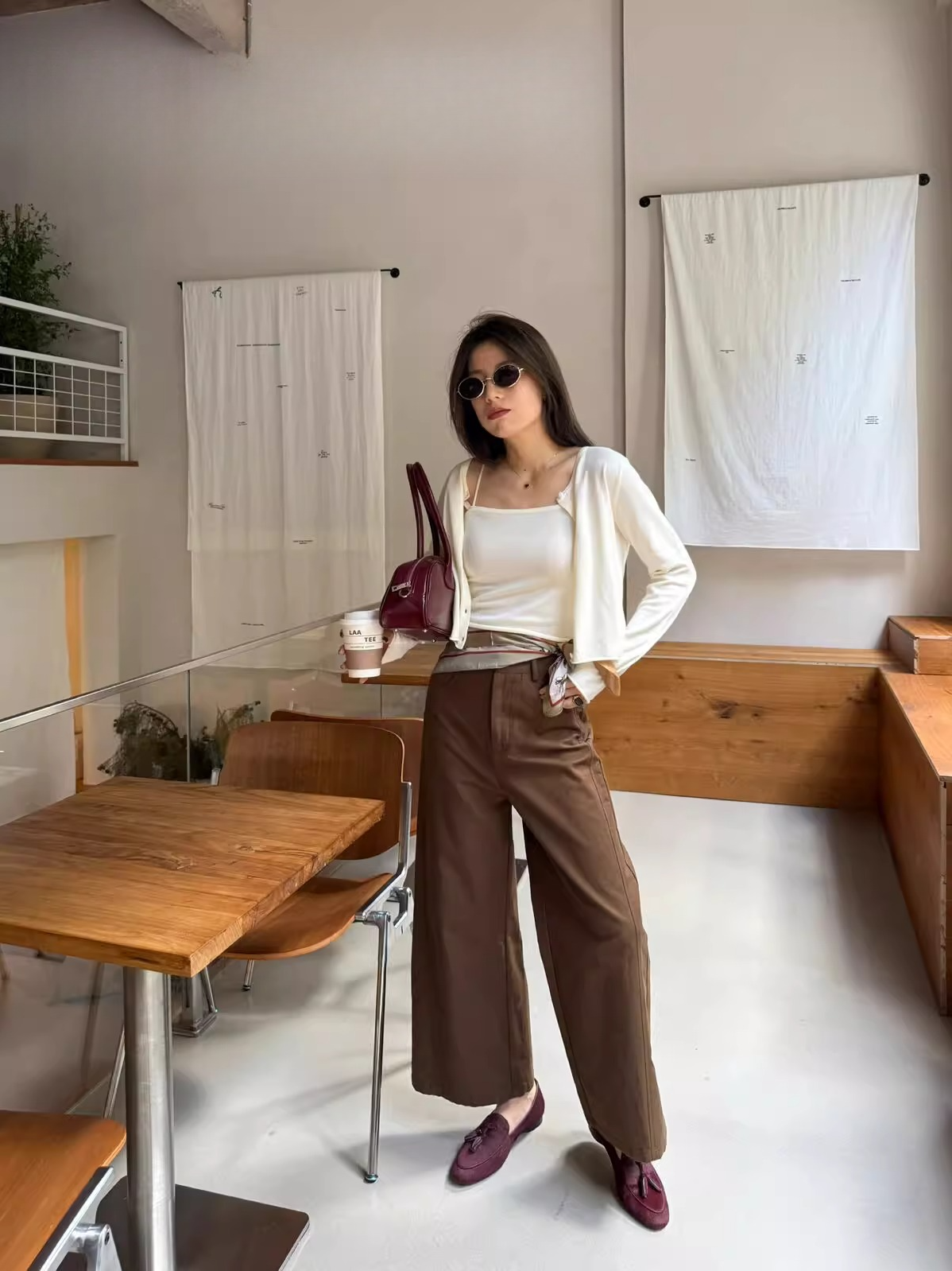 ループ紐でヘルシーな印象のキャミソールとショート丈ニットアンサンブル。