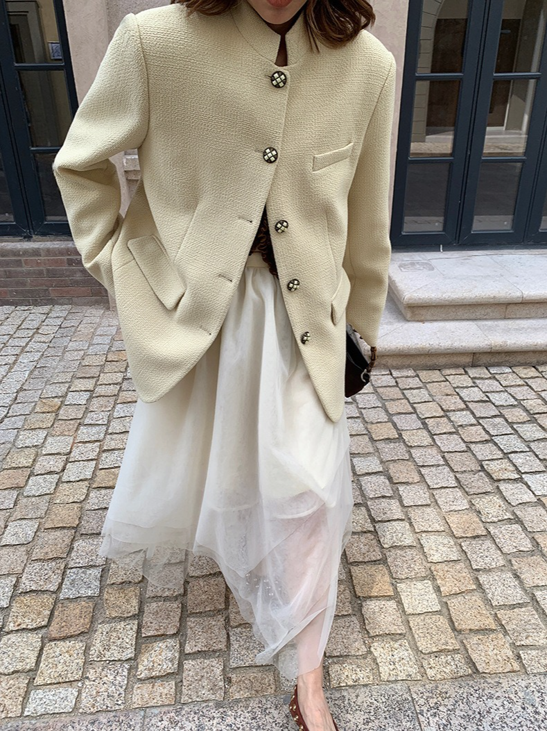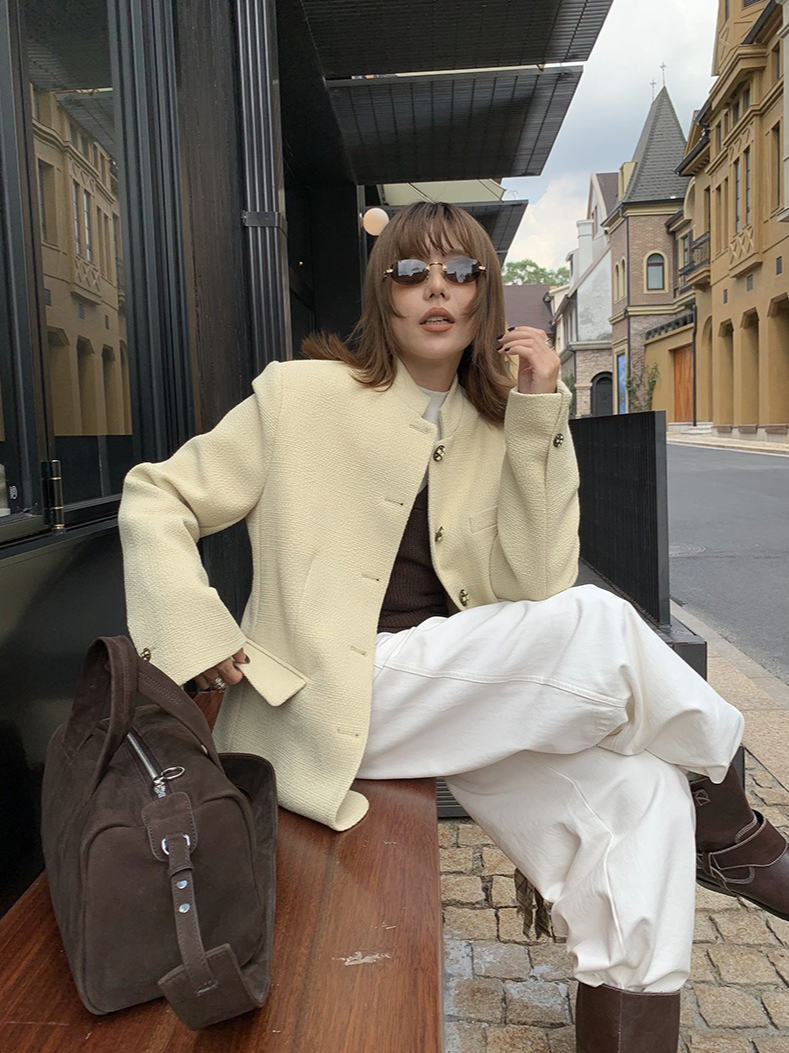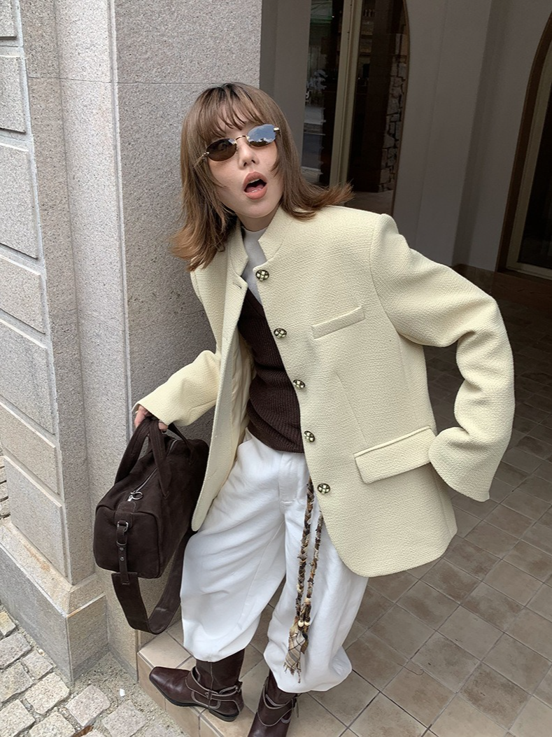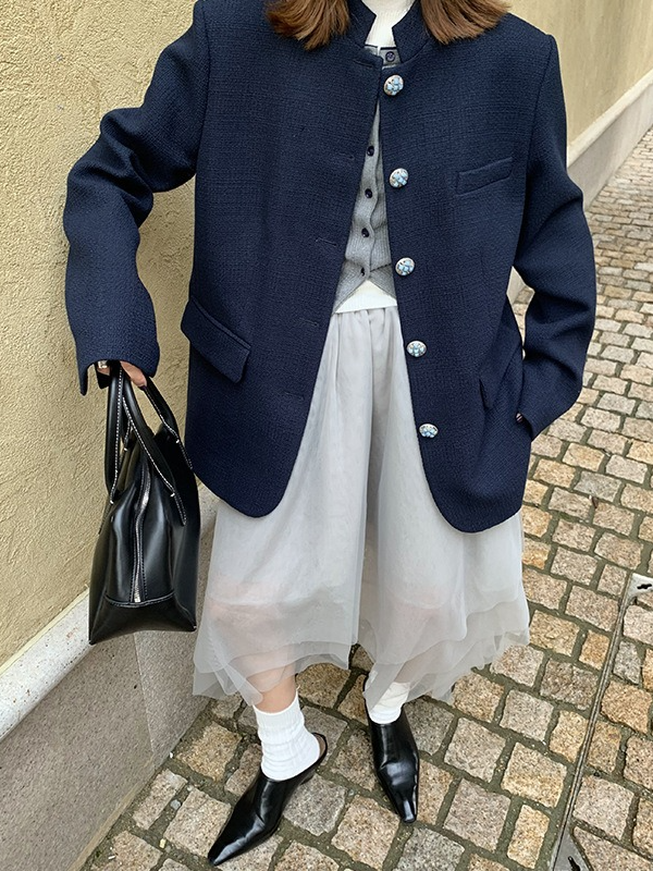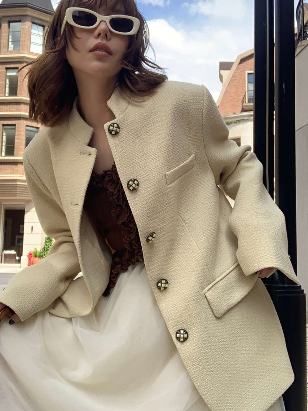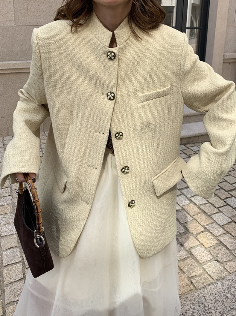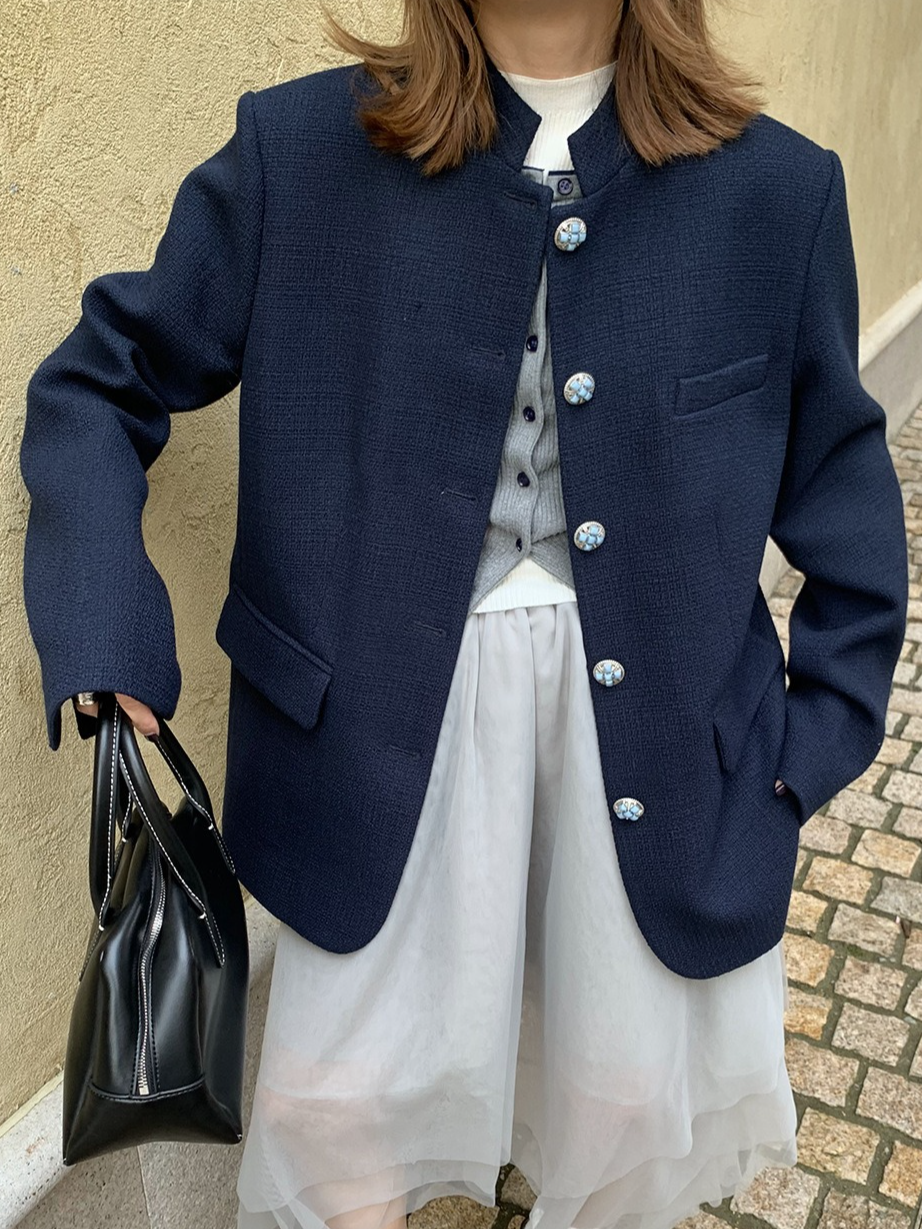 立体的な織り生地が特徴の、ミニマルスタンドカラ―ジャケット 。
