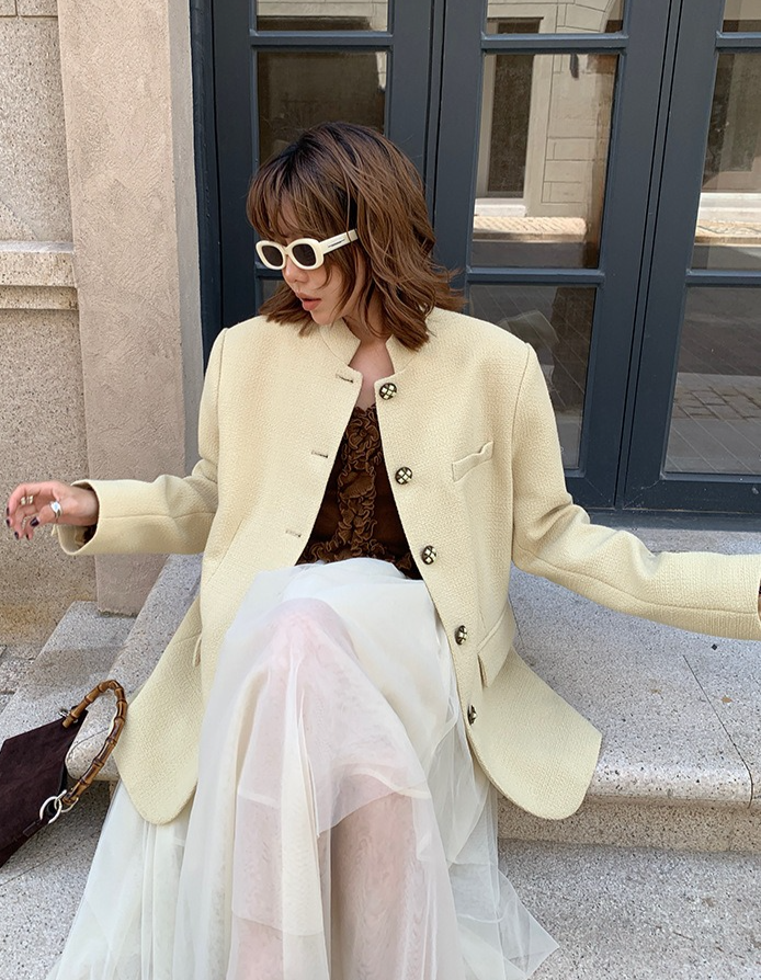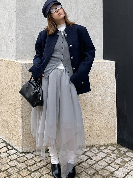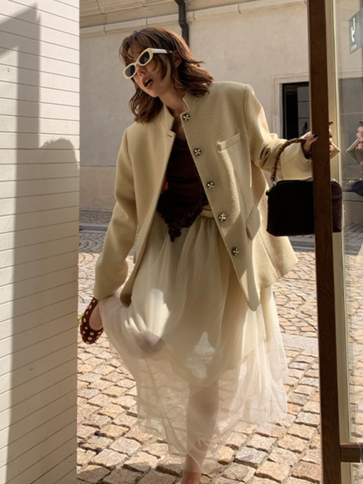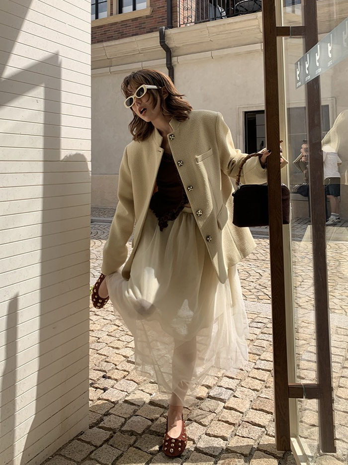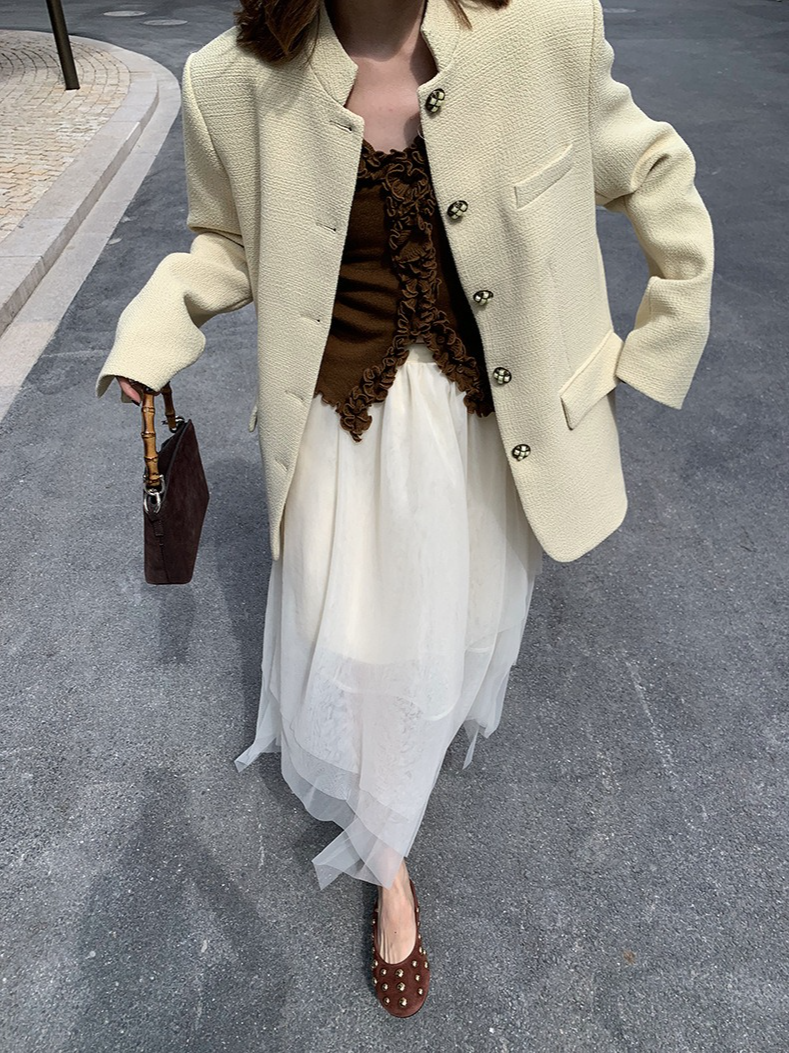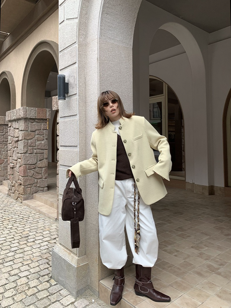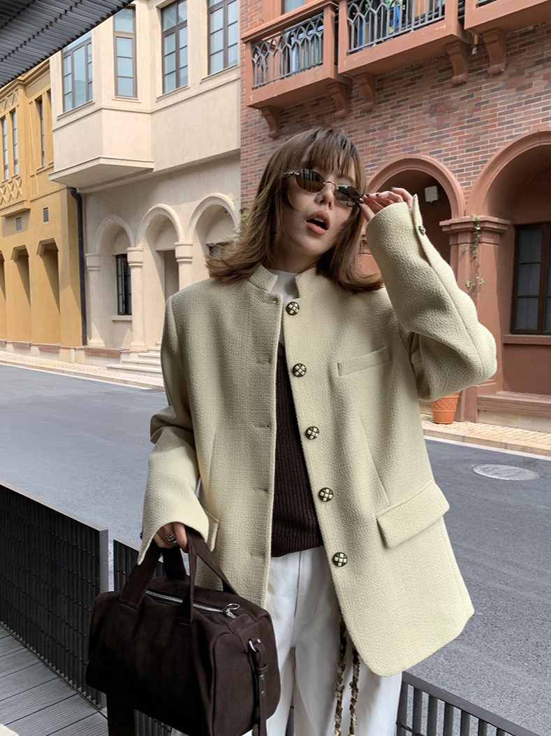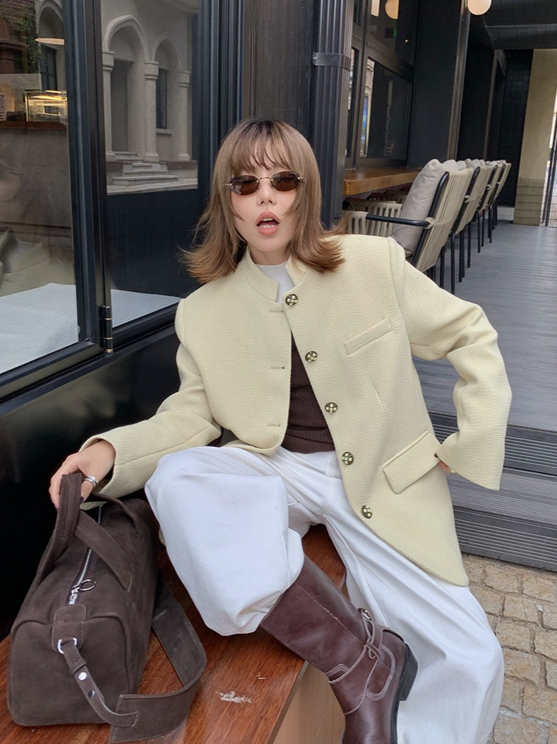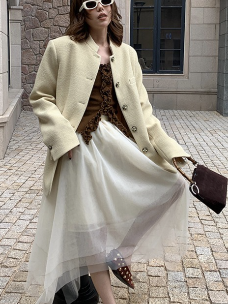 立体的な織り生地が特徴の、ミニマルスタンドカラ―ジャケット 。