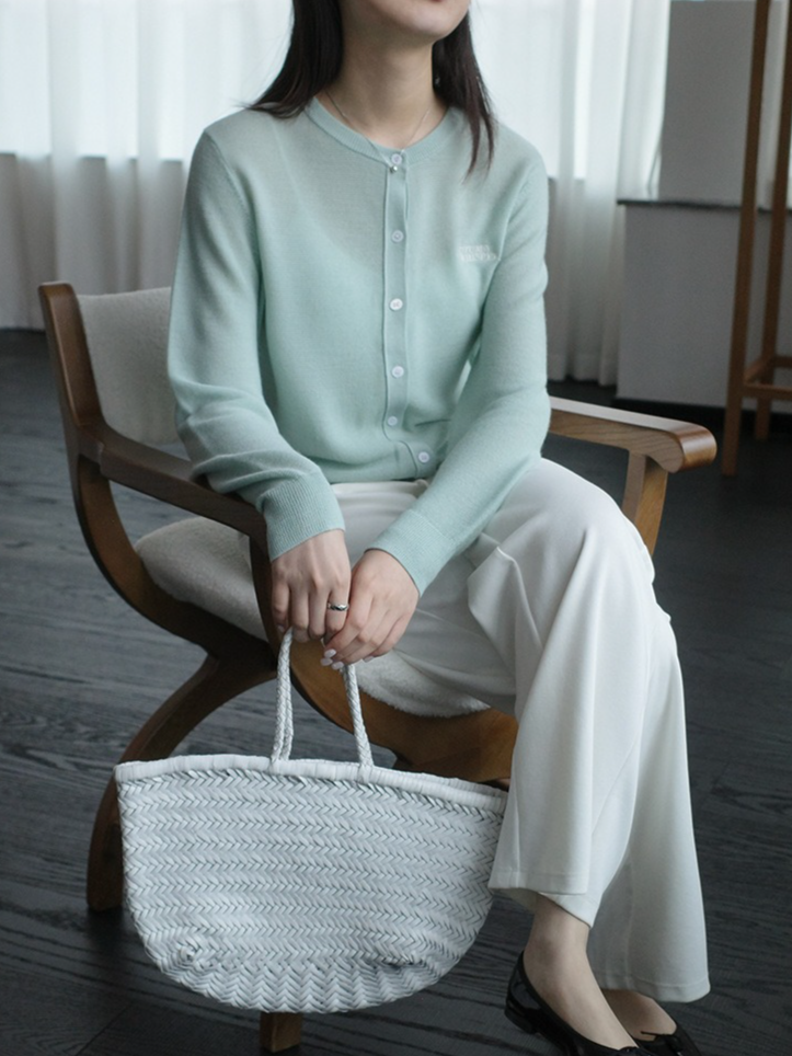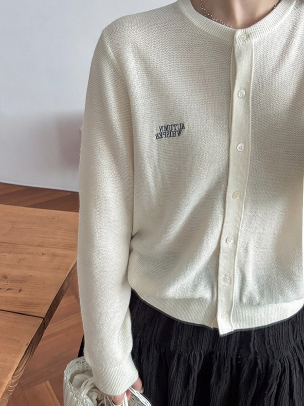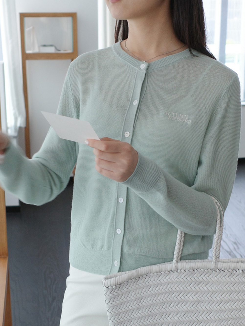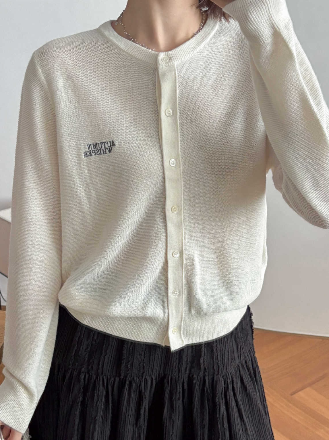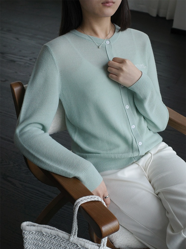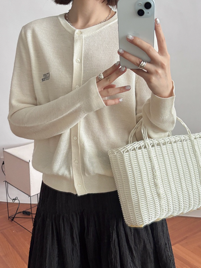 控えめな透け感とミニマルなデザインが魅力のクルーネックカーディガン。クラシックなフォルムに、ミニマルな縁取りが上品な抜け感を演出。胸元のワンポイント刺繍が、シンプルな中に上品なニュアンスをプラスします。薄手で柔らかな素材感は、季節の変わり目にも重宝し、レイヤードスタイルにもおすすめ。パンツにもスカートにも合わせやすく、カジュアルからキレイめまで幅広いコーデに活躍する一枚です。