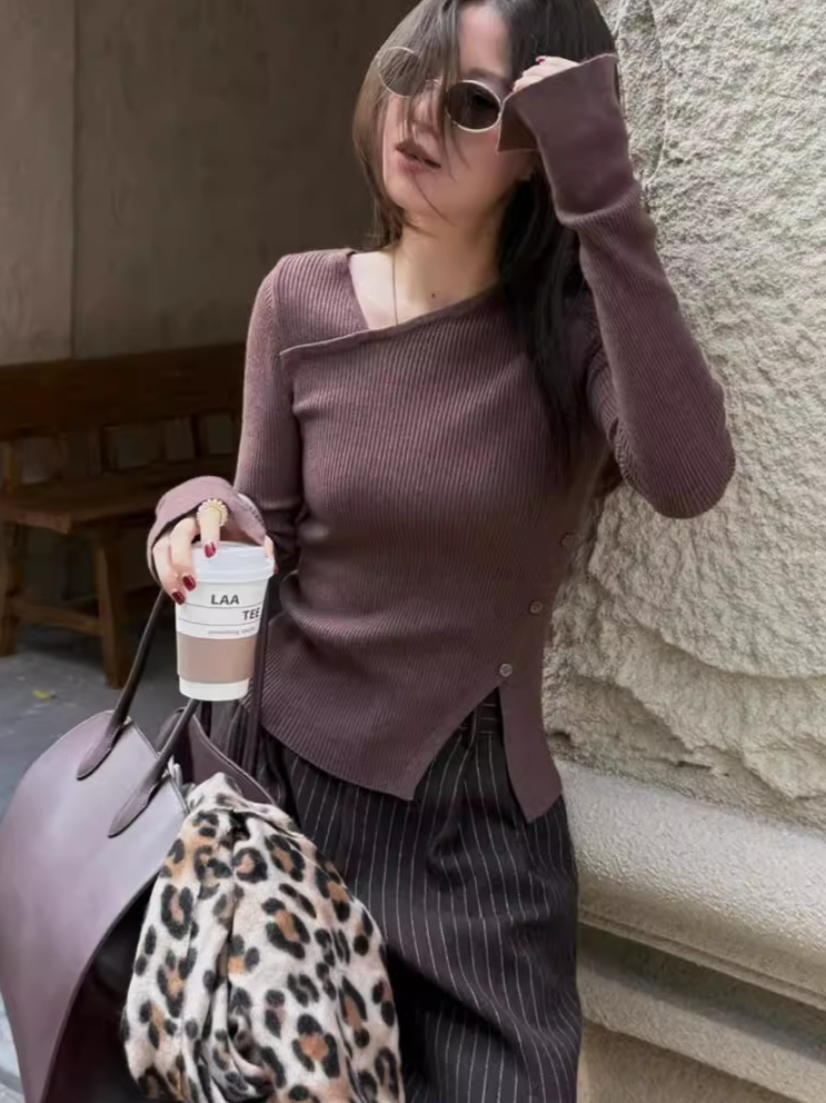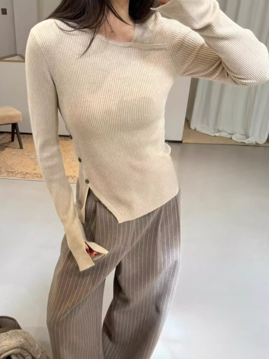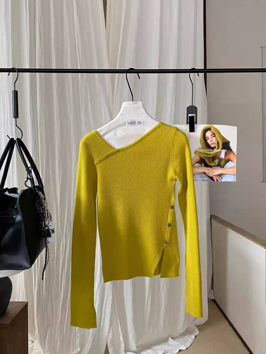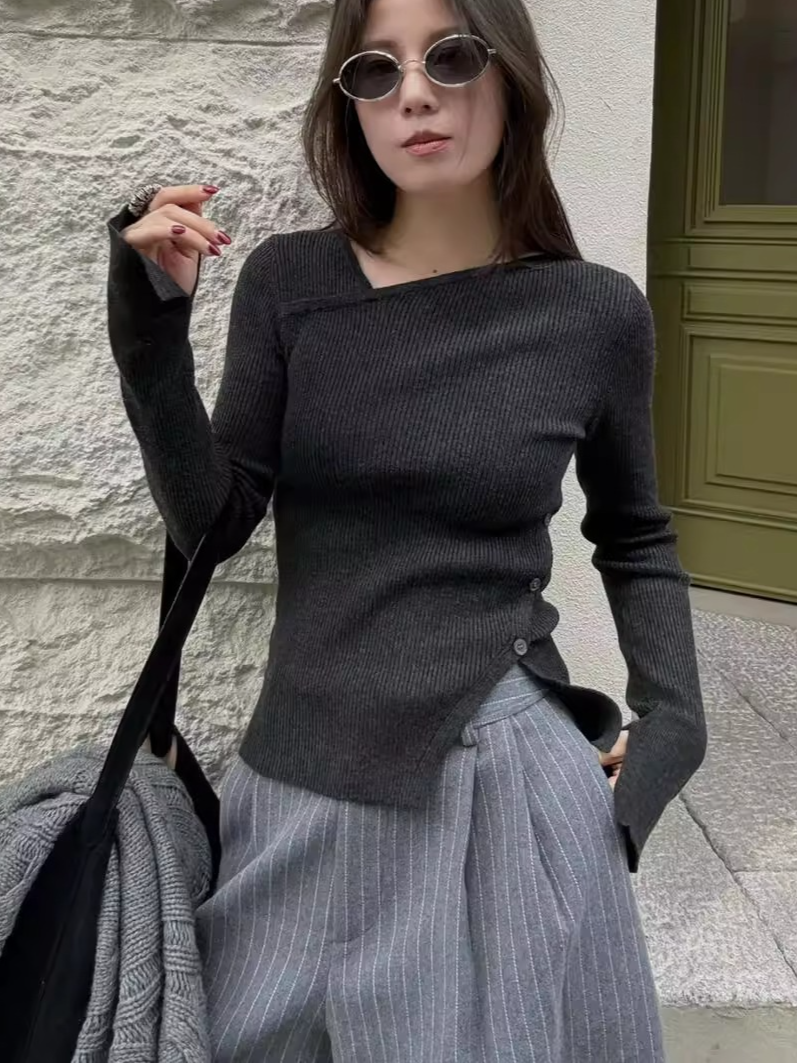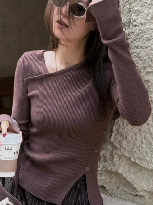 大胆なアシメトリーデザインが目を惹くリブニットトップス。程よくフィットするシルエットがボディラインを美しく引き立て、女性らしさと抜け感を絶妙に演出してくれます。シンプルながら構築的なディテールで、1枚で主役になる存在感。デニムと合わせてカジュアルに、スラックスでモードに振っても様になる、スタイリング自在のアイテムです。季節の変わり目にも重宝する一着。