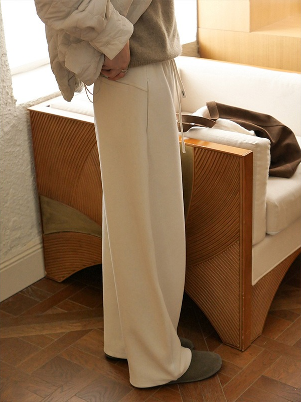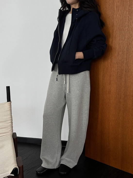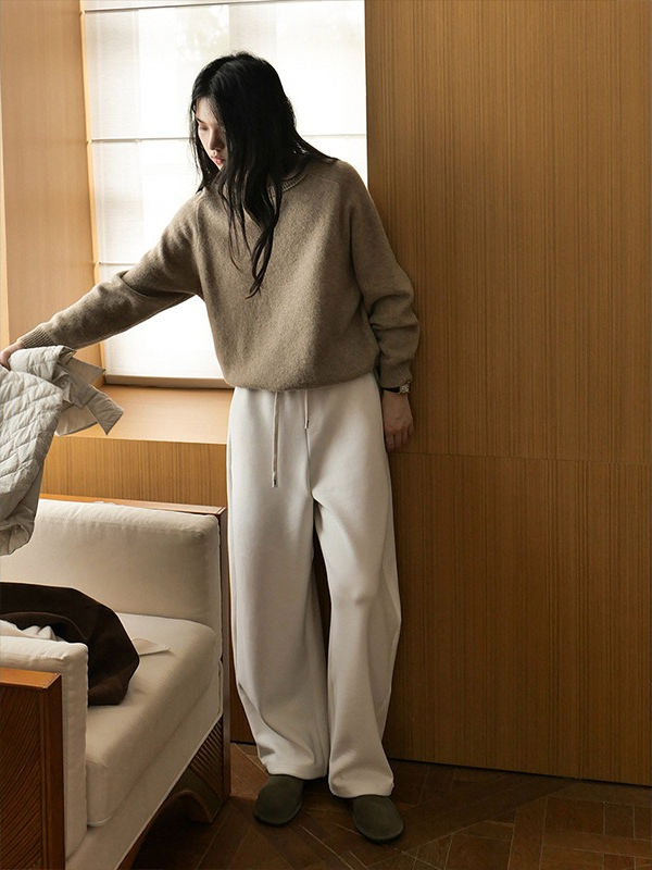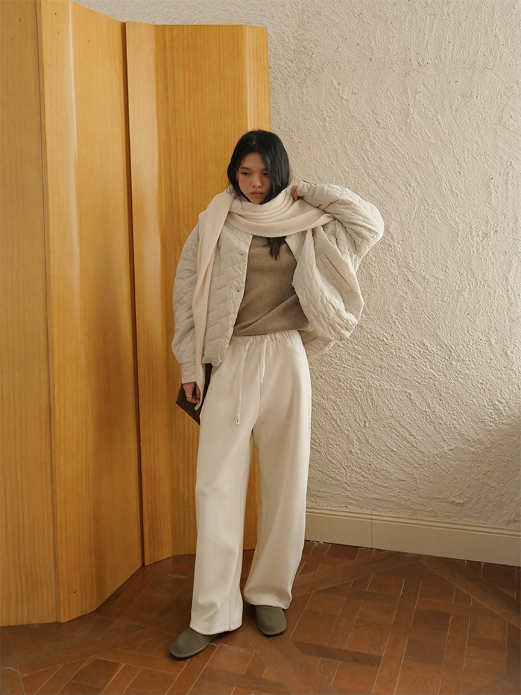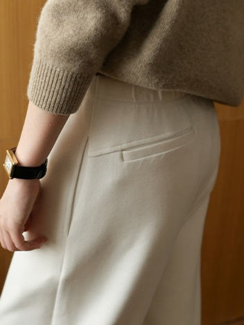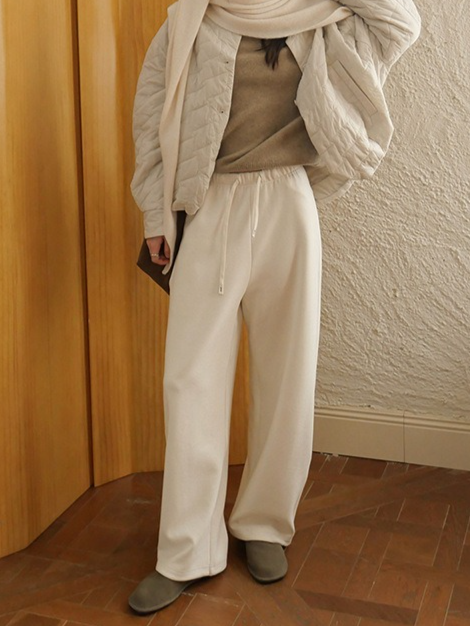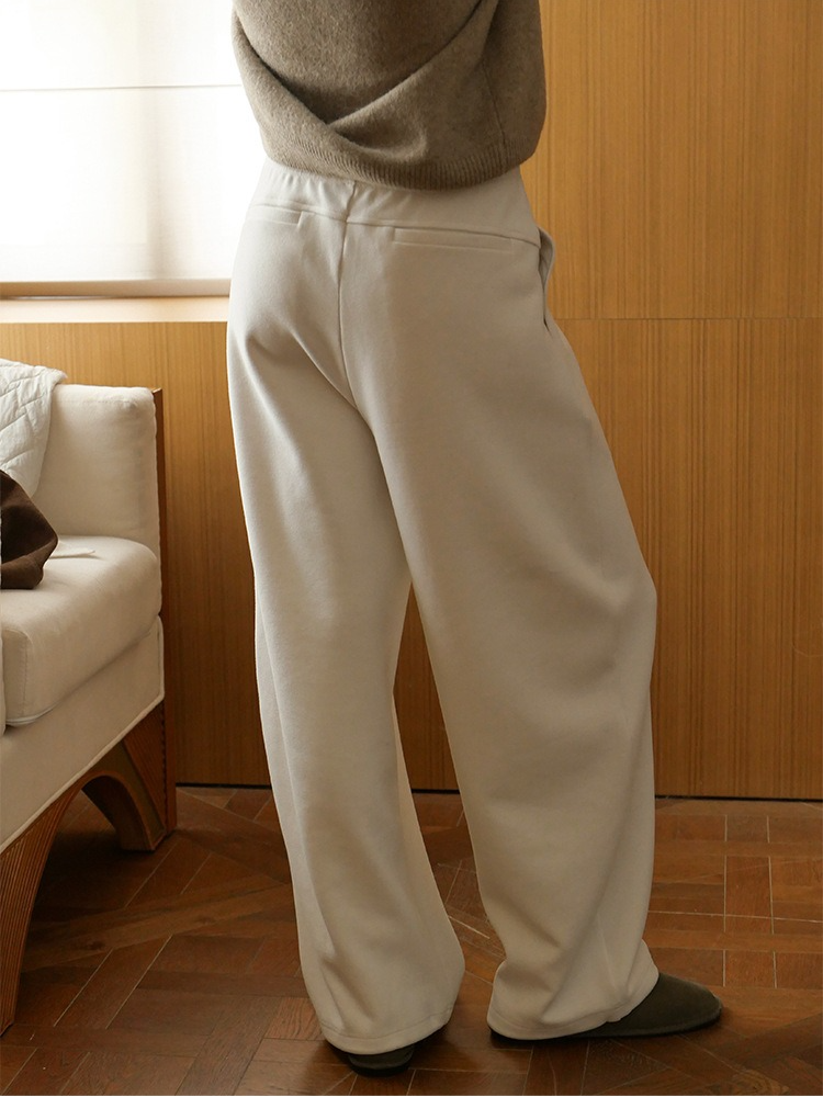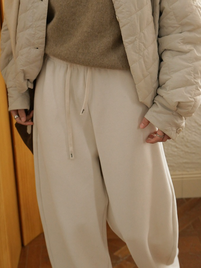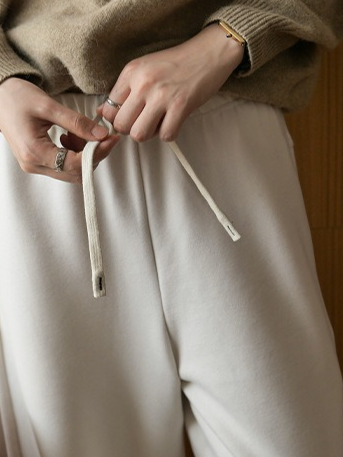 柔らかいスウェット素材を使い、ウエストはゴム仕様で、ストレスフリーな履き心地。