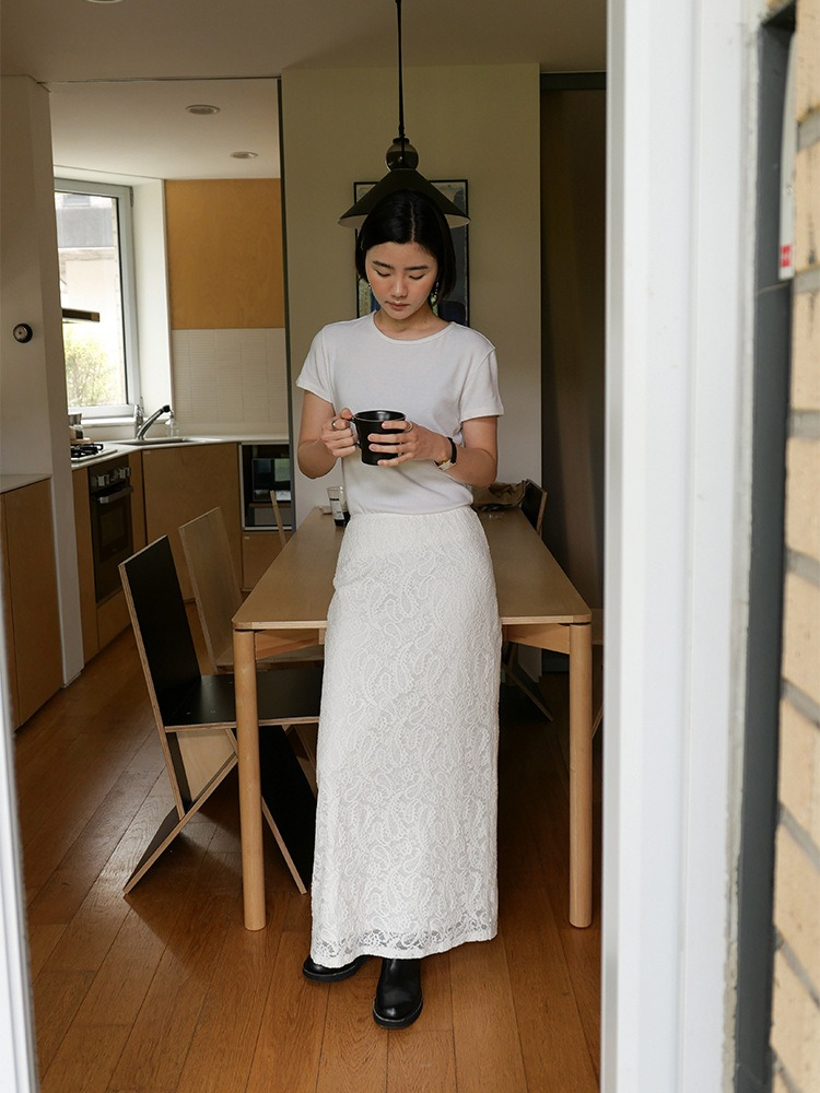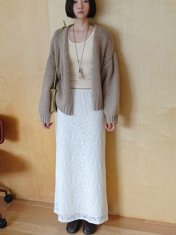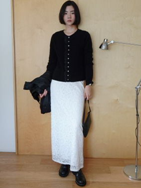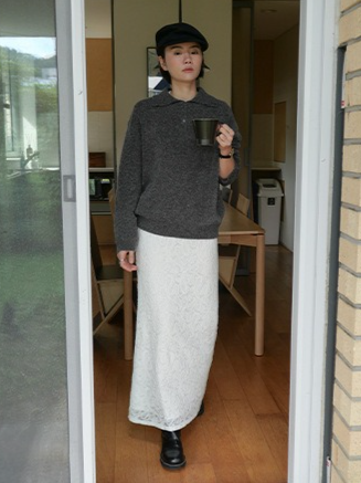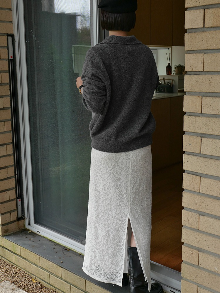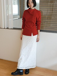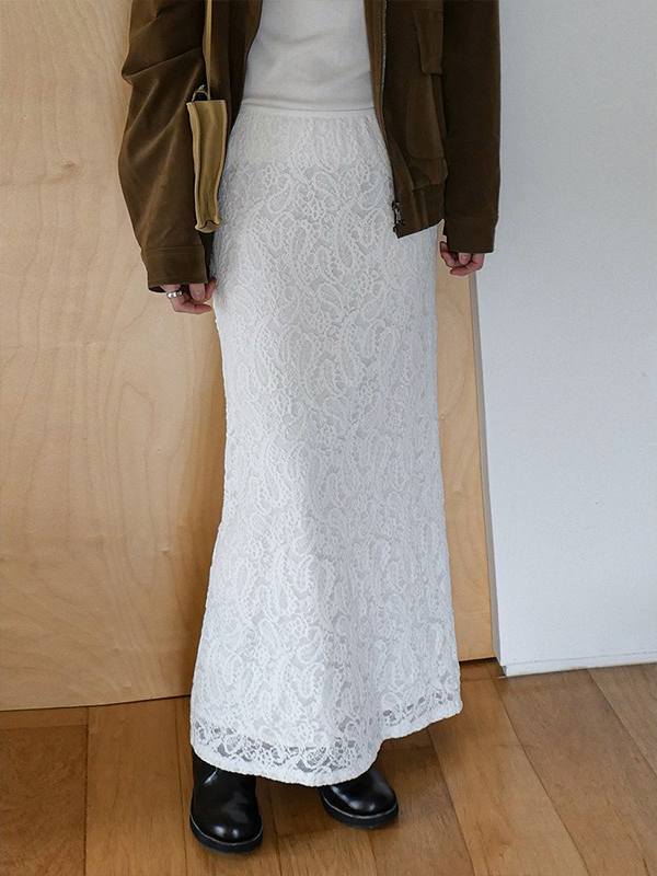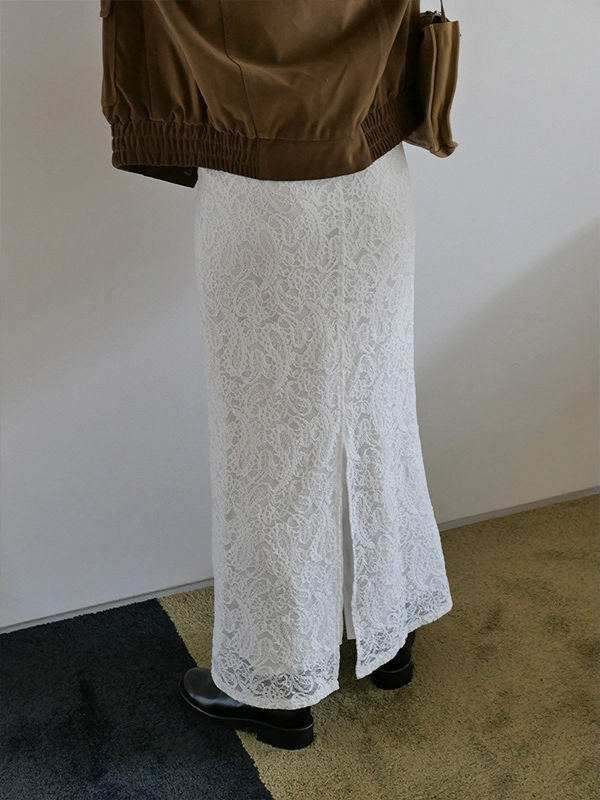 繊細なレースを施したレースロングスカート。ヴィンテージライクなレース地を使用し、上品なエッジの効いたデザインがポイントです。シンプルなシルエットで、バックに少し長めのスリットをプラス。ニットや、ジャケットなどシンプルなトップスと合わせるスタイリングがおすすめです。デイリー使いに、個性をプラスできる女性らしさを演出してくれる一着です。