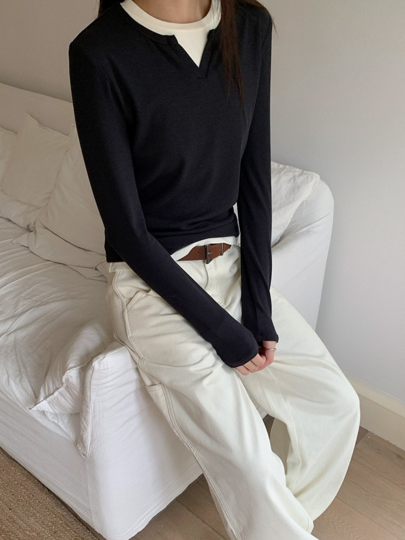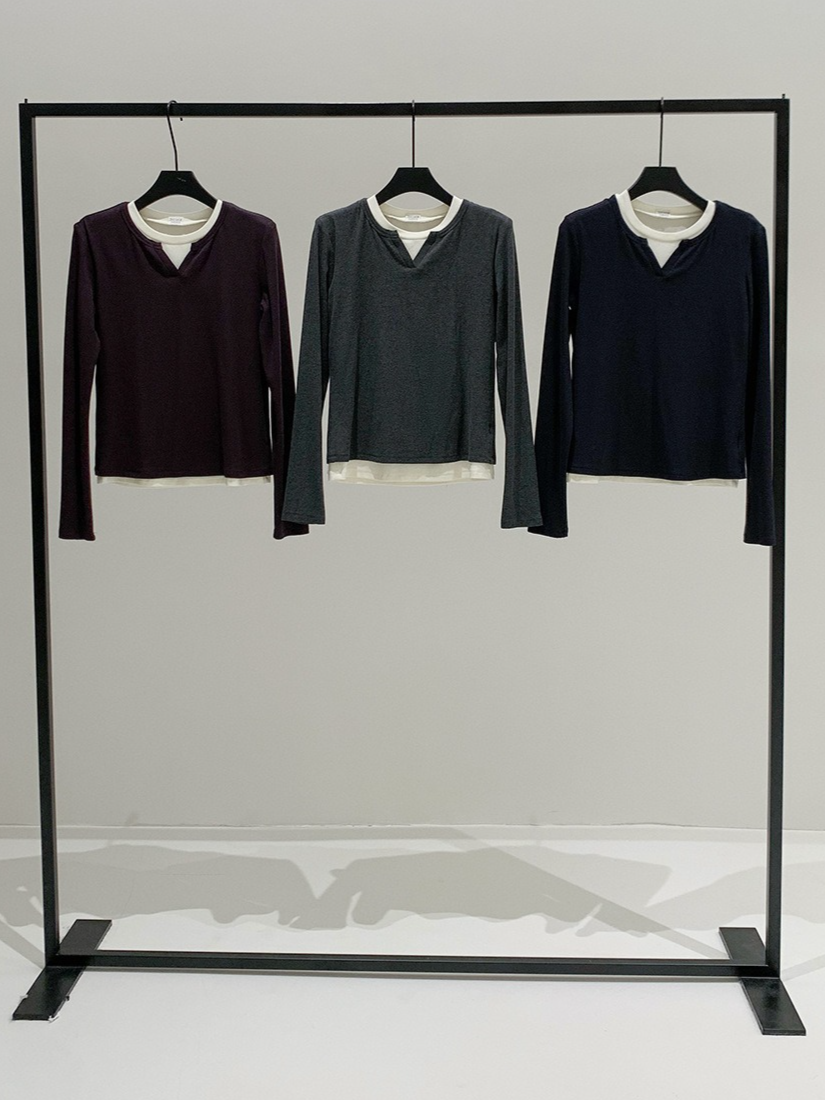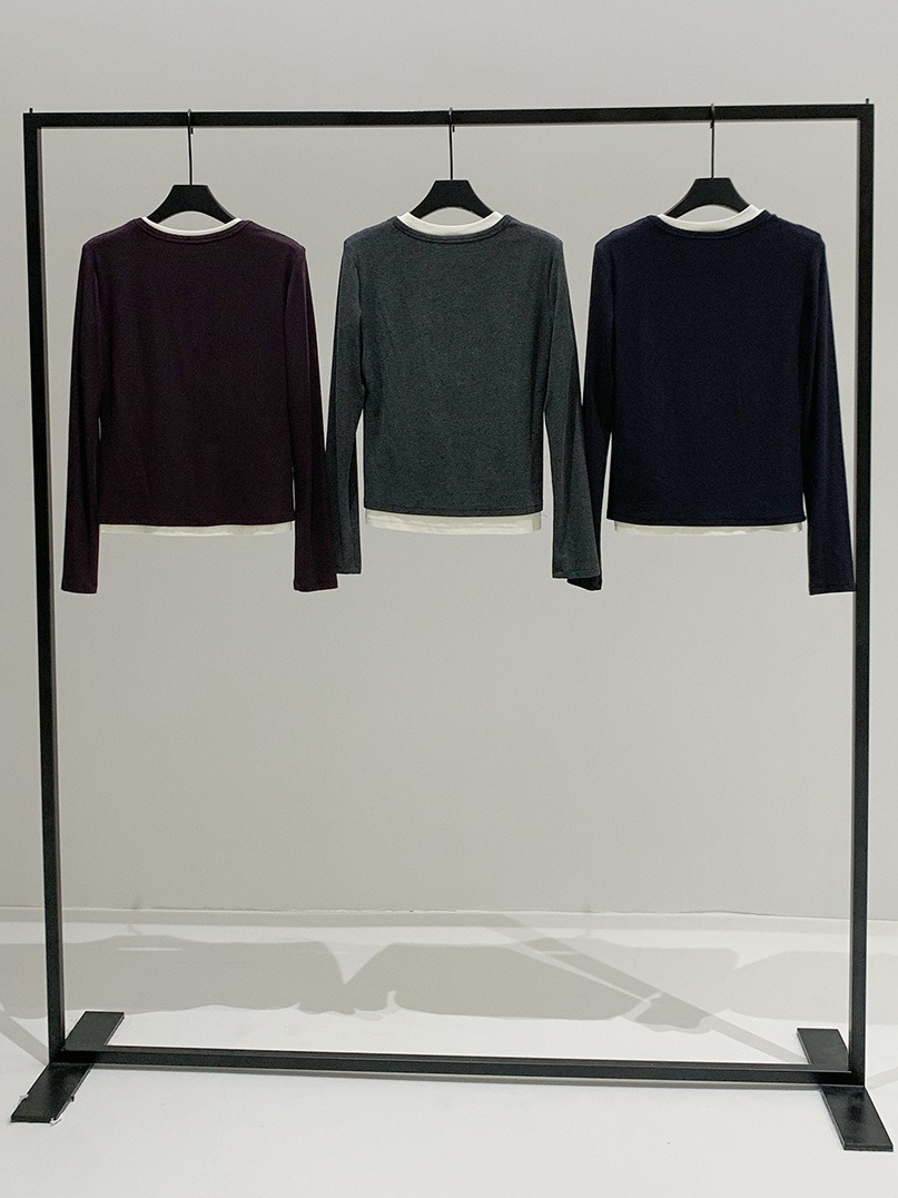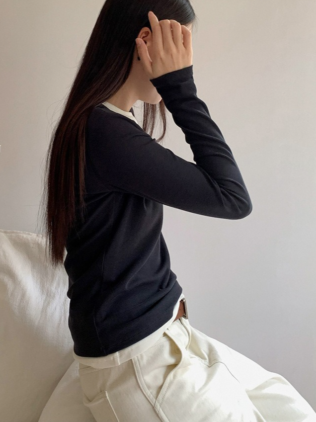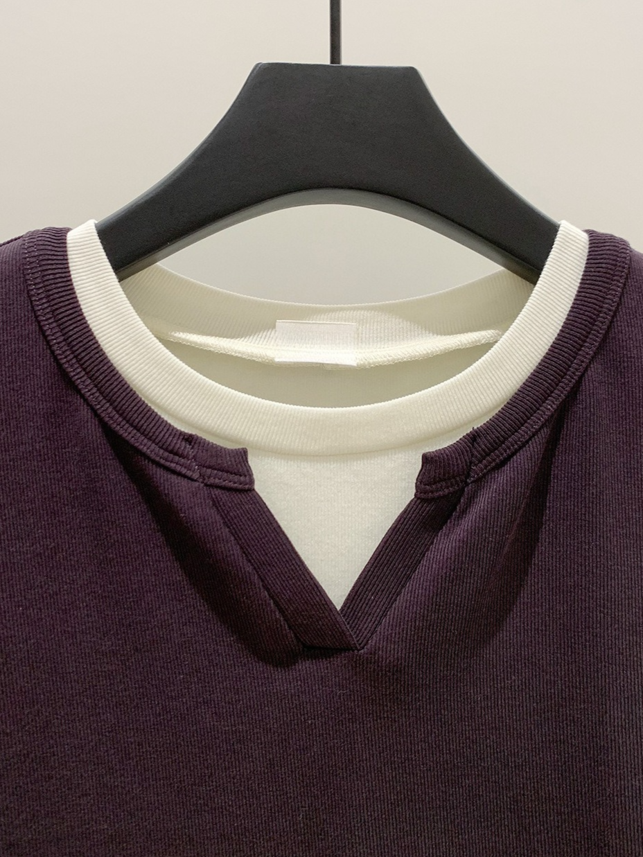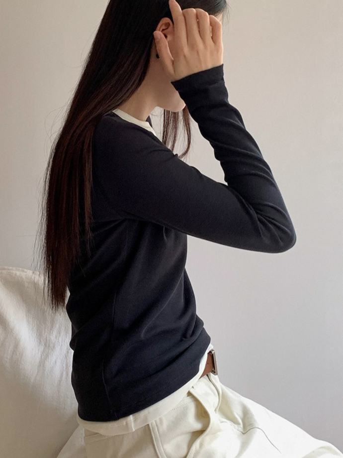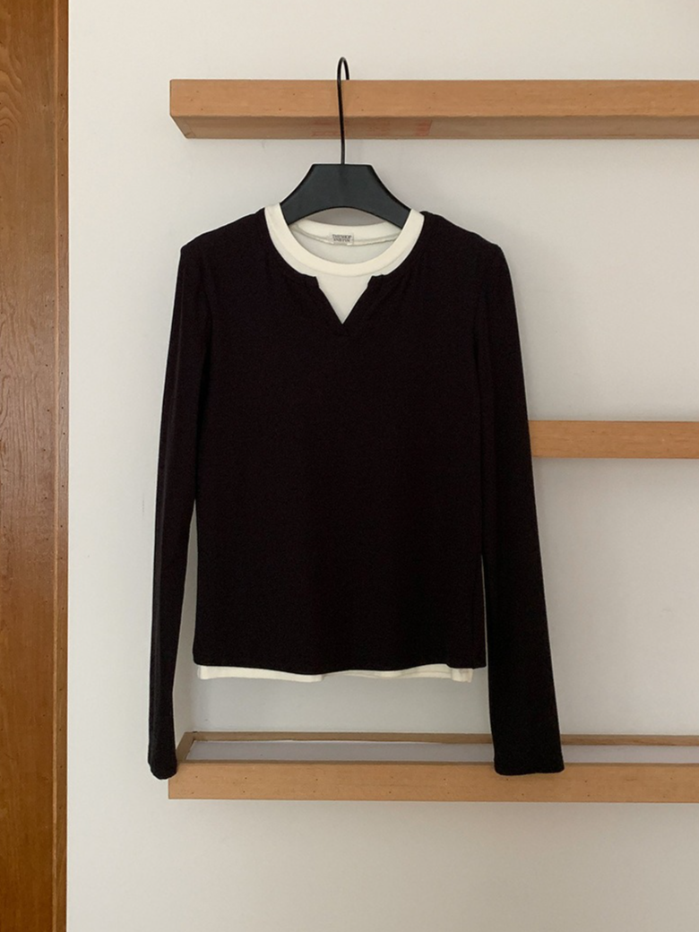 ネックラインから覗くインナー風のデザインが、さりげない抜け感を演出するフェイクツーピーススキッパーTシャツ。ソフトなリブ素材が身体にやわらかくフィットし、心地よい伸縮性でデイリーに着やすい一枚です。レイヤードしているような仕様が、シンプルな中にも抜け感をプラス。デニムやスラックスなど、合わせるボトムで様々なスタイリングを楽しめます。シーズンレスで活躍する、ミニマルで上品な大人のベーシックアイテムです。