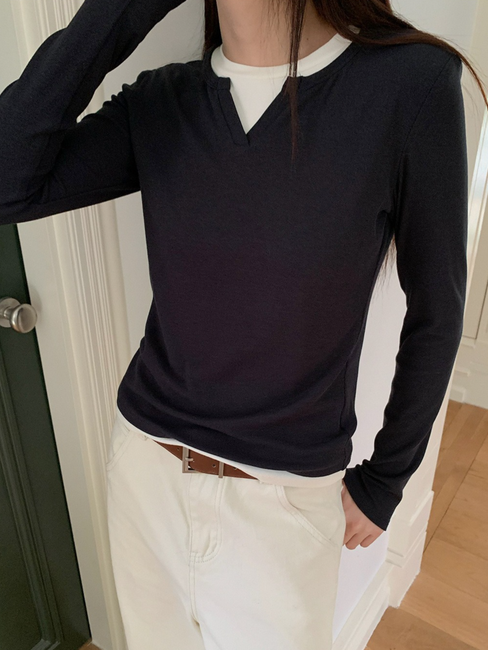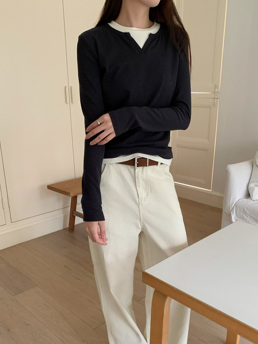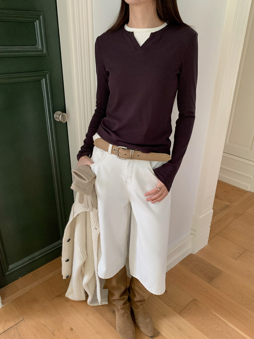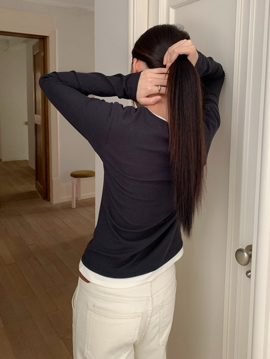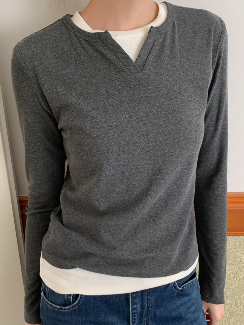 ネックラインから覗くインナー風のデザインが、さりげない抜け感を演出するフェイクツーピーススキッパーTシャツ。ソフトなリブ素材が身体にやわらかくフィットし、心地よい伸縮性でデイリーに着やすい一枚です。レイヤードしているような仕様が、シンプルな中にも抜け感をプラス。デニムやスラックスなど、合わせるボトムで様々なスタイリングを楽しめます。シーズンレスで活躍する、ミニマルで上品な大人のベーシックアイテムです。