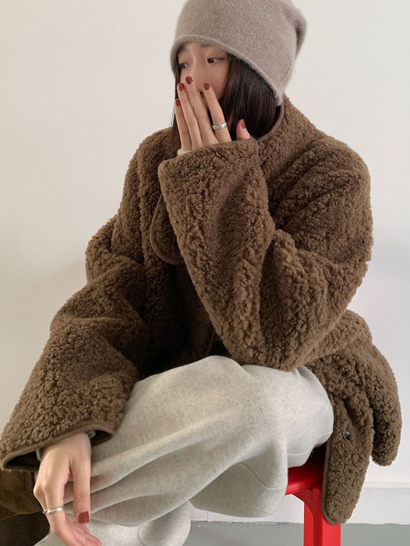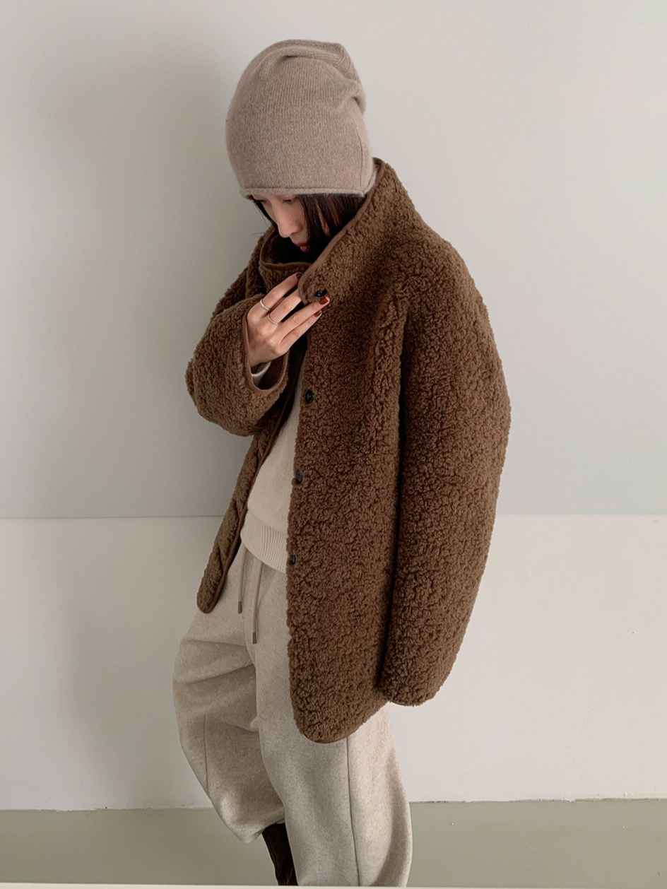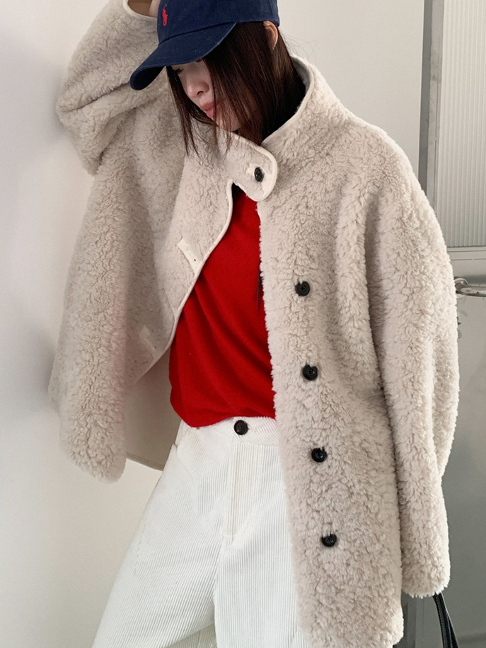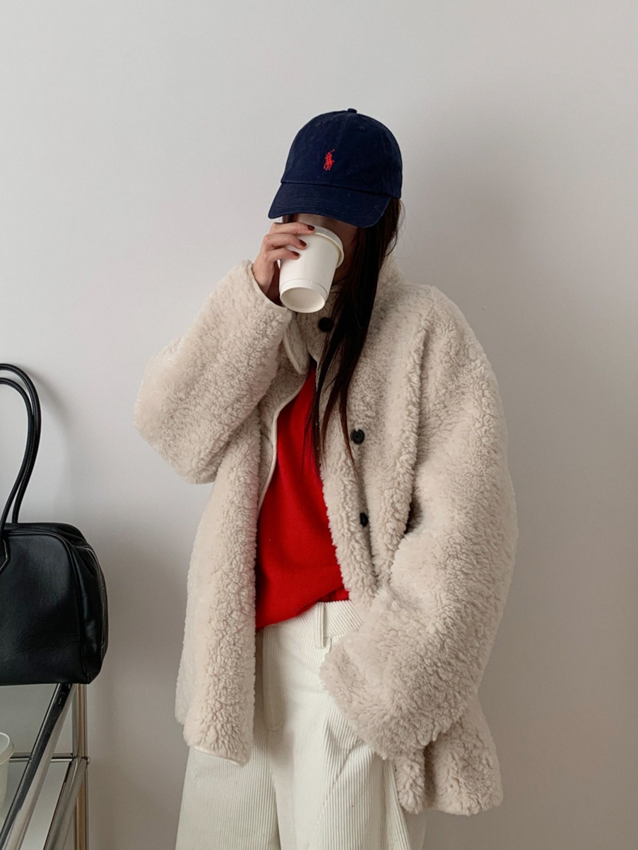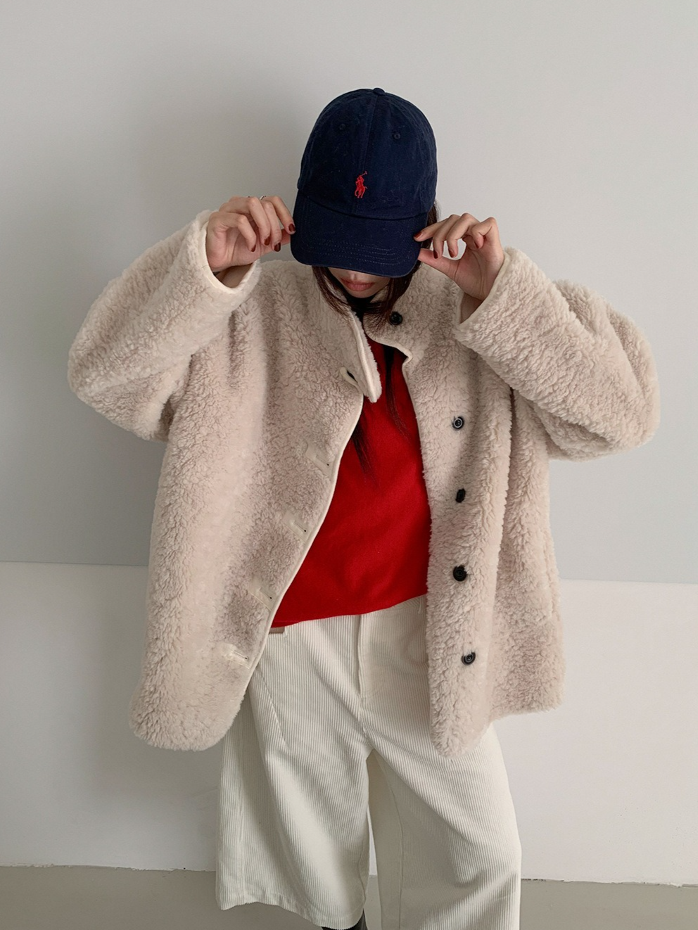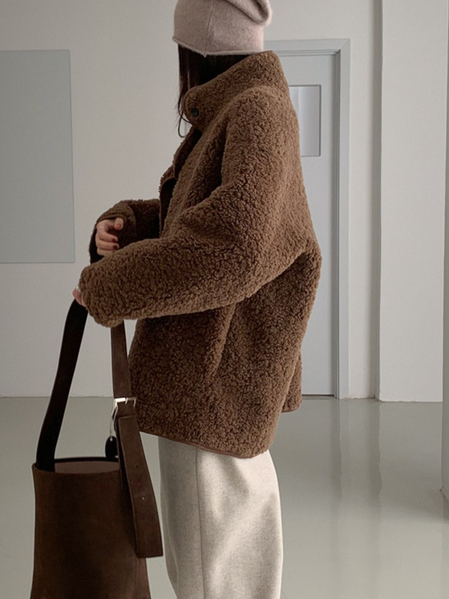 柔らかなボア素材が心地よい、スタンドカラーデザインのショートコート。ふんわりとした質感で、首元までしっかり覆うスタンドカラーが冬の冷たい風を防ぎながらも、上品な印象に。ゆったりとしたシルエットで重ね着もしやすく、ヒップラインをカバーする絶妙な丈感。デニムやワイドパンツはもちろん、スカートにもバランスよくマッチします。