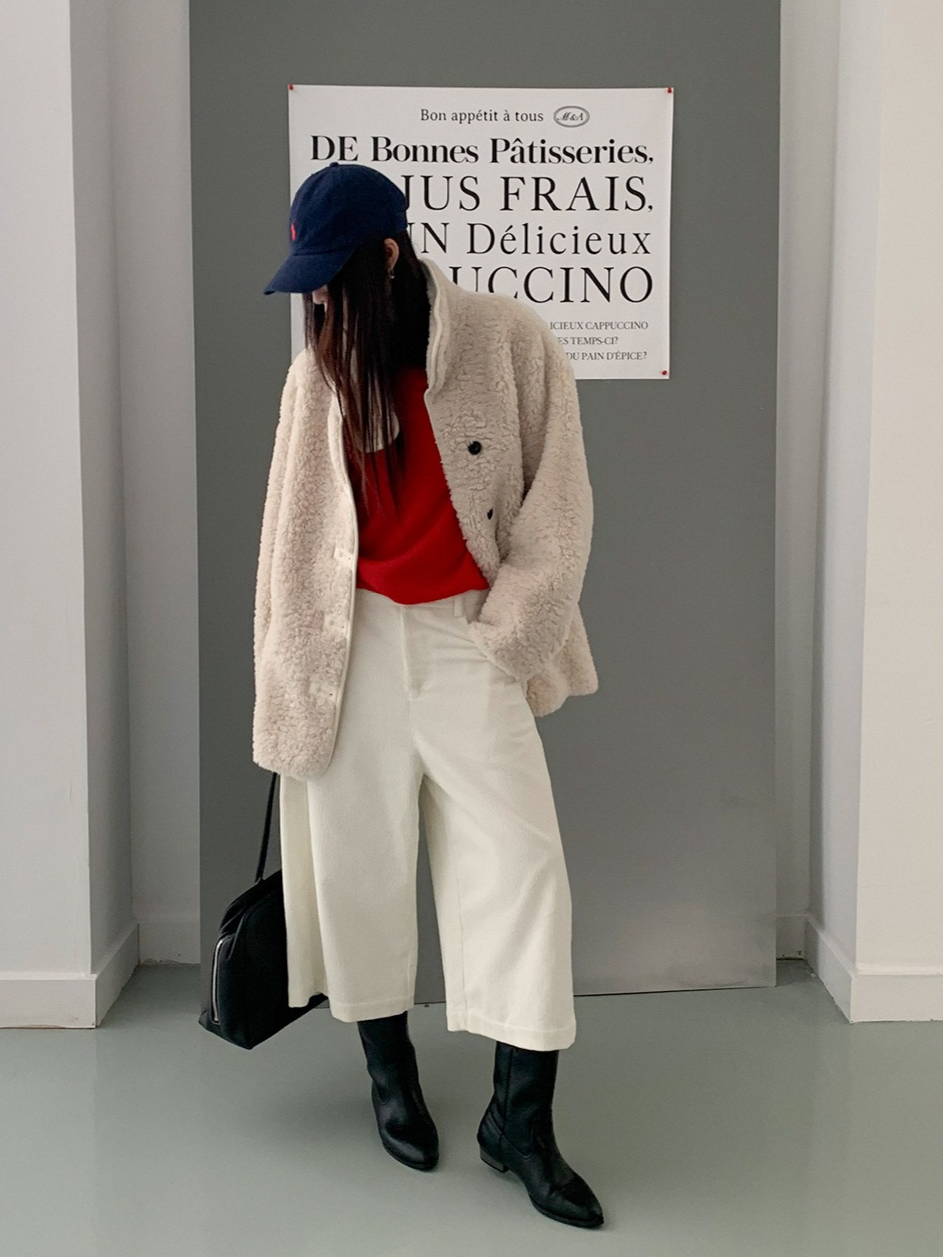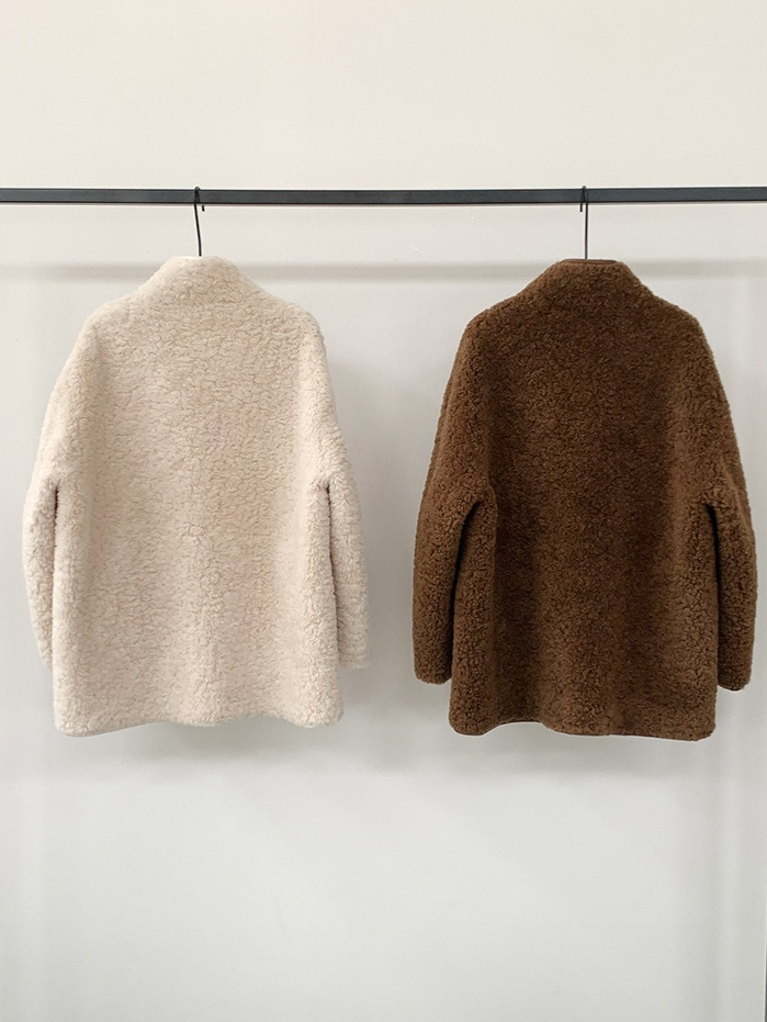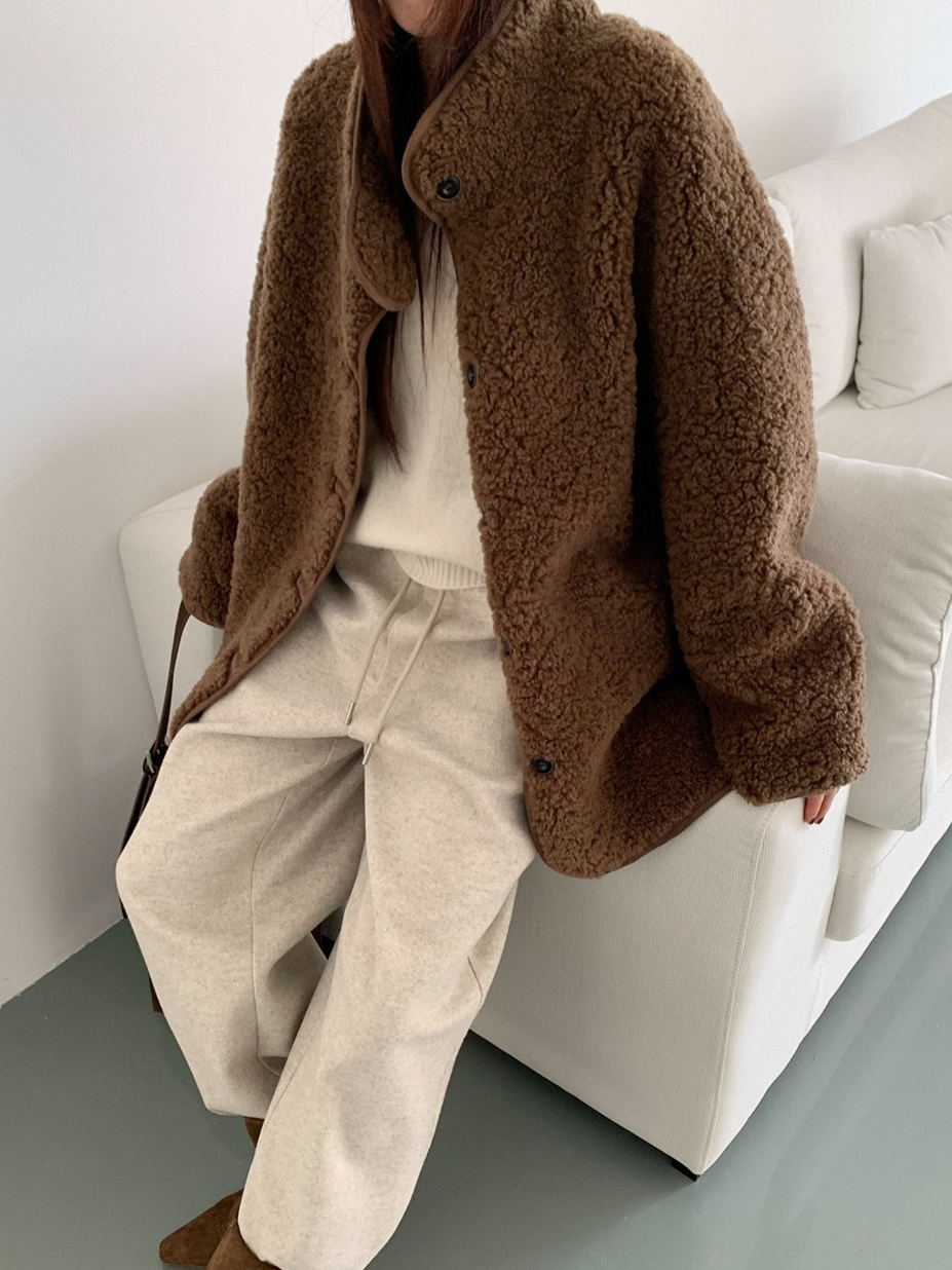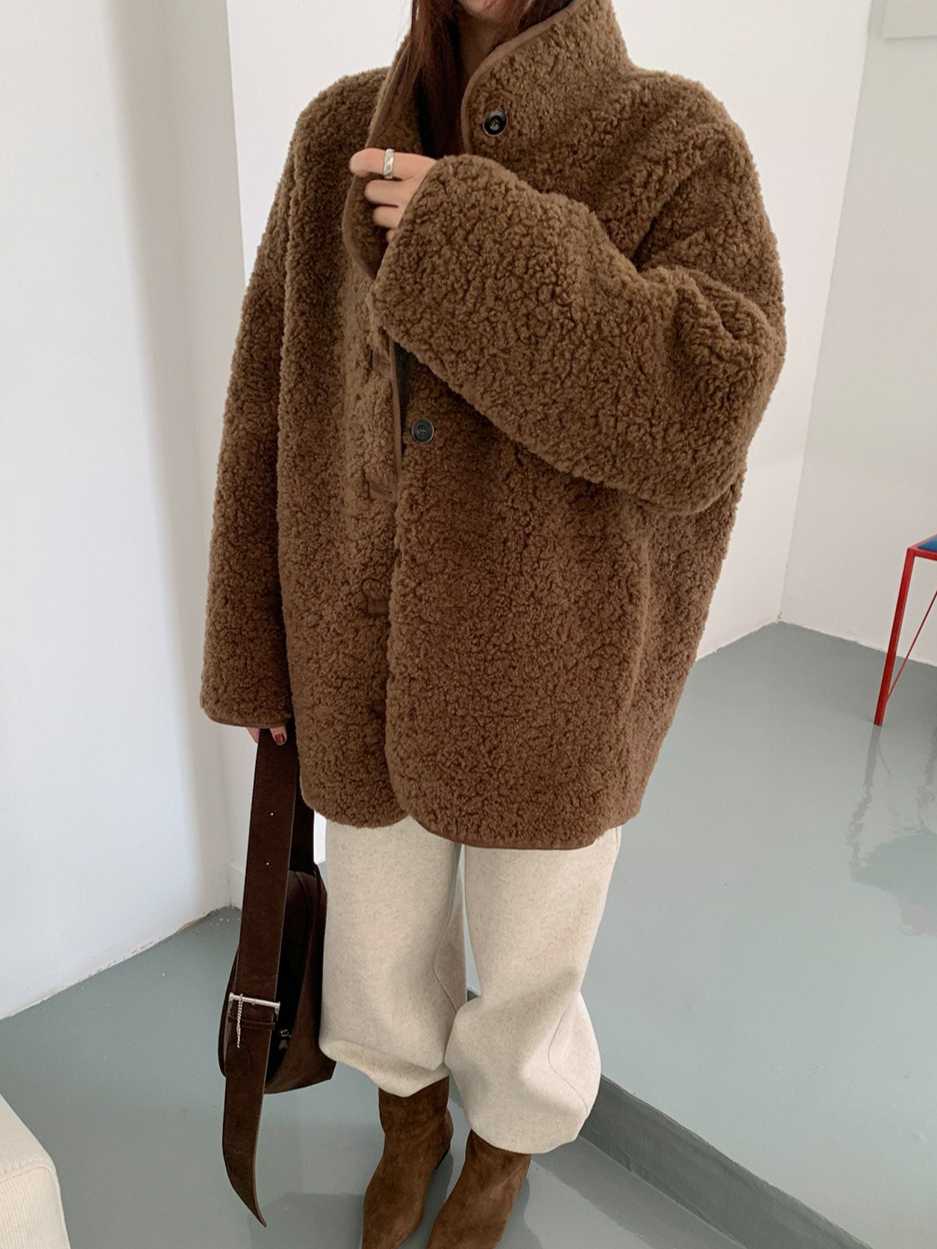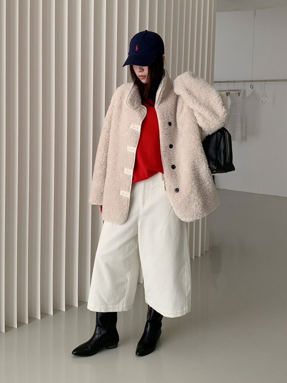 柔らかなボア素材が心地よい、スタンドカラーデザインのショートコート。ふんわりとした質感で、首元までしっかり覆うスタンドカラーが冬の冷たい風を防ぎながらも、上品な印象に。ゆったりとしたシルエットで重ね着もしやすく、ヒップラインをカバーする絶妙な丈感。デニムやワイドパンツはもちろん、スカートにもバランスよくマッチします。