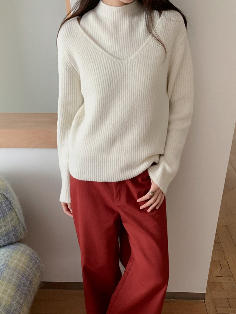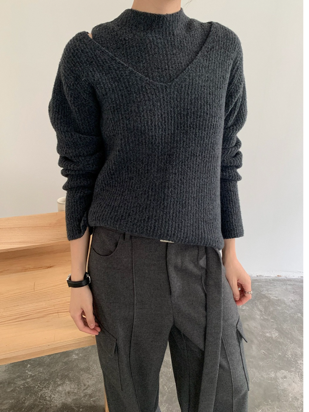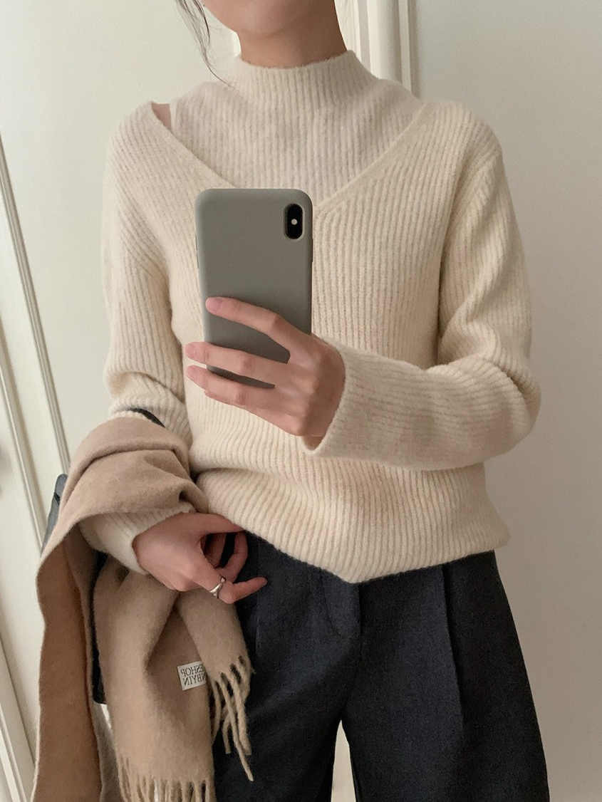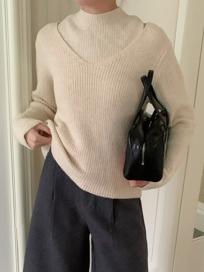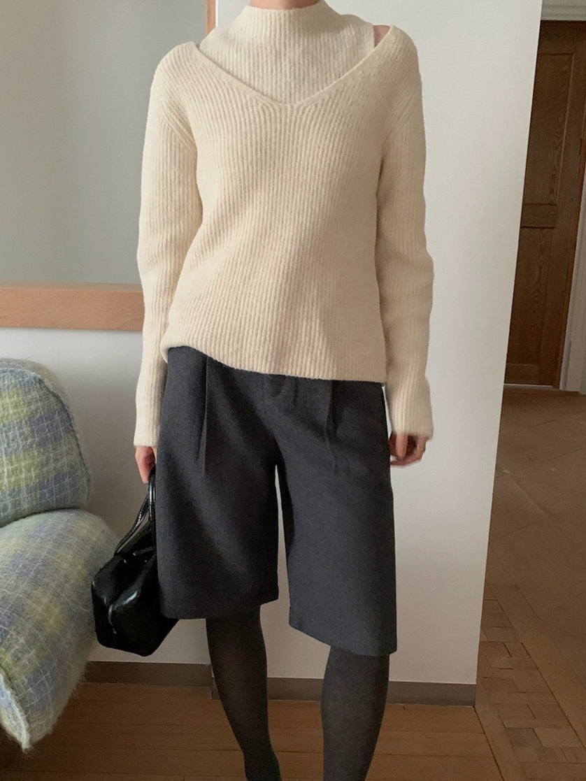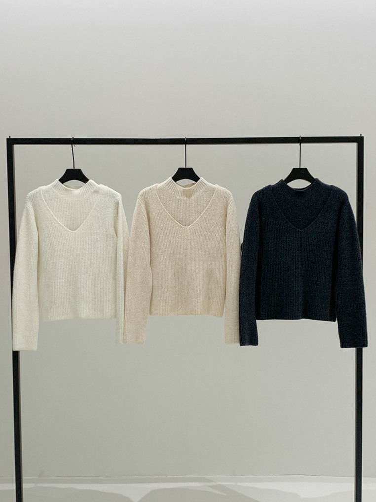 Vネックとプチハイネックタニットのレイヤードが印象的なニットトップス。一枚でスタイリングが完成する計算されたバランスで、肩のラインや襟元の抜け感が大人な印象に。ややルーズなシルエットがこなれたリラックスムードを演出。程よい厚みと柔らかな肌触りで、インナーとしても主役としても活躍します。