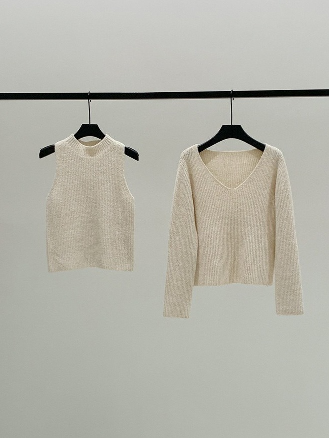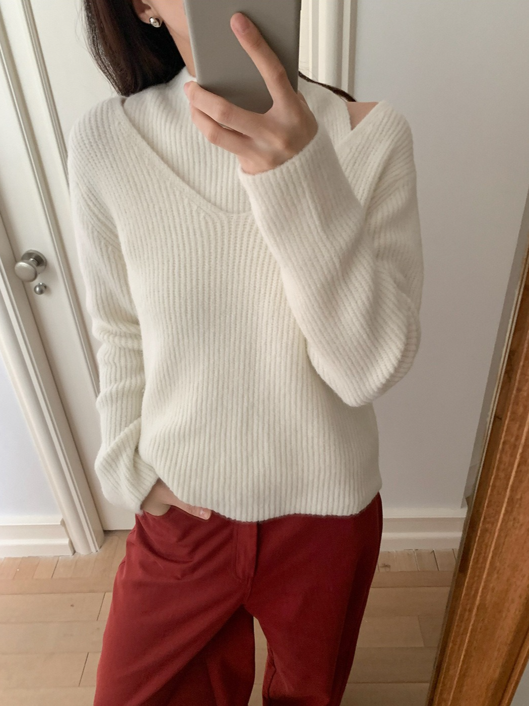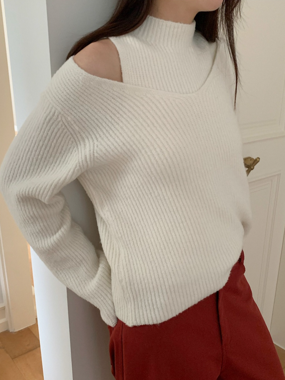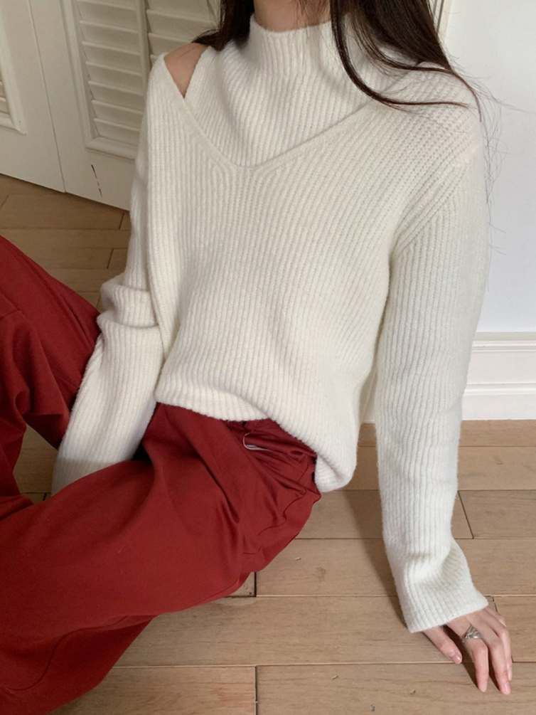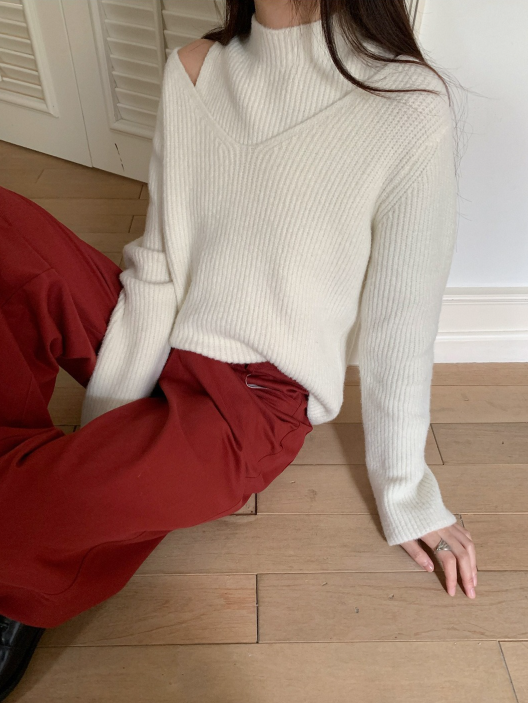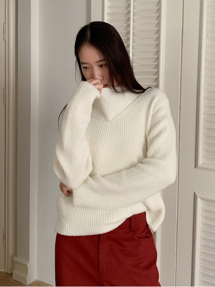 Vネックとプチハイネックタニットのレイヤードが印象的なニットトップス。一枚でスタイリングが完成する計算されたバランスで、肩のラインや襟元の抜け感が大人な印象に。ややルーズなシルエットがこなれたリラックスムードを演出。程よい厚みと柔らかな肌触りで、インナーとしても主役としても活躍します。