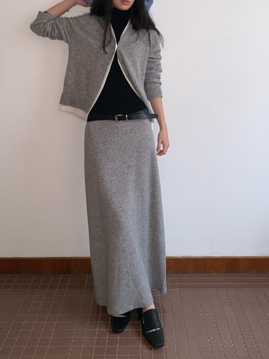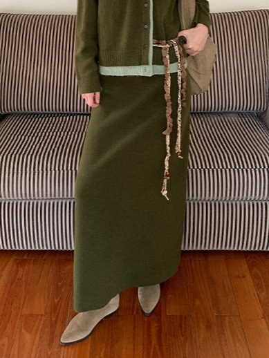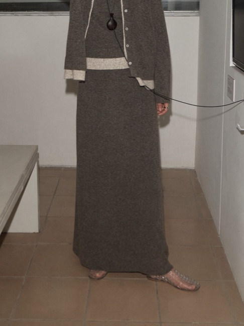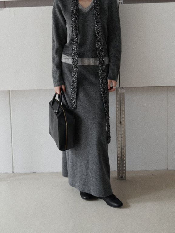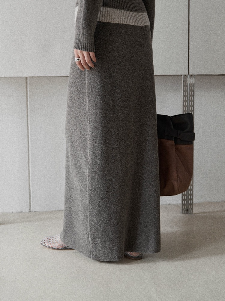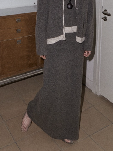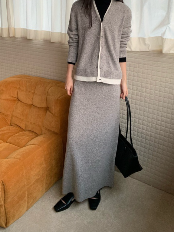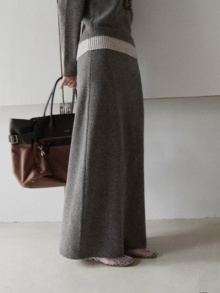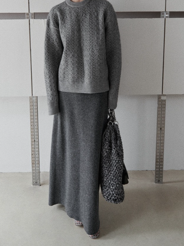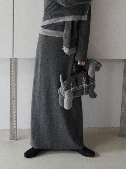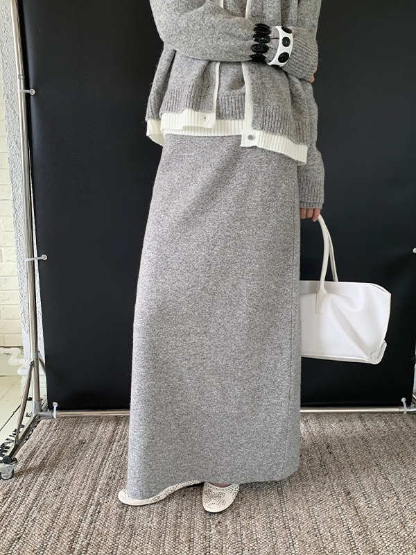 柔らかく身体に沿うラインが美しい、ウール混素材のニットスカート。しなやかで優しい肌触りが魅力で、窮屈さを感じさせないナチュラルなフィット感が特徴です。まっすぐ落ちるシルエットが脚をすっきりと見せ、女性らしさと上品さを両立。同素材のカーディガンやニットトップスと合わせたセットアップスタイルもおすすめです。ミニマルなデザインながらも、質感とシルエットで魅せる一着。季節のムードを引き立てながら、日常を心地よく彩ります。