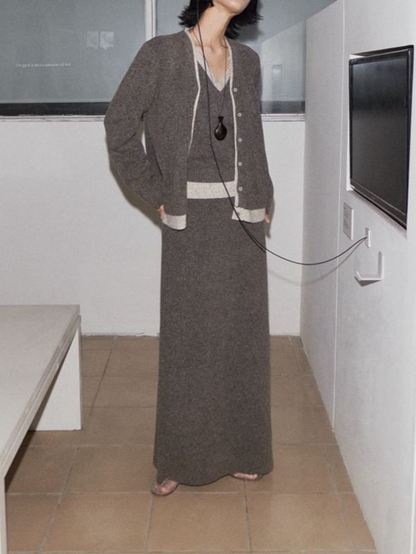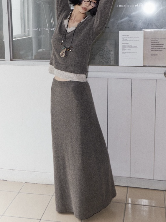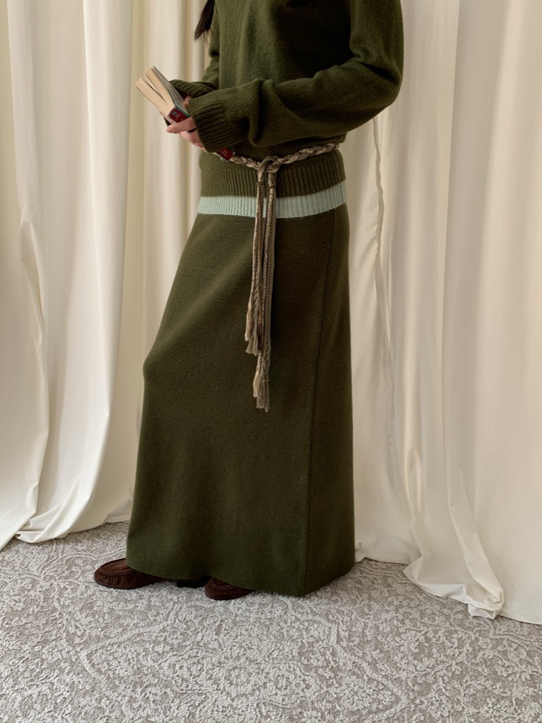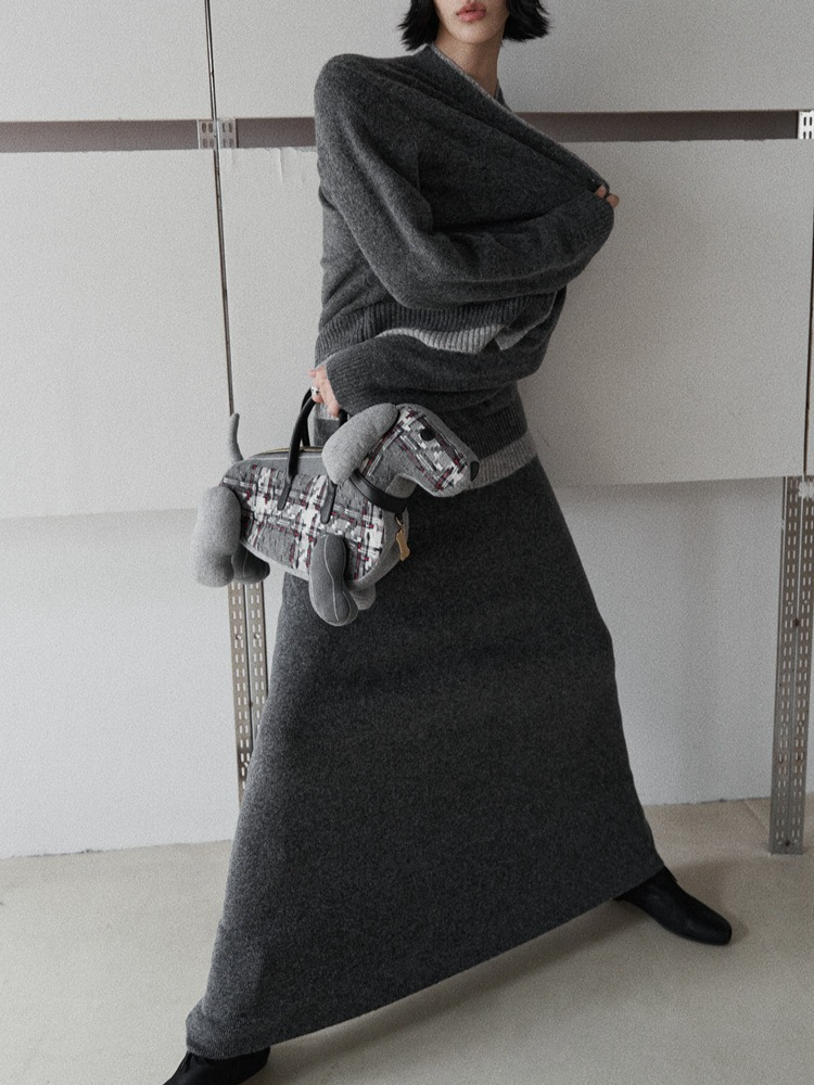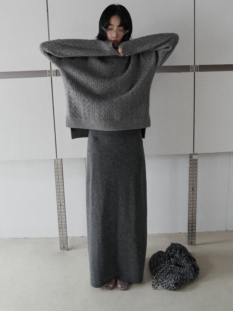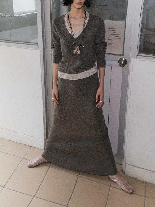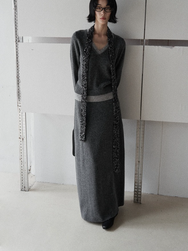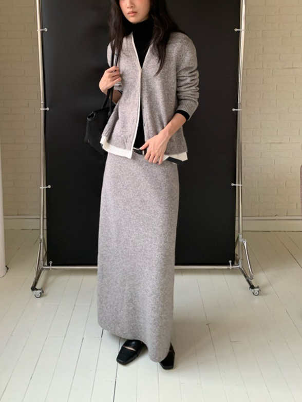 柔らかく身体に沿うラインが美しい、ウール混素材のニットスカート。しなやかで優しい肌触りが魅力で、窮屈さを感じさせないナチュラルなフィット感が特徴です。まっすぐ落ちるシルエットが脚をすっきりと見せ、女性らしさと上品さを両立。同素材のカーディガンやニットトップスと合わせたセットアップスタイルもおすすめです。ミニマルなデザインながらも、質感とシルエットで魅せる一着。季節のムードを引き立てながら、日常を心地よく彩ります。