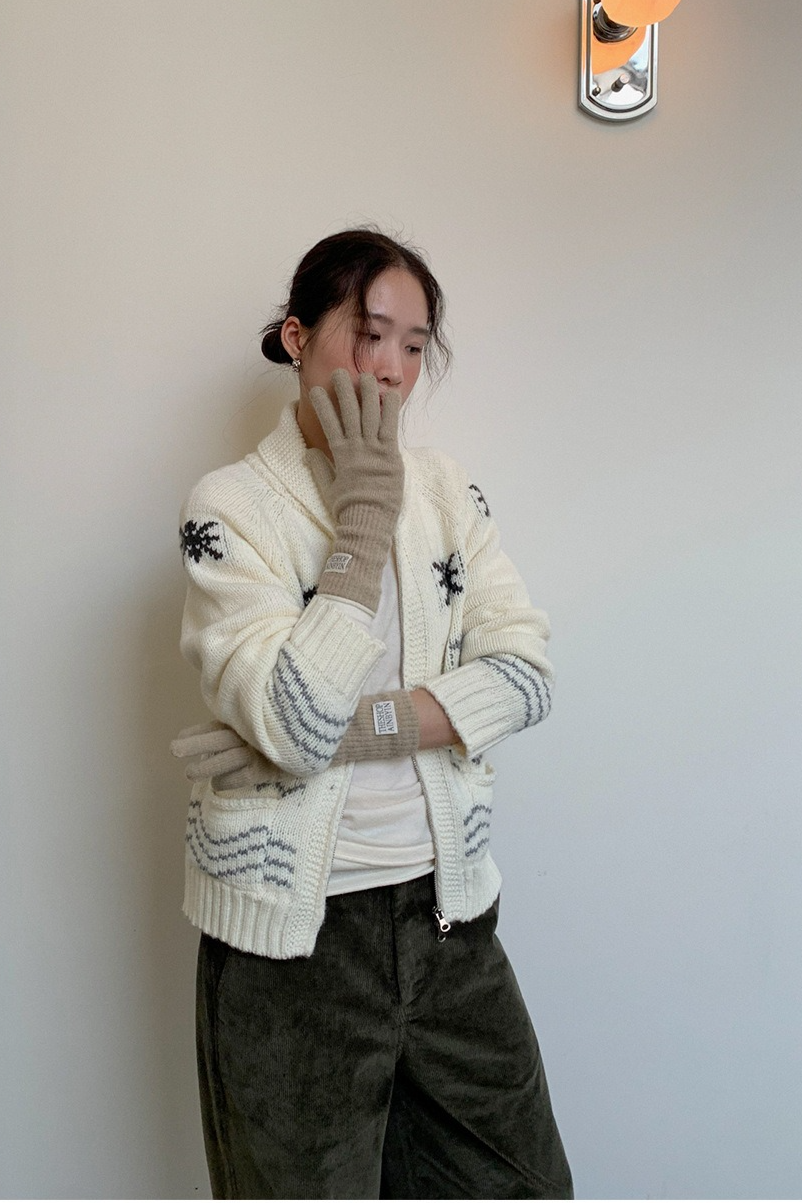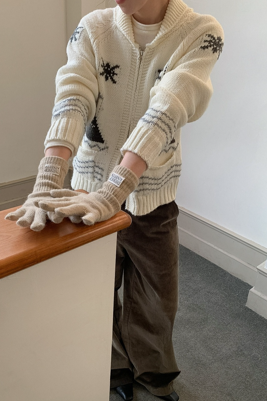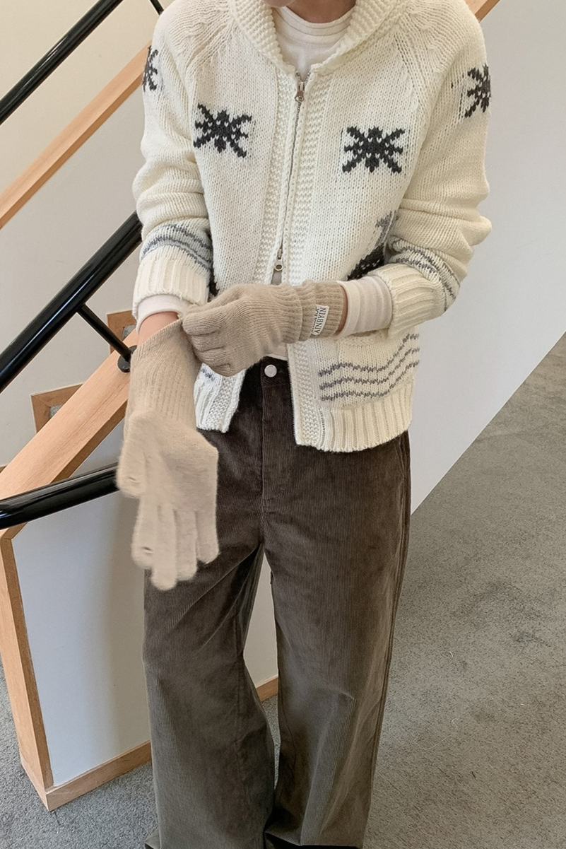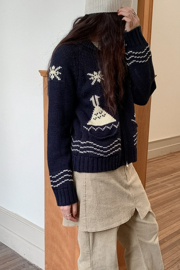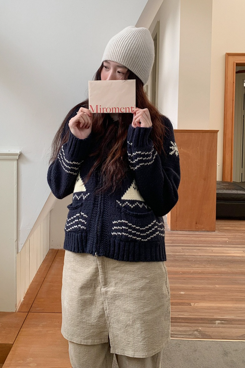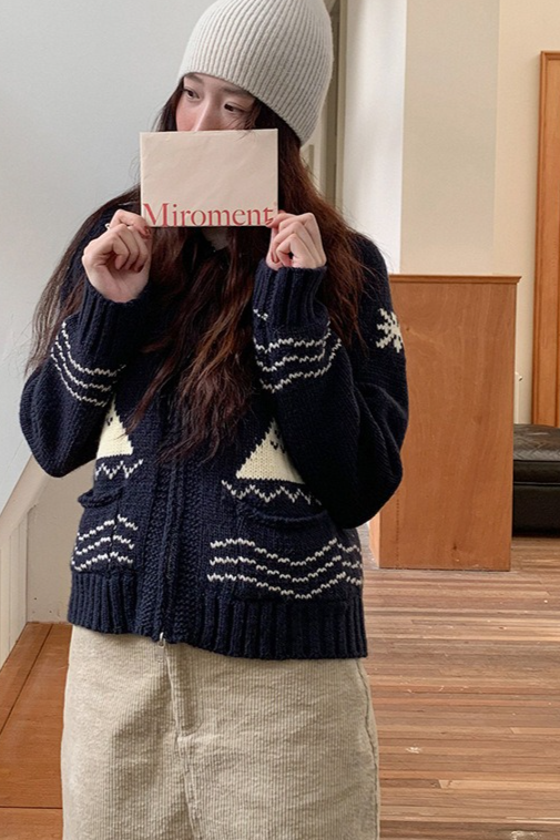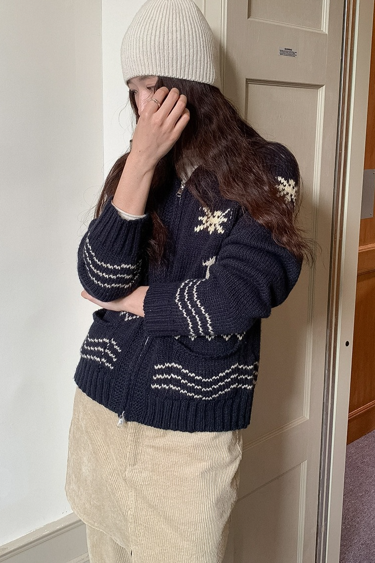 冬らしいノルディック柄が目を惹くジップニット。軽く羽織れるのに暖かく、立ち襟と前開きジップで着こなしの幅も広がります。程よくゆとりのあるシルエットで、パンツにもスカートにも合わせやすいバランス。羊毛混の柔らかな生地感が心地よく、デイリーに使いやすい一枚です。