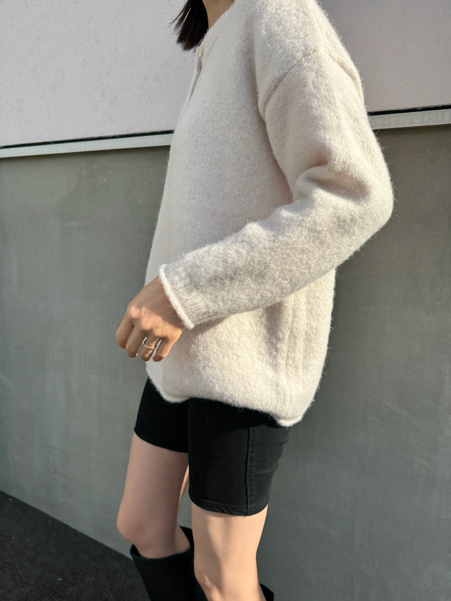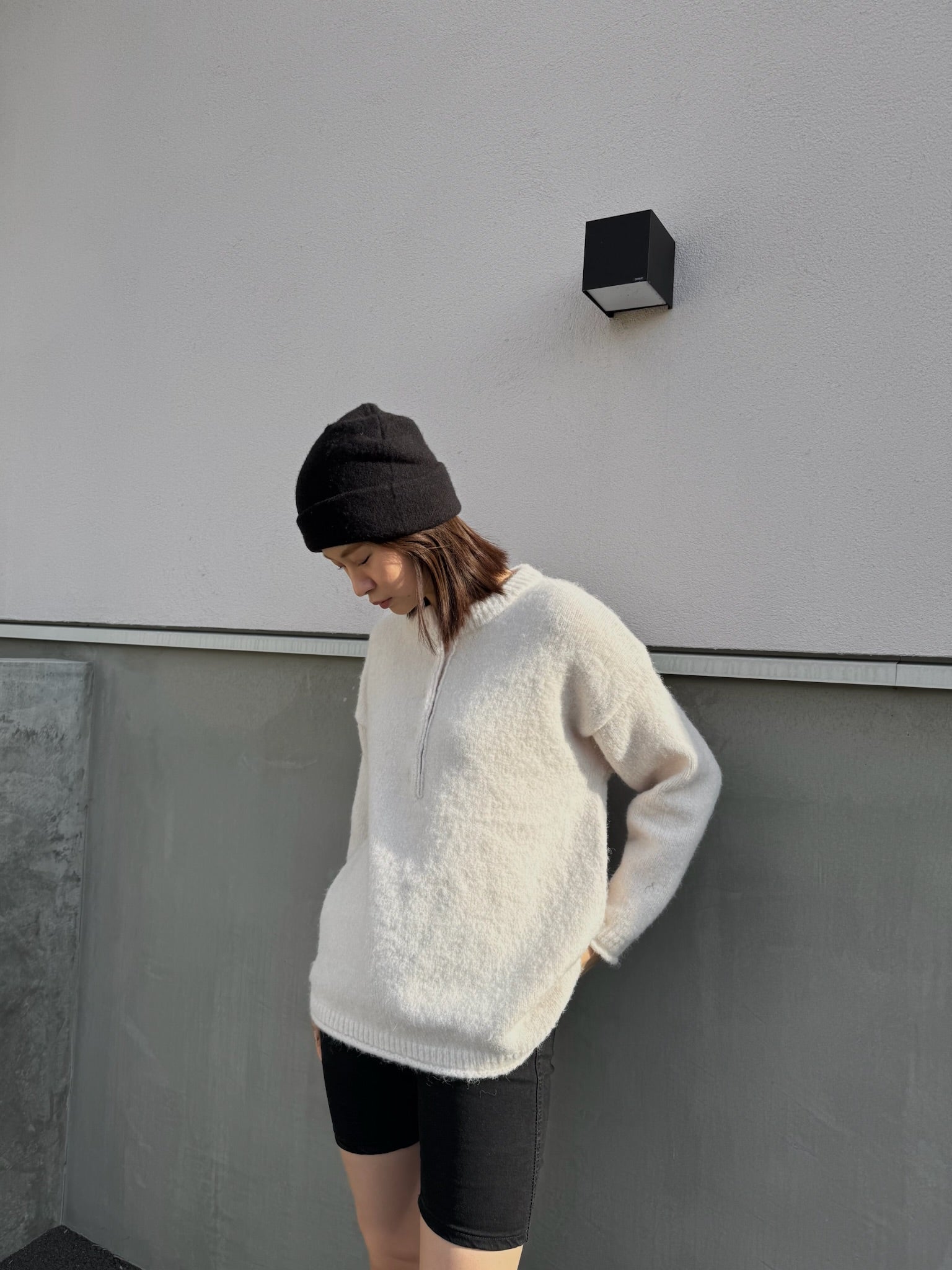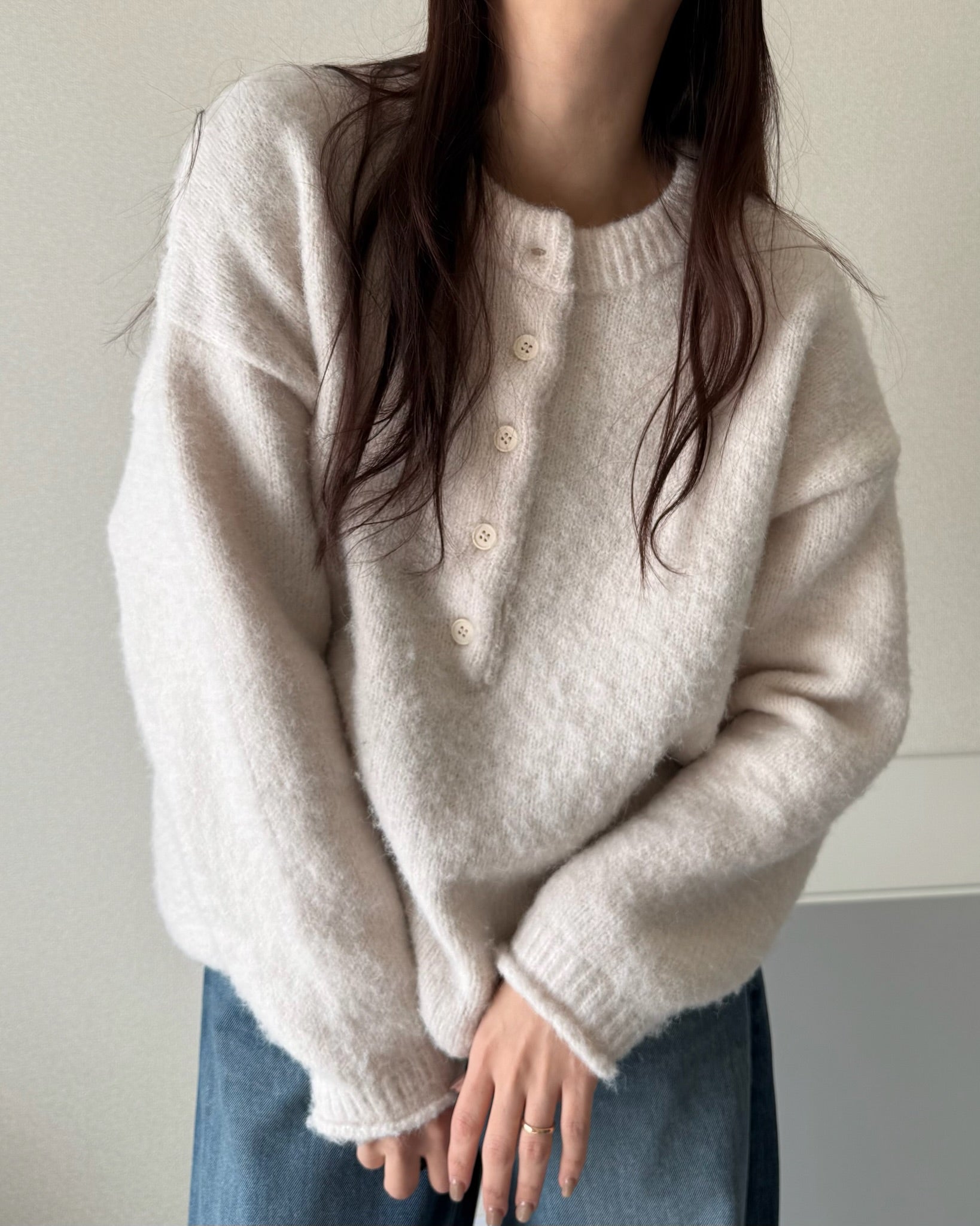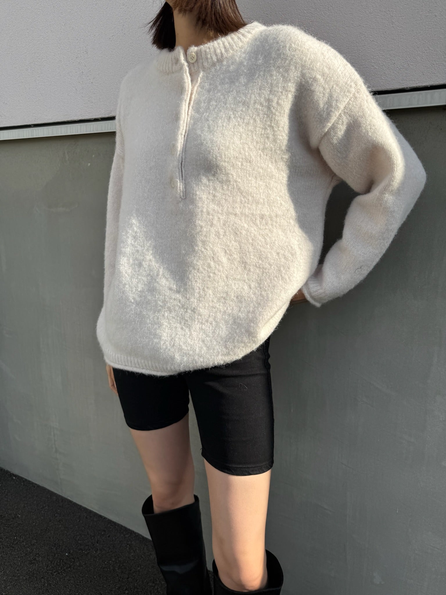 太めのリブをきかせたヘンリーネックが印象的な、オーバーサイズニット。