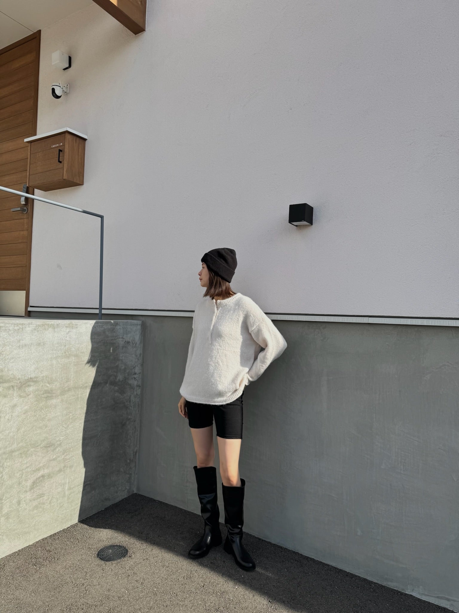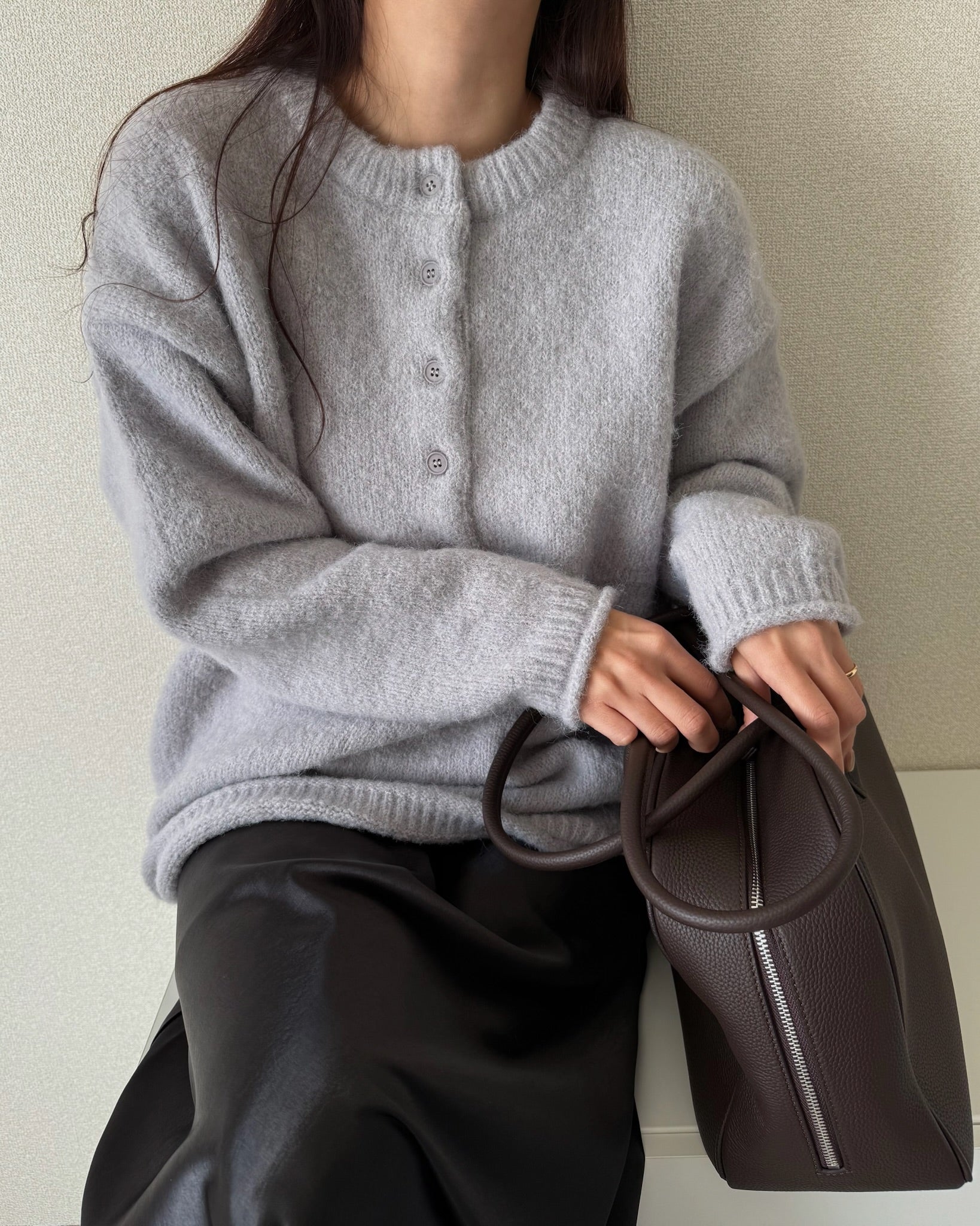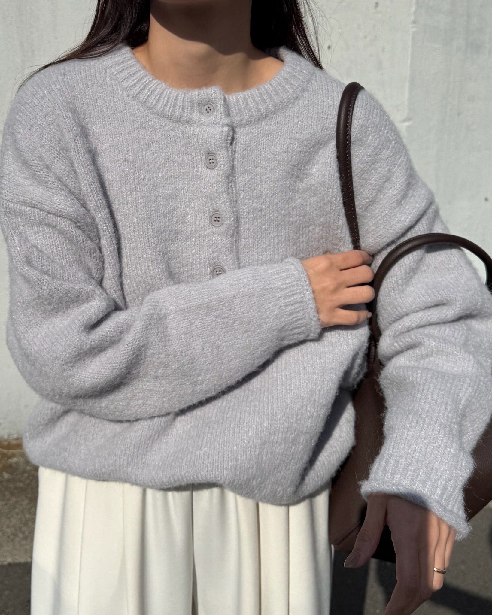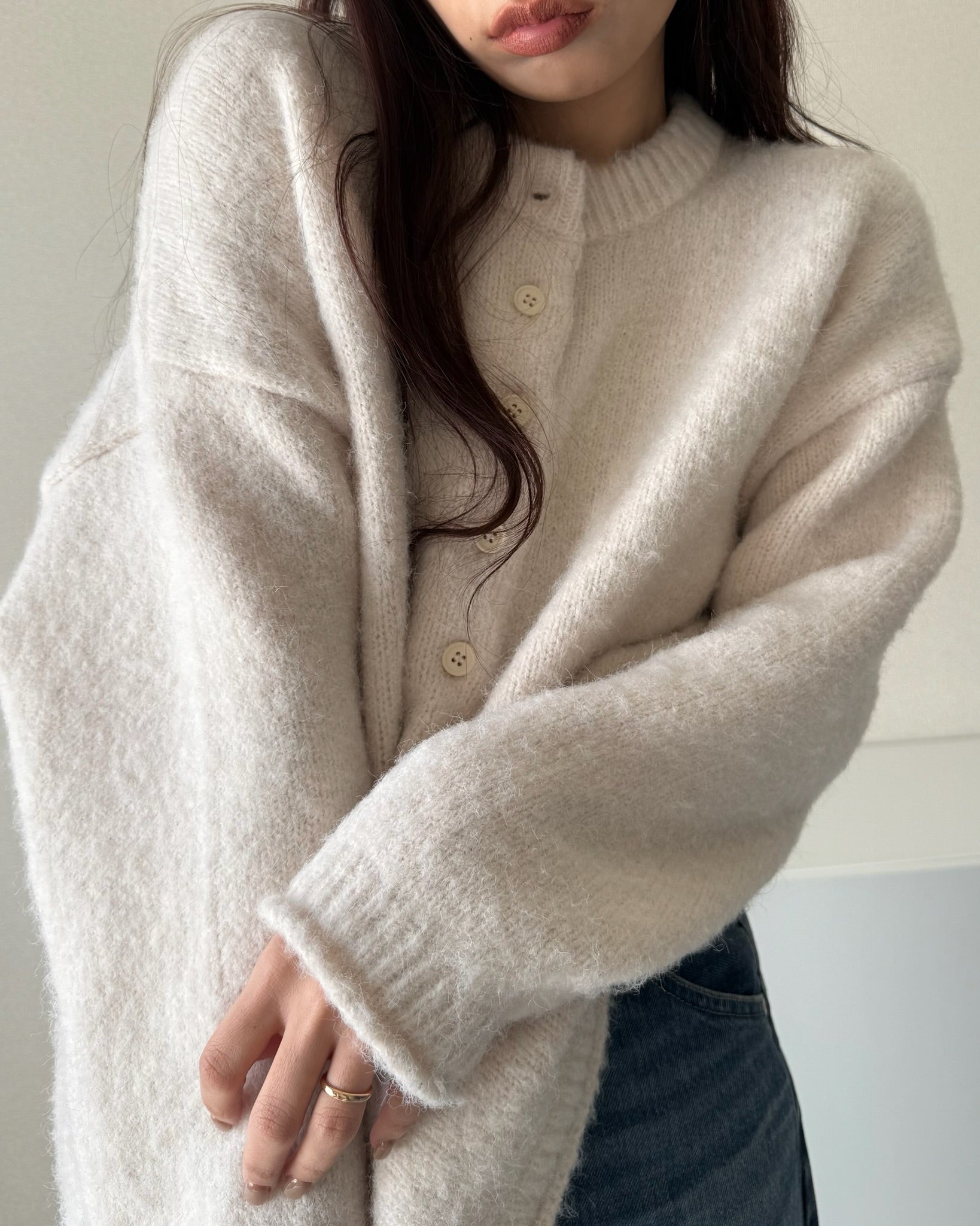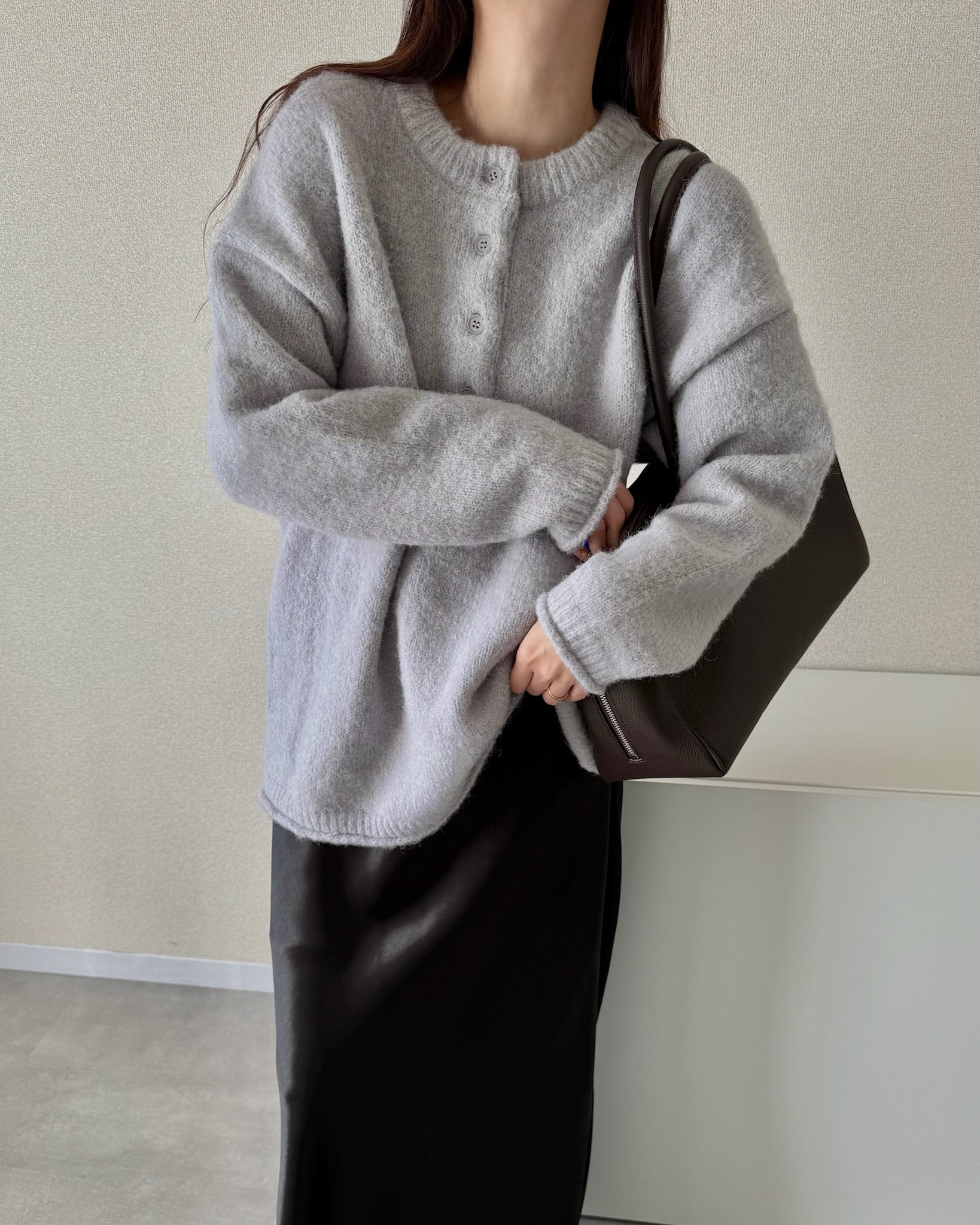 太めのリブをきかせたヘンリーネックが印象的な、オーバーサイズニット。