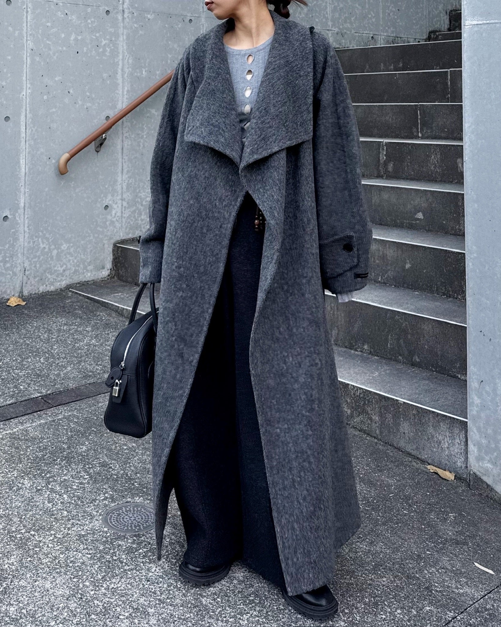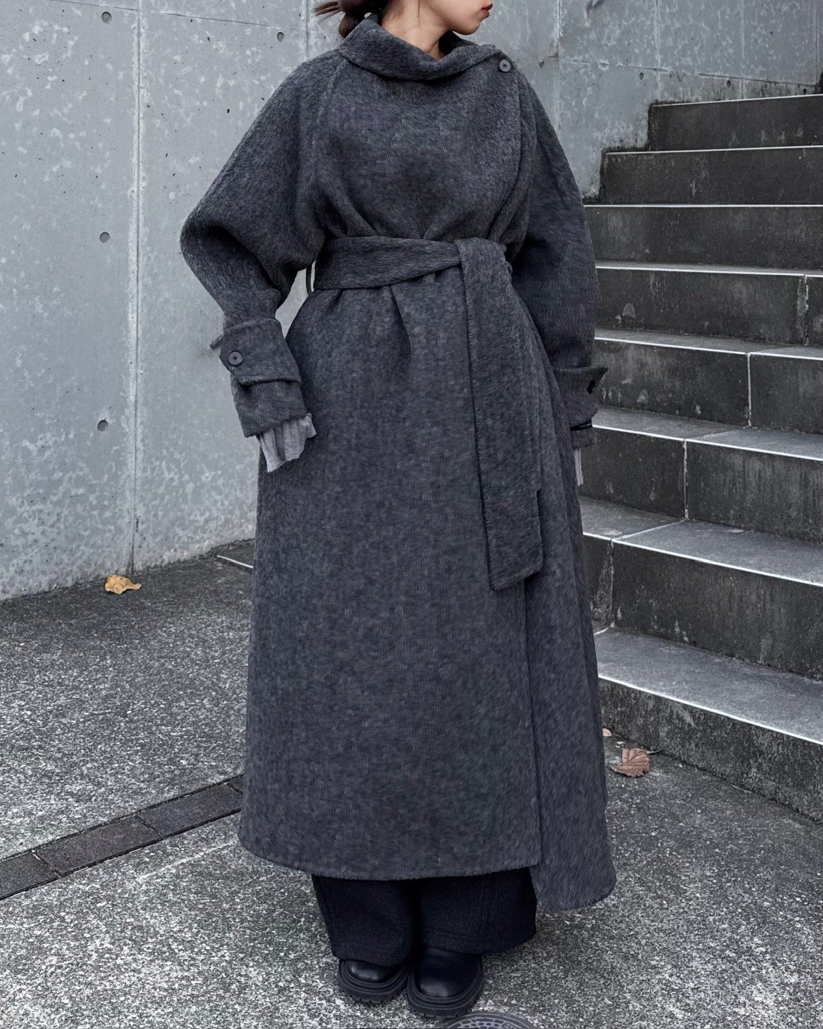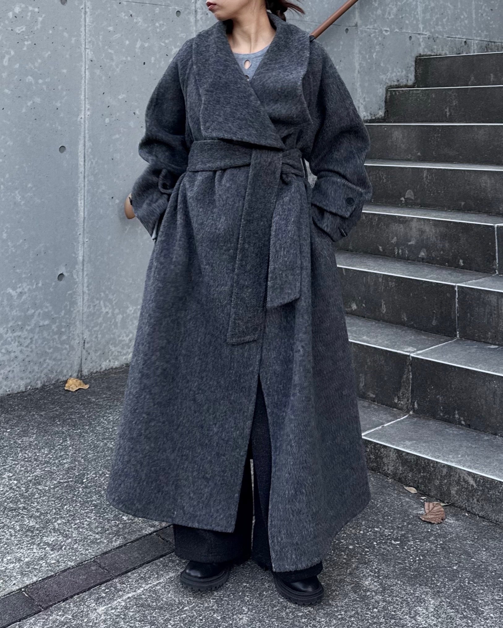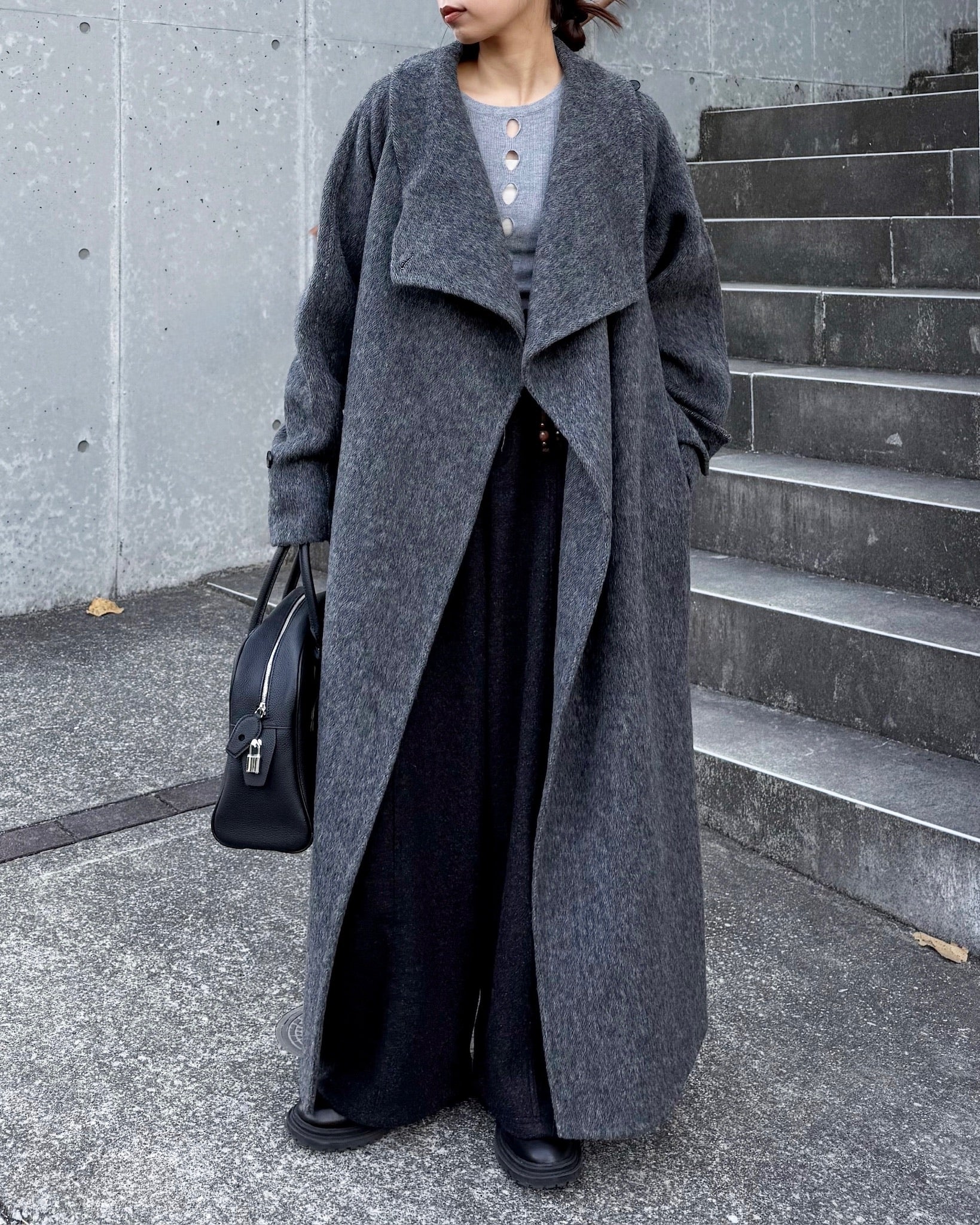 すっきりと直線的なシルエットが美しく、ミニマルながら存在感のある一着です。