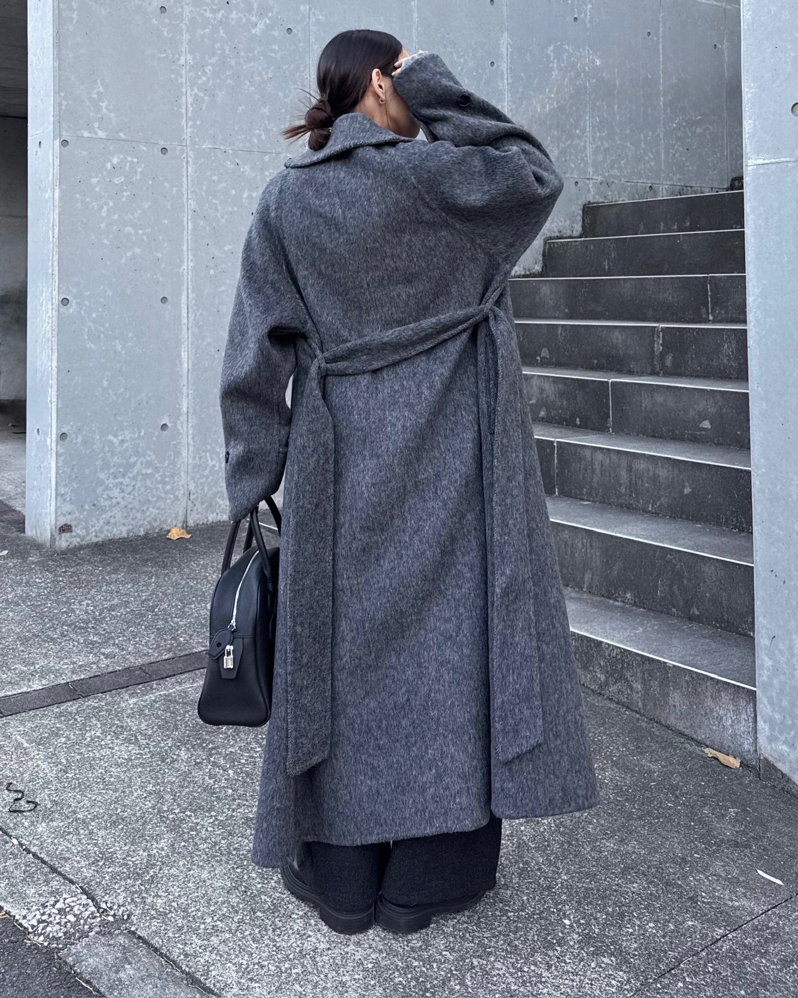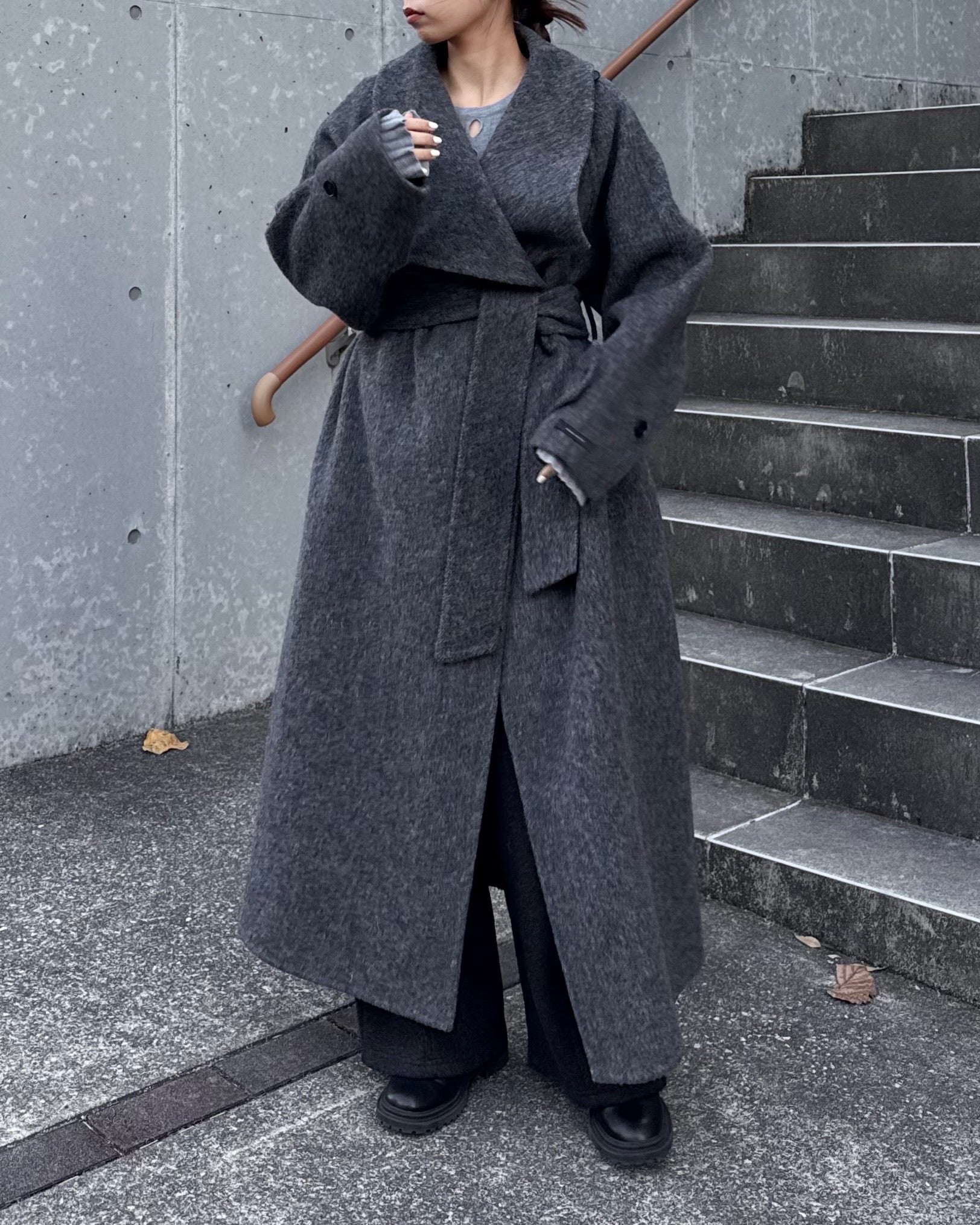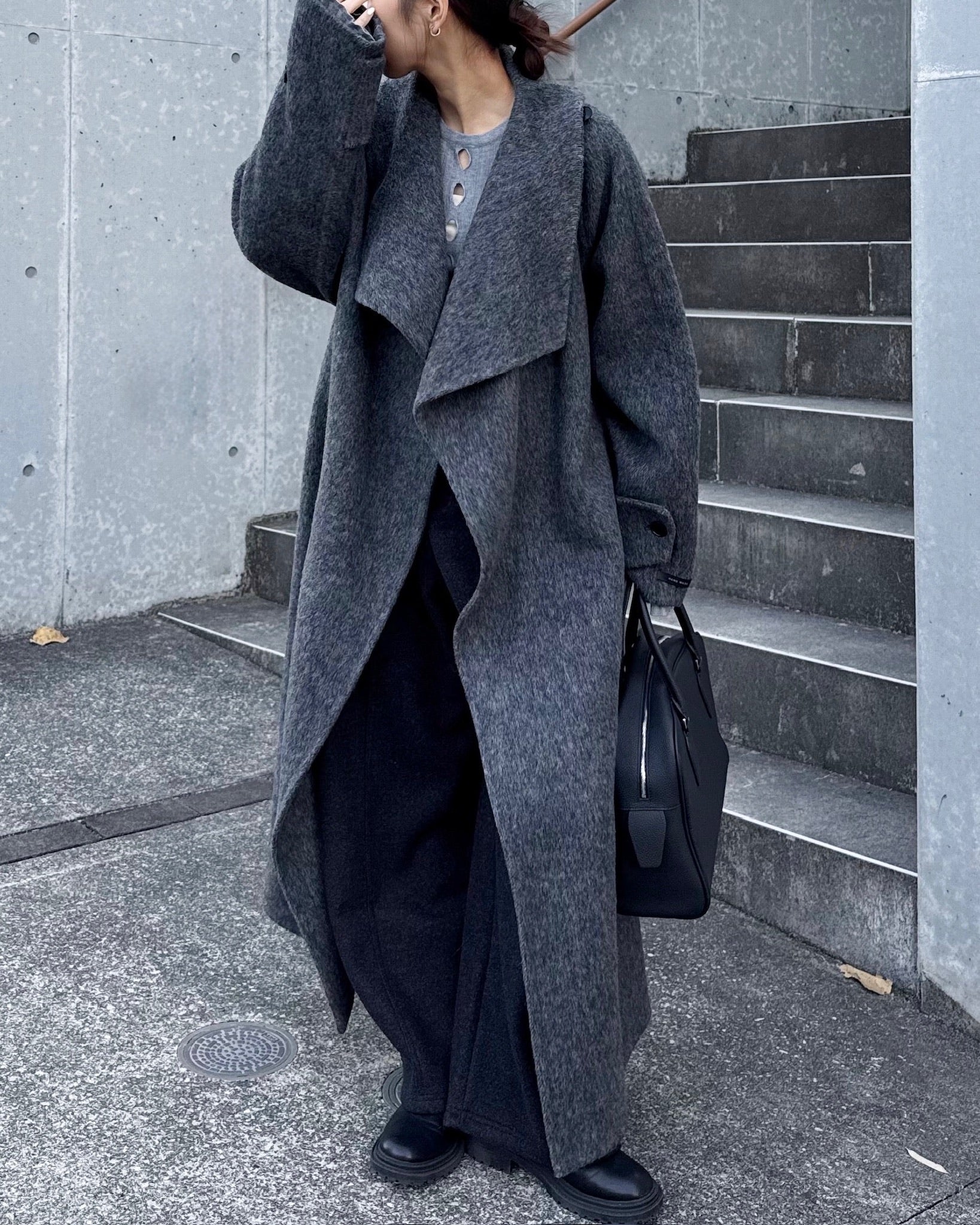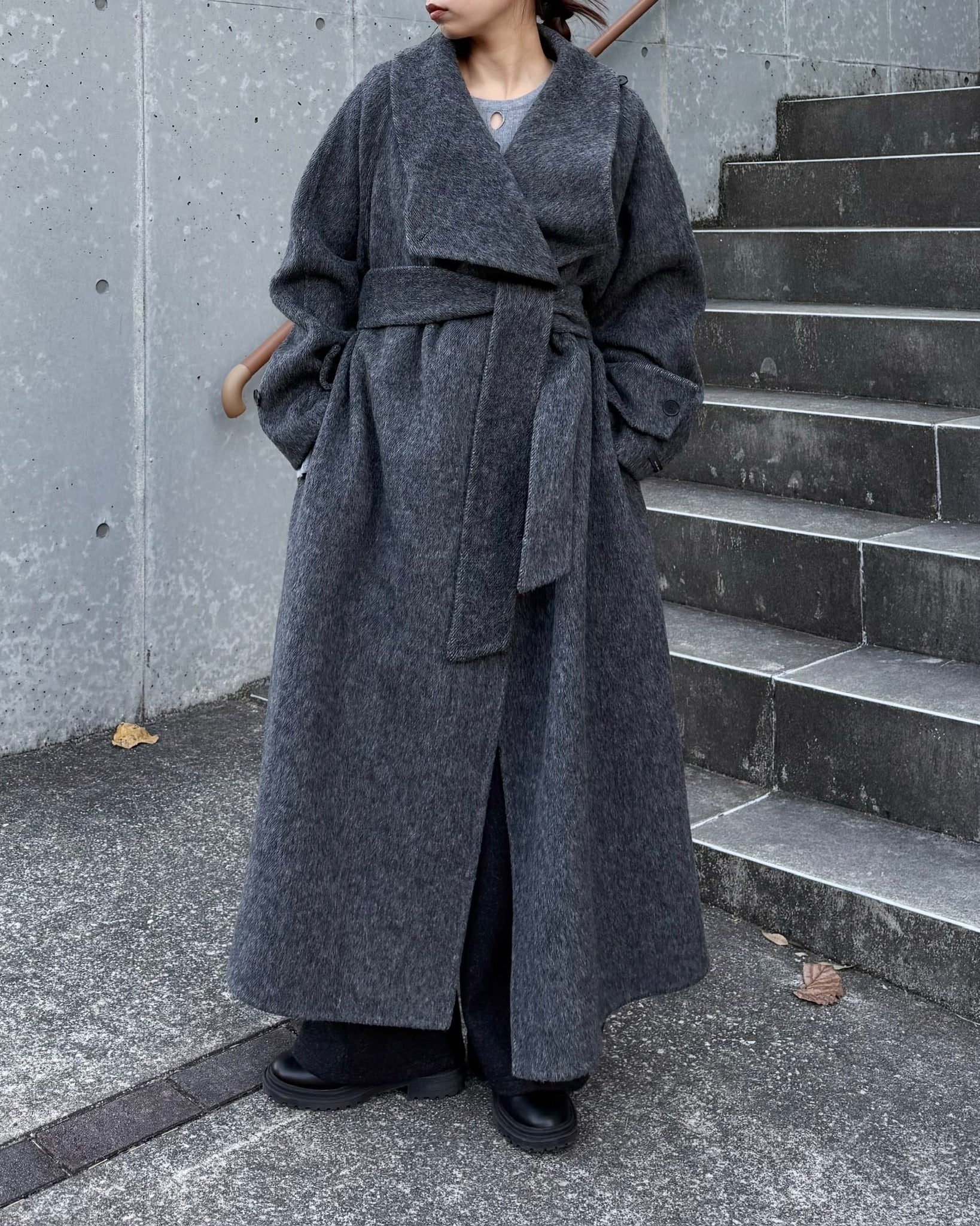 すっきりと直線的なシルエットが美しく、ミニマルながら存在感のある一着です。