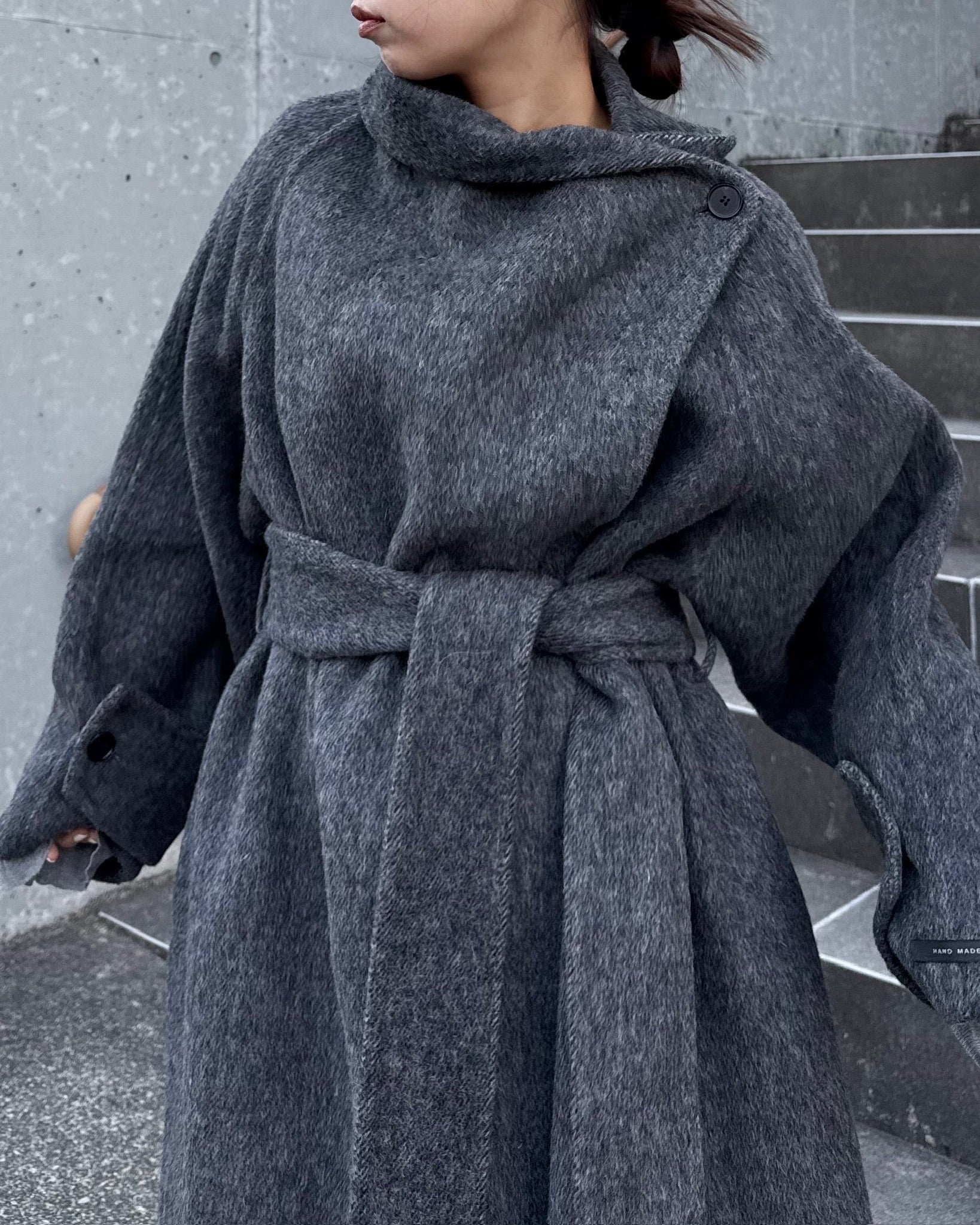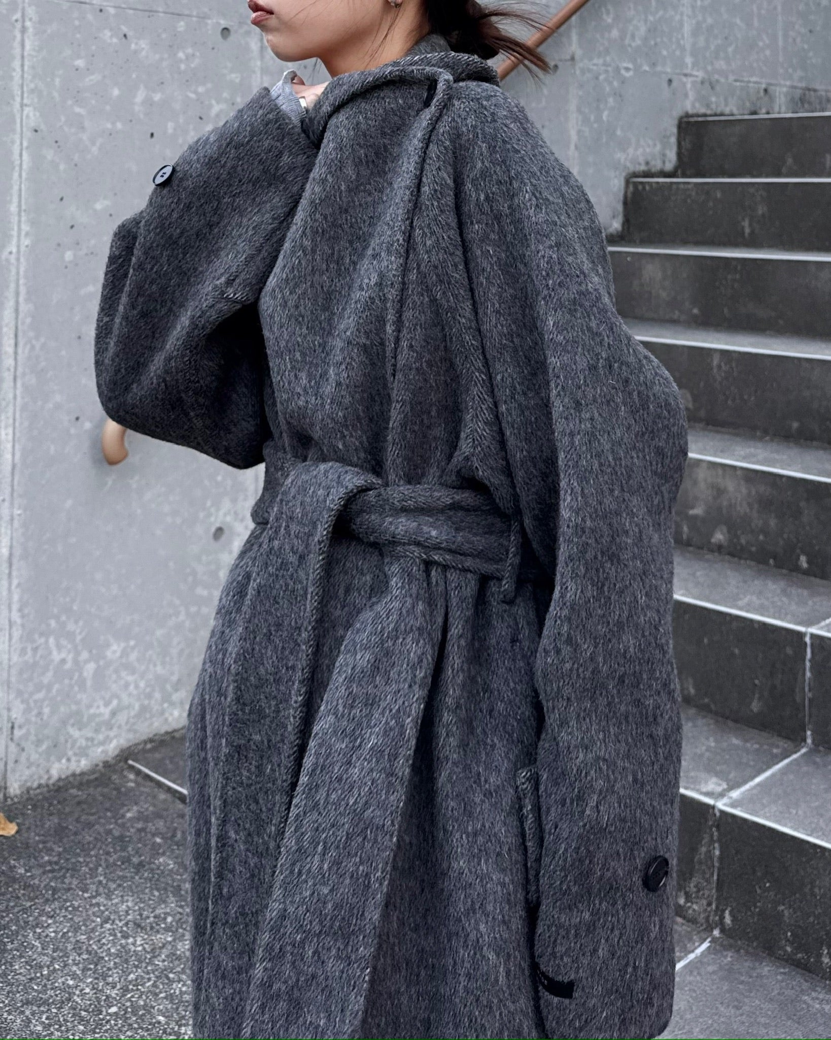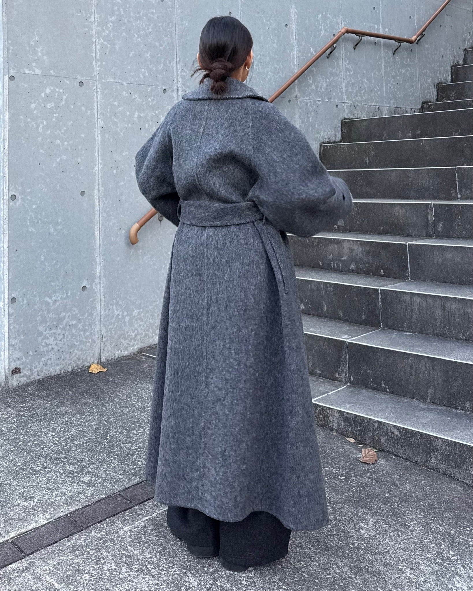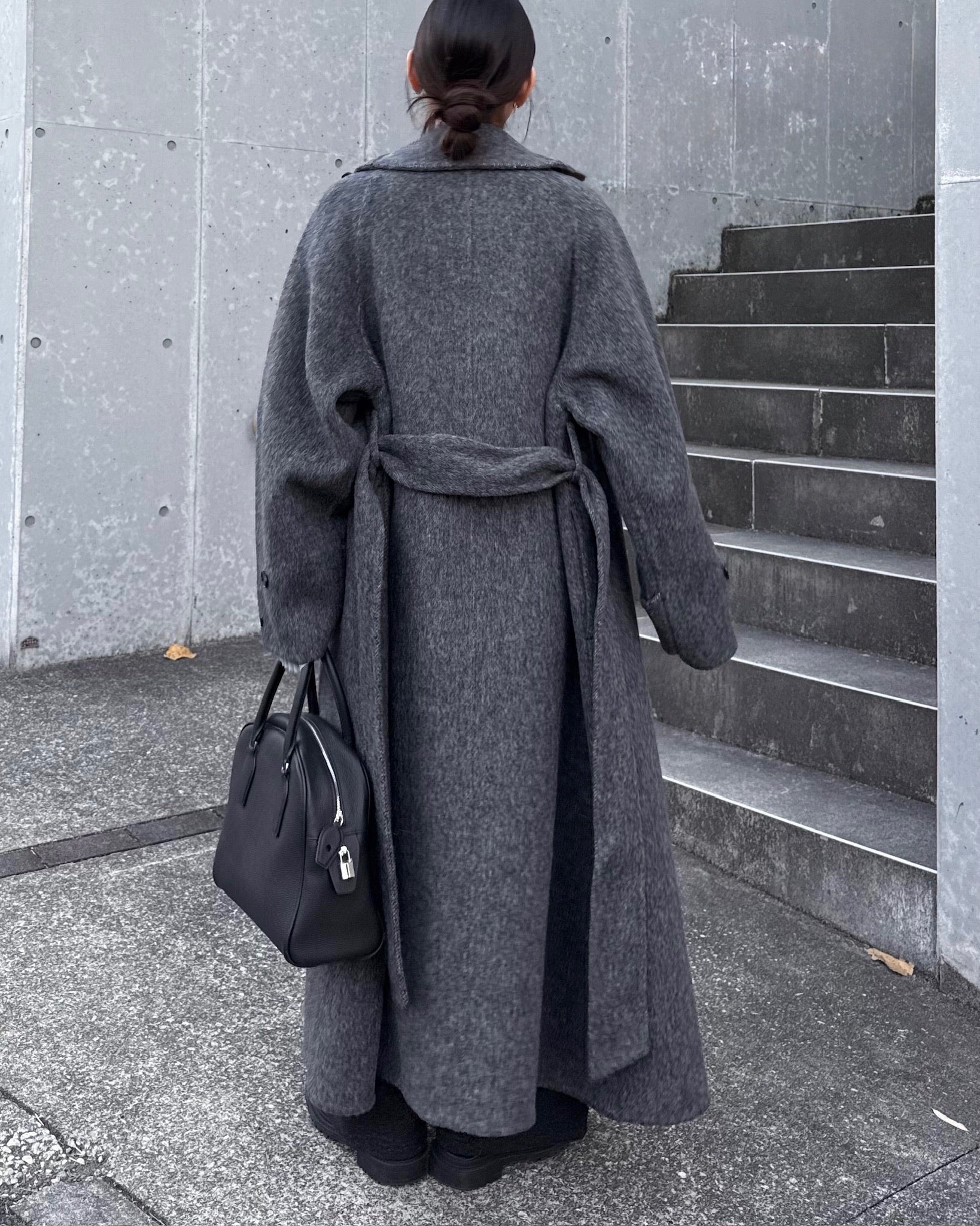 すっきりと直線的なシルエットが美しく、ミニマルながら存在感のある一着です。