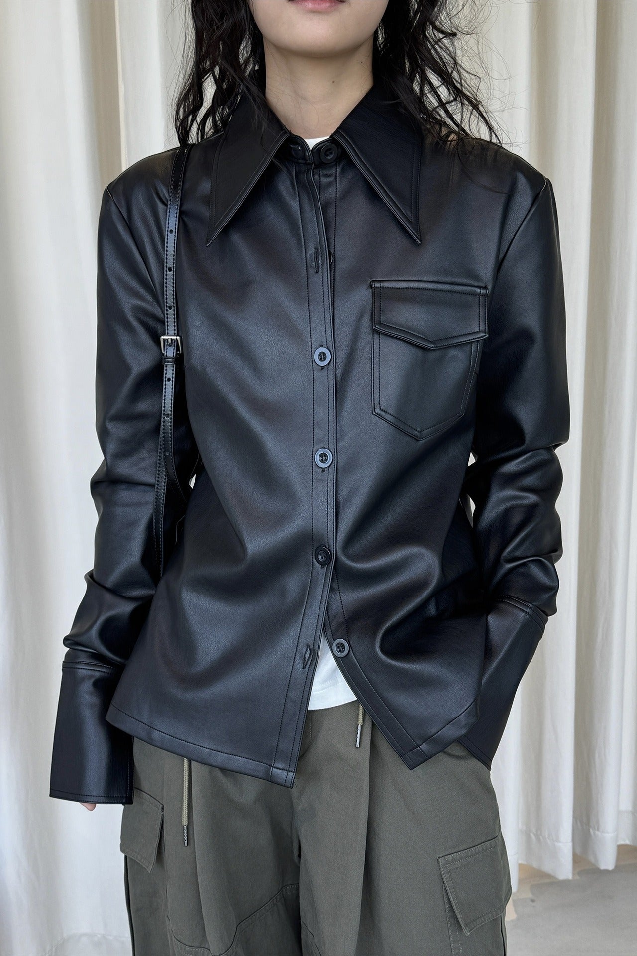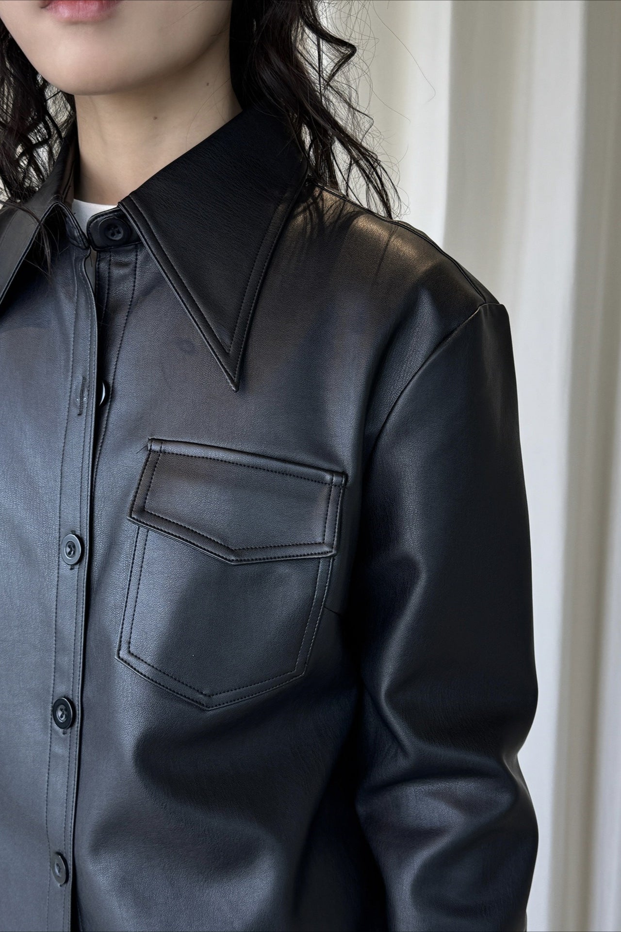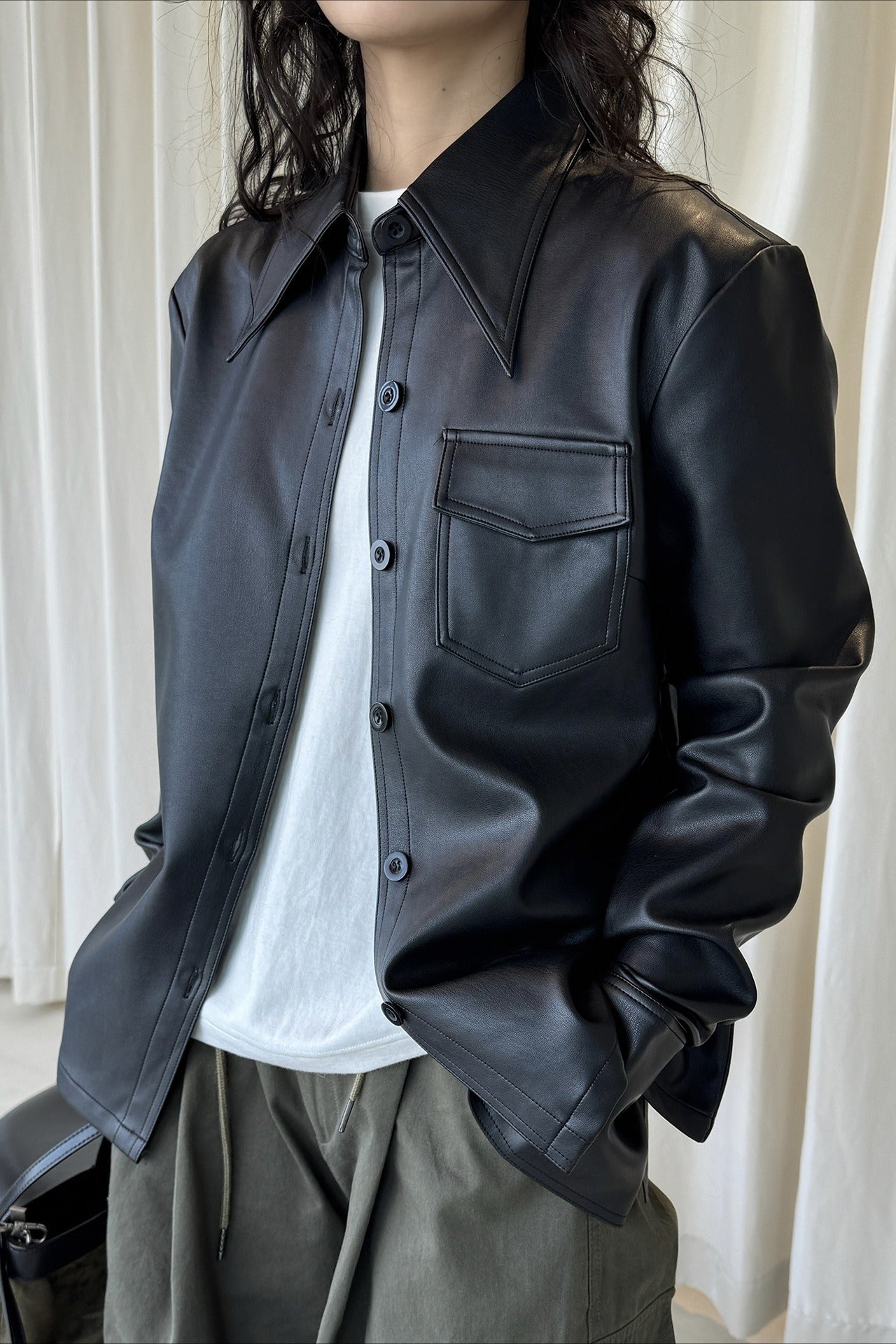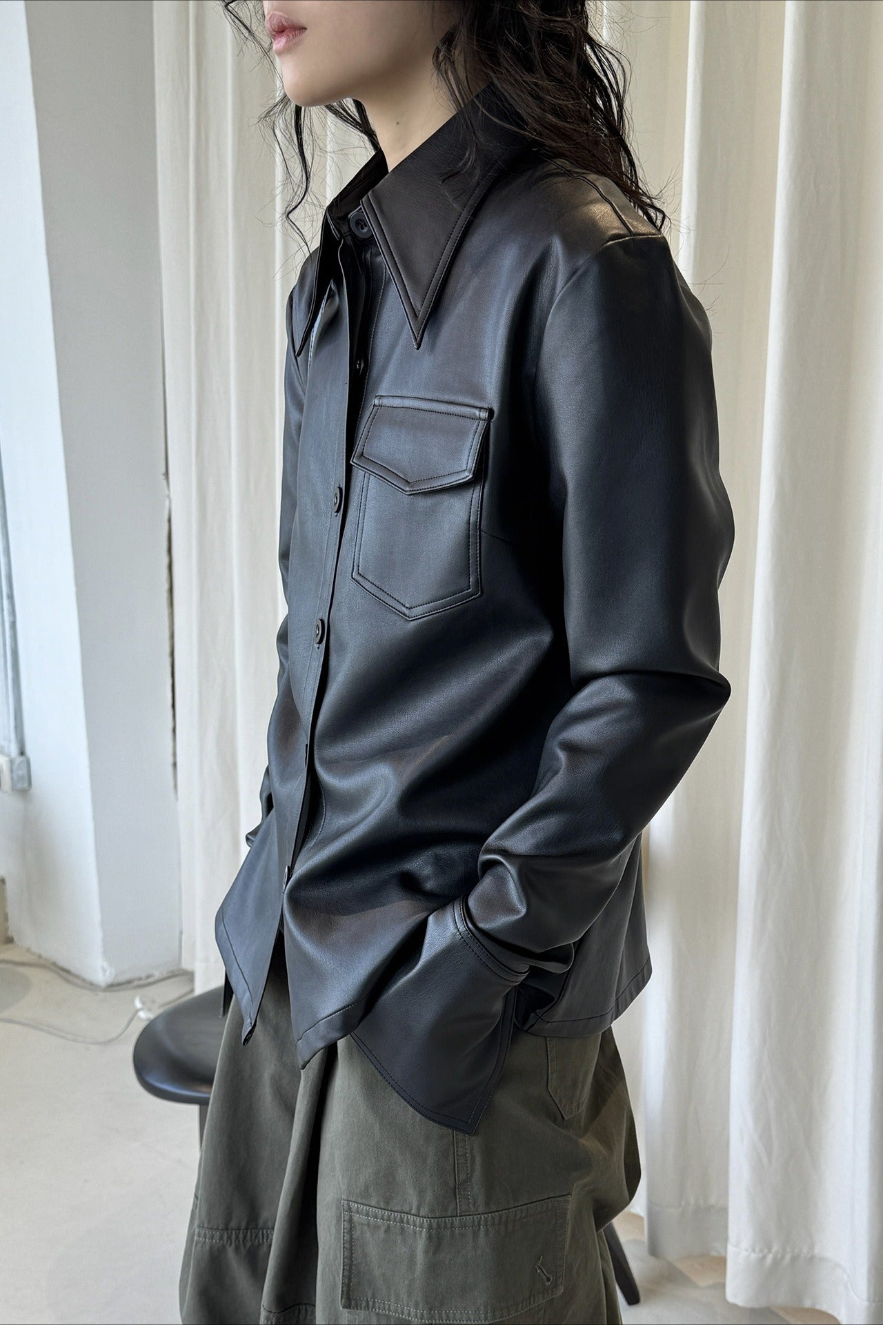 なめらかな質感が魅力のフェイクレザーシャツジャケット。上品な光沢と自然な落ち感があり、ハードになりすぎず大人のスタイリングに馴染みます。程よくゆとりのあるシルエットで、シャツ感覚でも軽い羽織としても着用可能。ミニマルなデザインに胸ポケットを添え、デニムやワイドパンツとも相性が良くおすすめです。