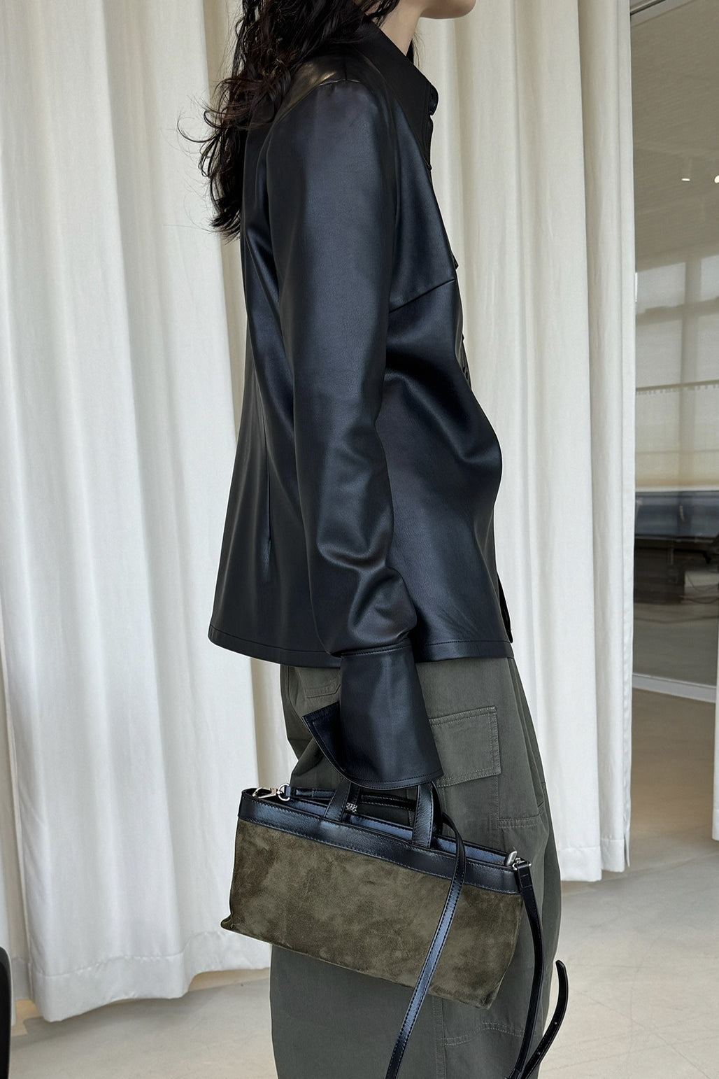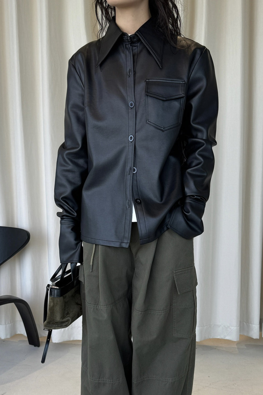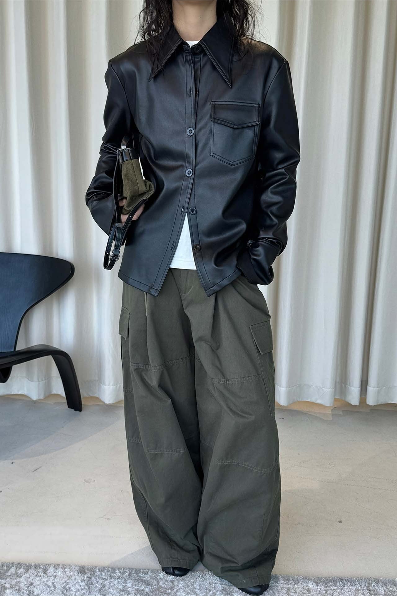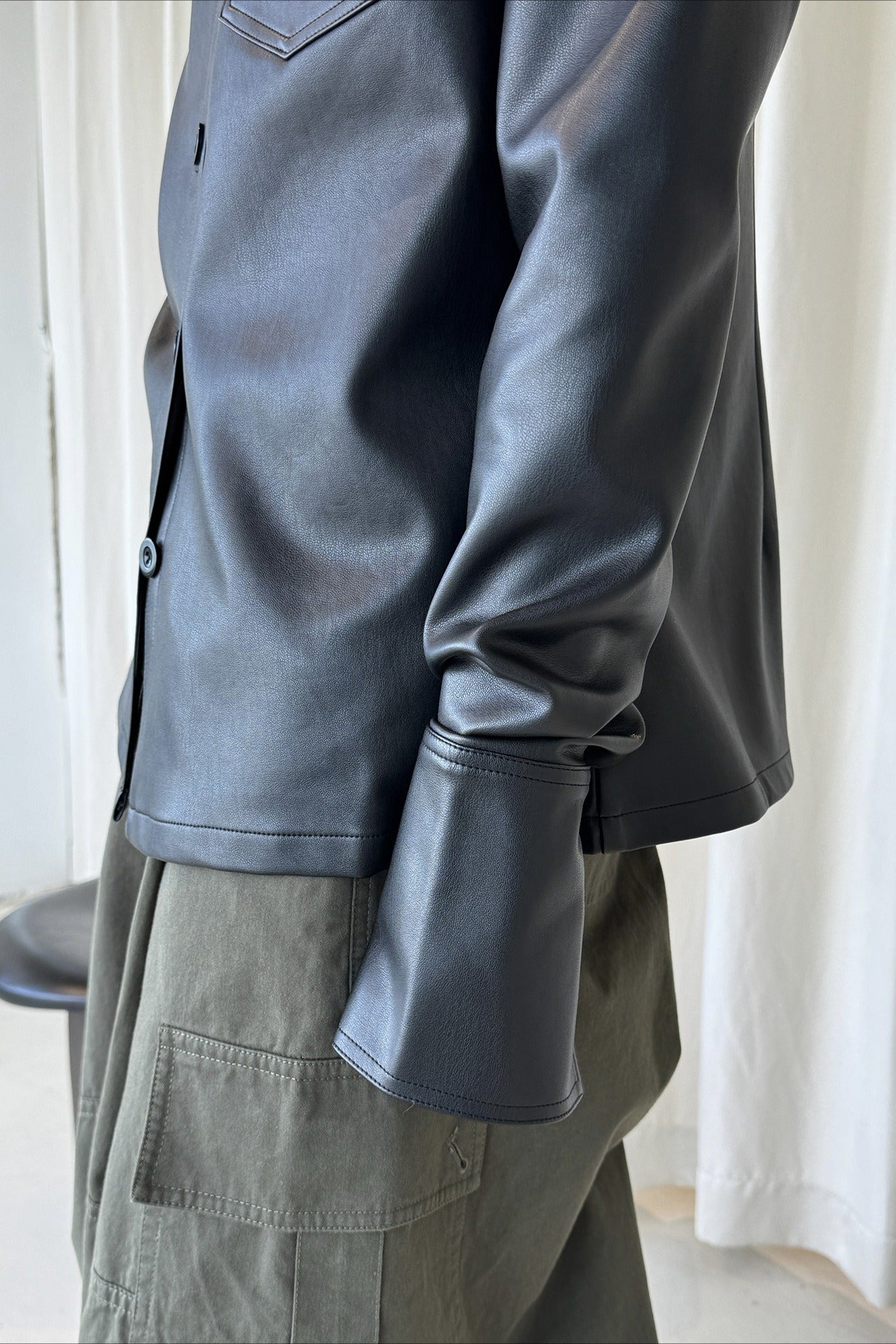 なめらかな質感が魅力のフェイクレザーシャツジャケット。上品な光沢と自然な落ち感があり、ハードになりすぎず大人のスタイリングに馴染みます。程よくゆとりのあるシルエットで、シャツ感覚でも軽い羽織としても着用可能。ミニマルなデザインに胸ポケットを添え、デニムやワイドパンツとも相性が良くおすすめです。