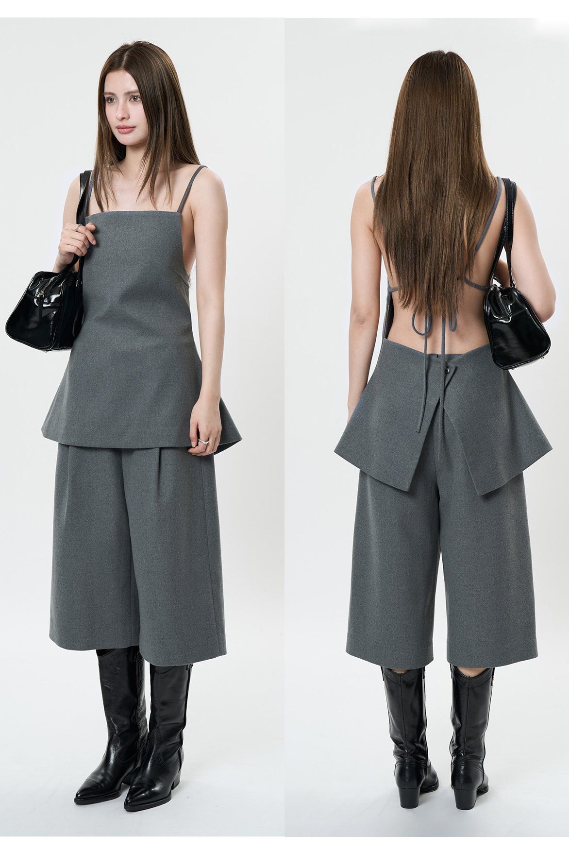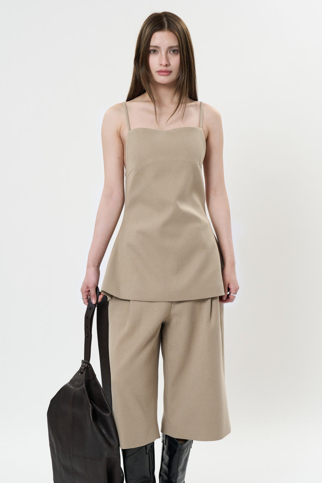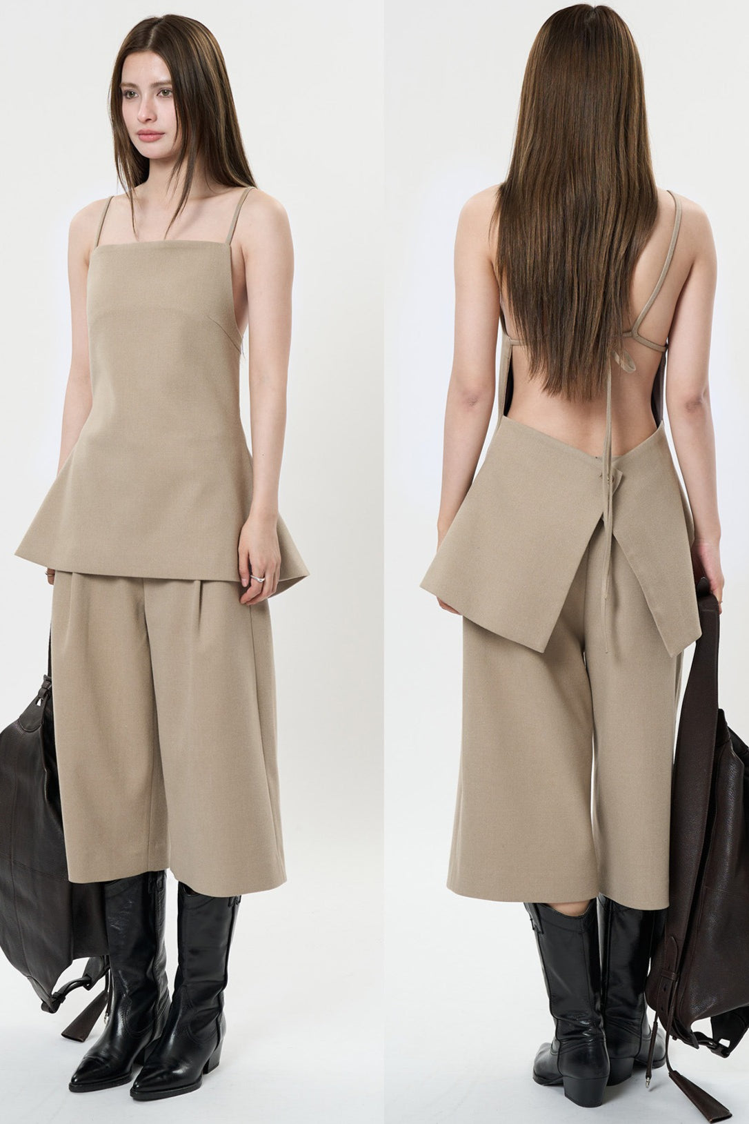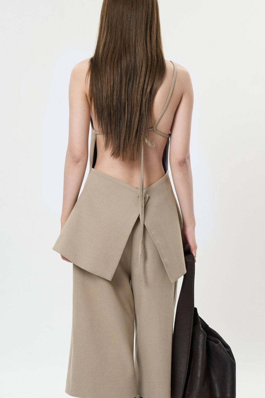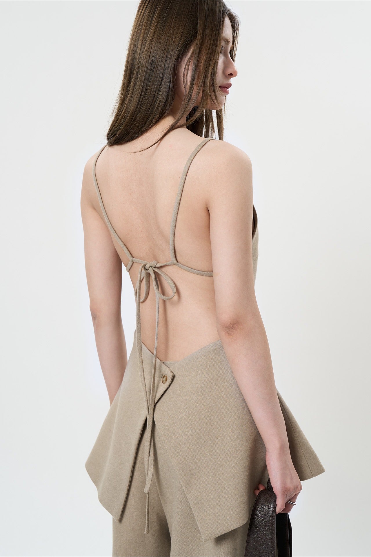 背中のリボンディテールが印象的なキャミソールベスト。フロントはミニマルに仕上げ、バックスタイルでさりげない女性らしさを演出します。程よく身体に沿うシルエットと落ち感のある素材が、大人の抜け感をプラス。単品でも、同素材ボトムスと合わせたセットアップでも洗練された着こなしが楽しめます。