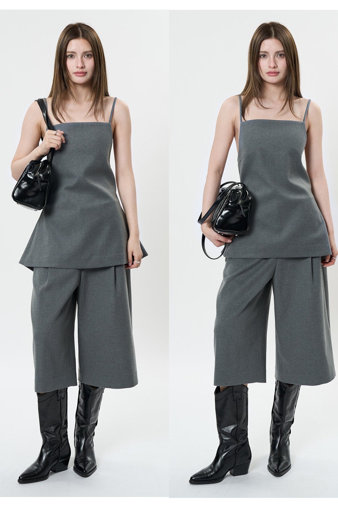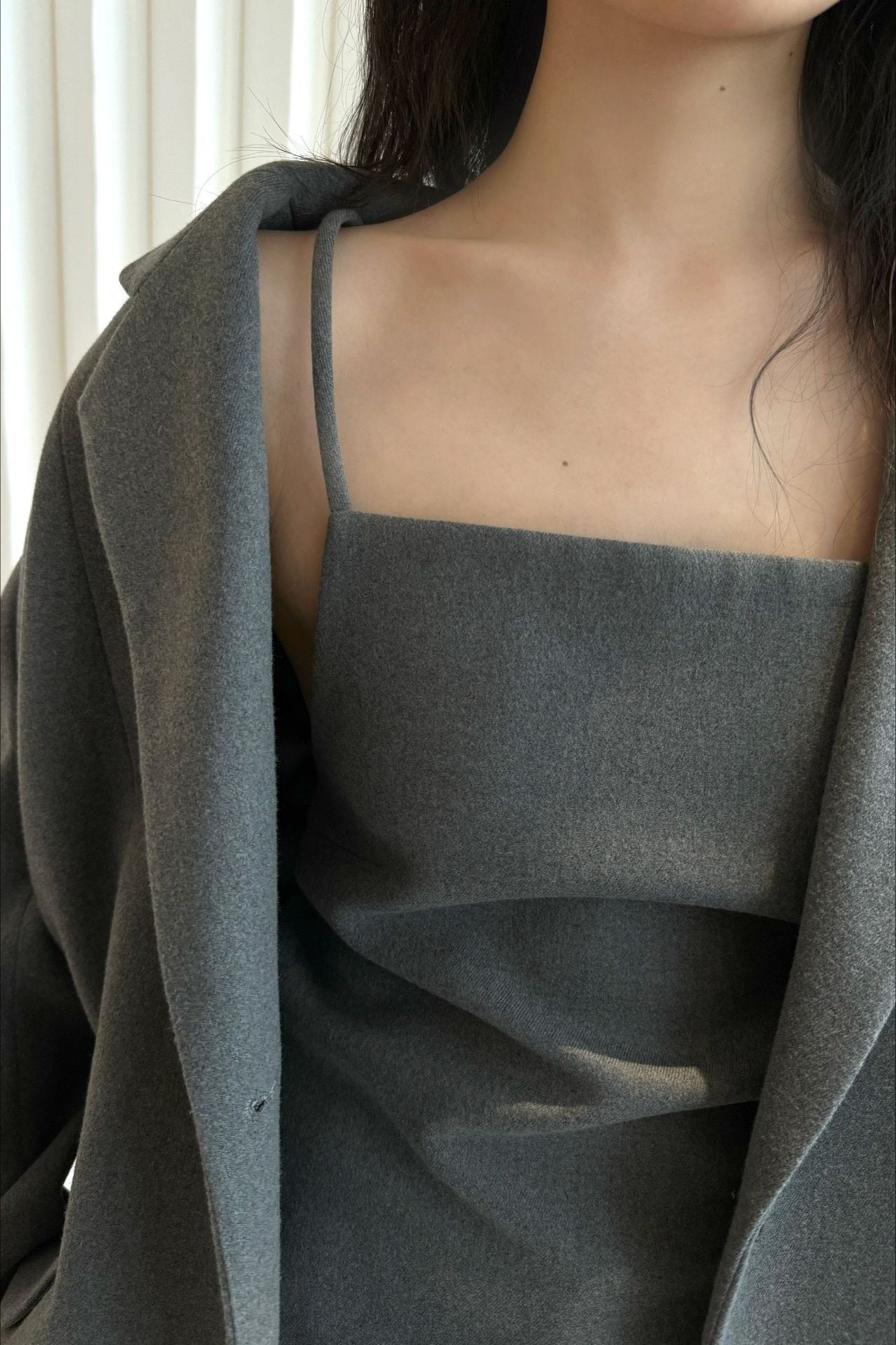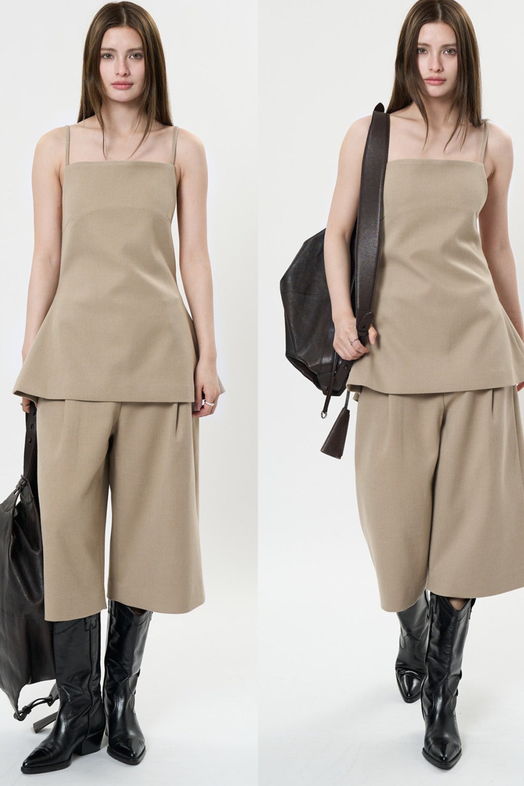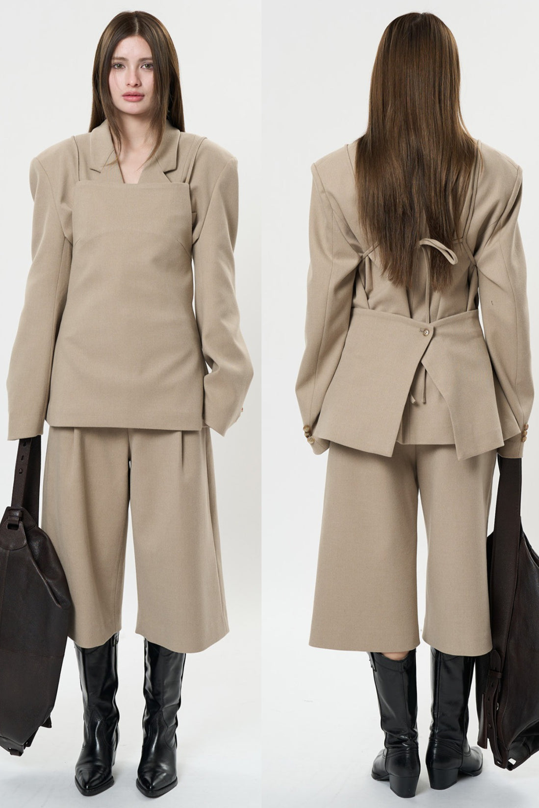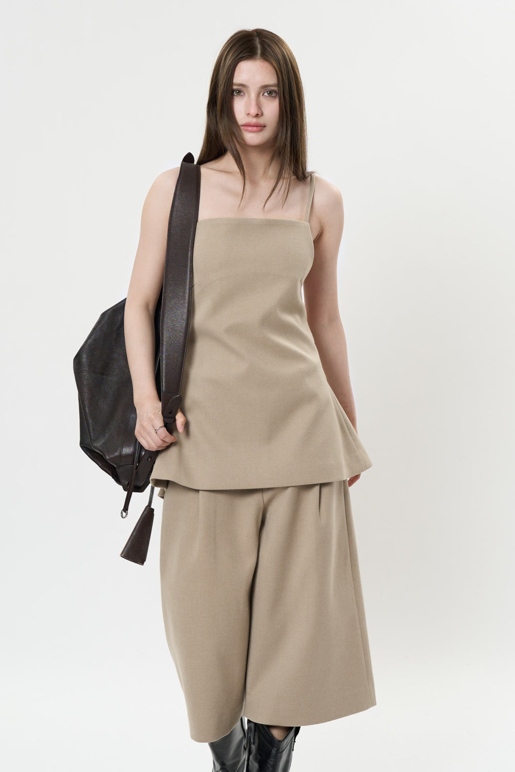 背中のリボンディテールが印象的なキャミソールベスト。フロントはミニマルに仕上げ、バックスタイルでさりげない女性らしさを演出します。程よく身体に沿うシルエットと落ち感のある素材が、大人の抜け感をプラス。単品でも、同素材ボトムスと合わせたセットアップでも洗練された着こなしが楽しめます。