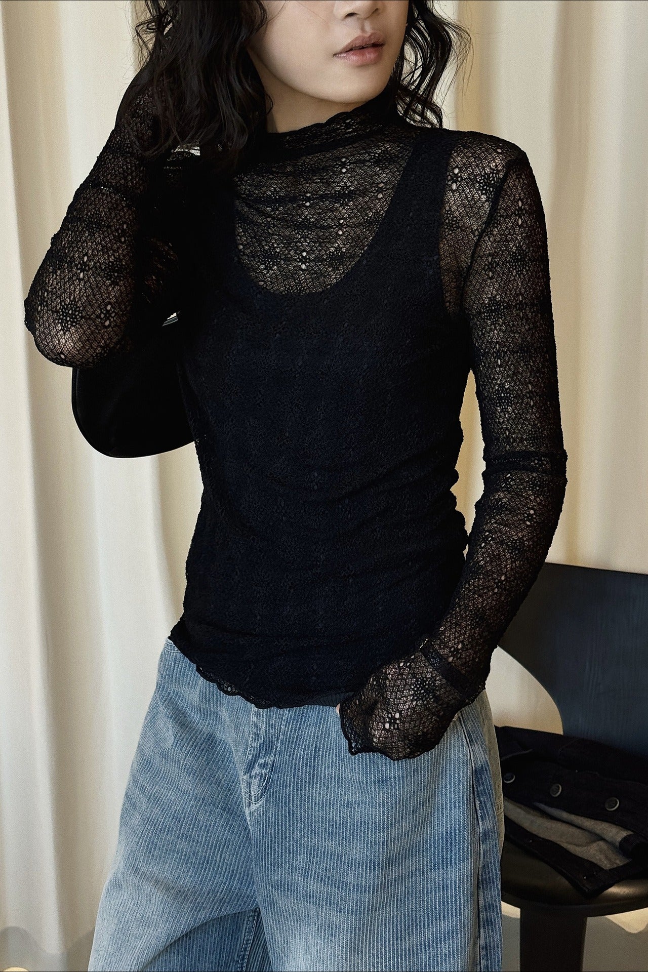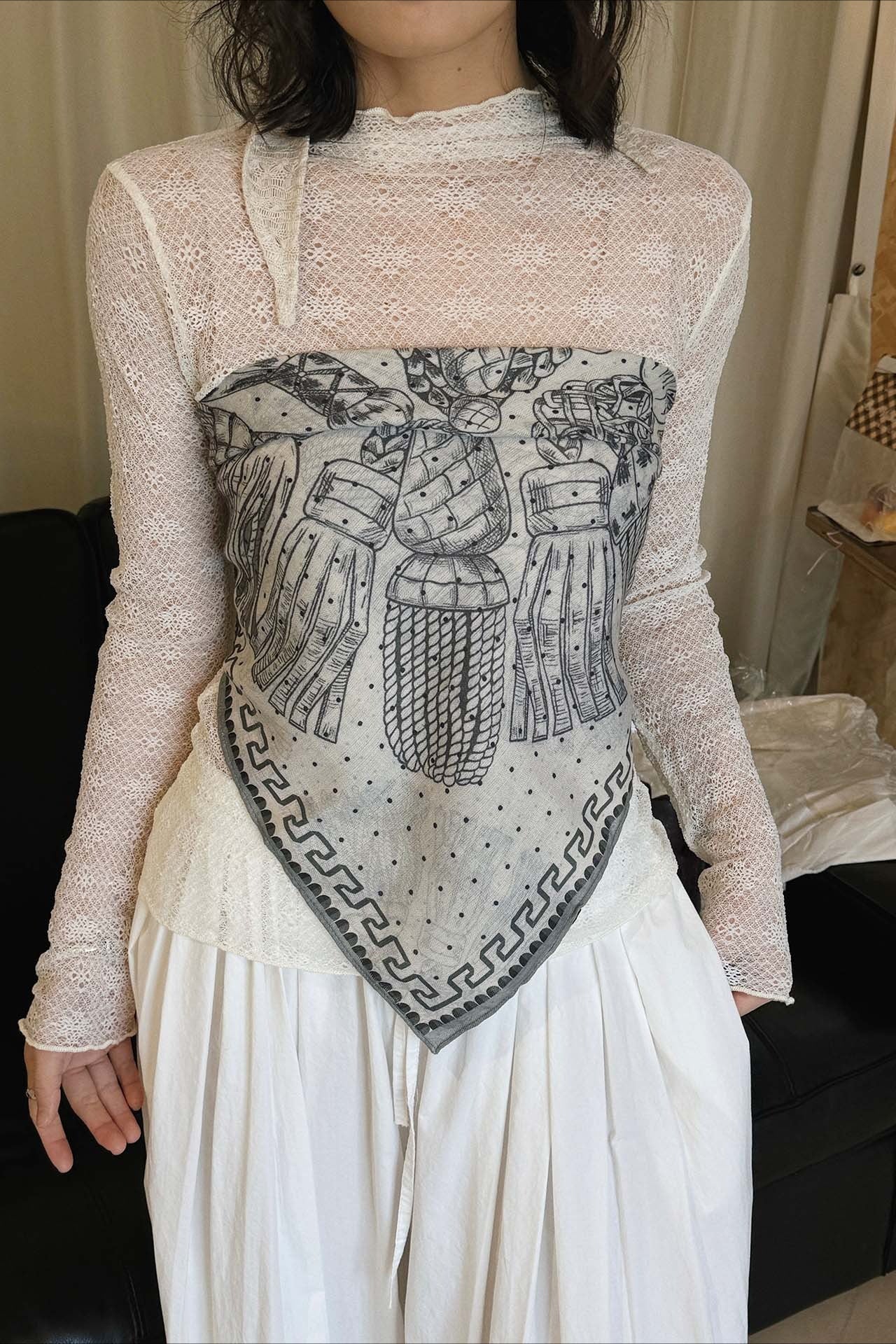 繊細な透け感が魅力のシアーレーストップス。程よくフィットするシルエットとヘルシーな素材感が、女性らしさと抜け感をプラス。トレンドライクなスカーフ合わせや、トップス合わせでレイヤードスタイルを楽しめる一枚。同シリーズの「ヴィンテージライクプリントスカーフ 2277」を合わせることで、よりトレンド感のあるスタイリングに仕上がり、セットでの購入もおすすめです。