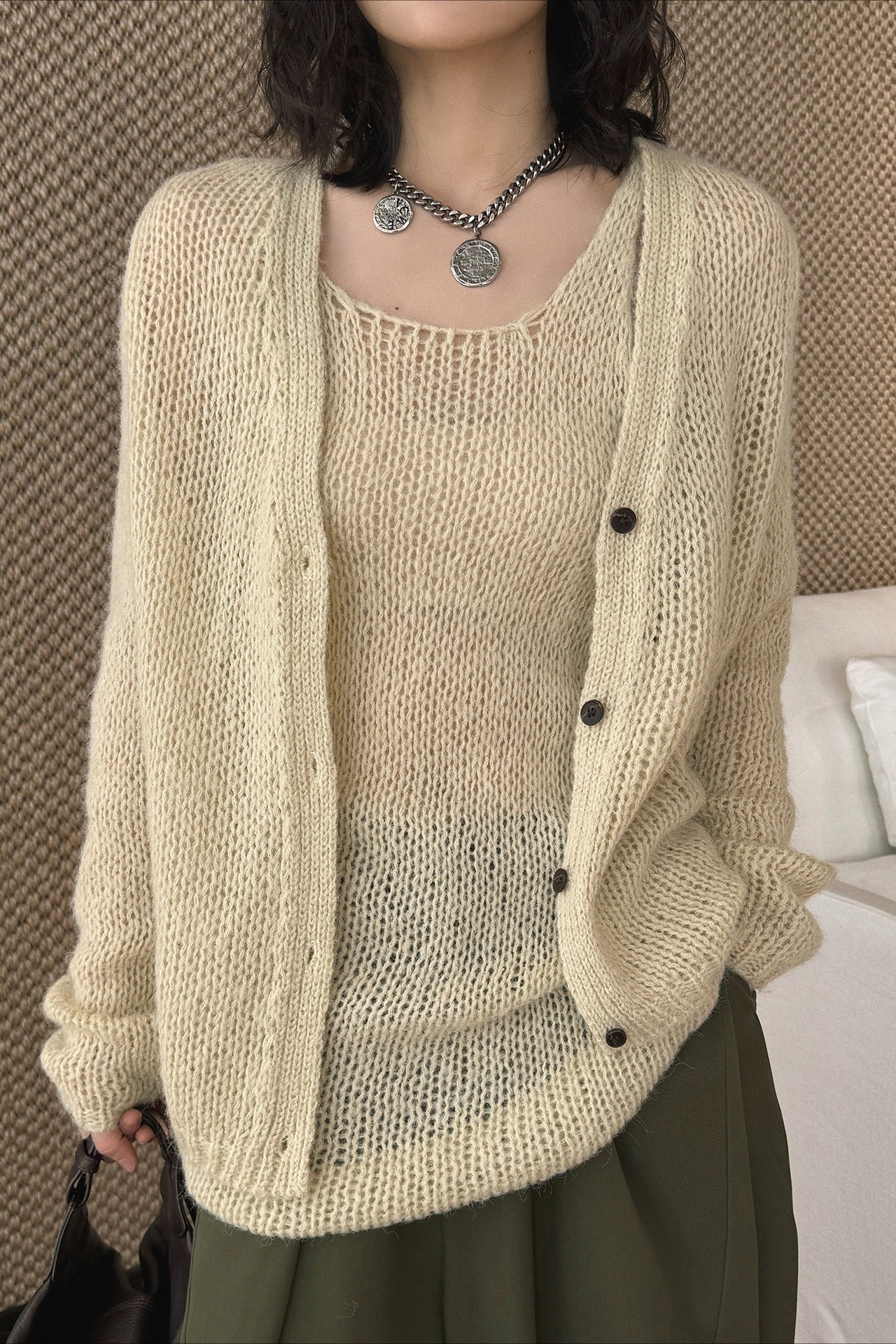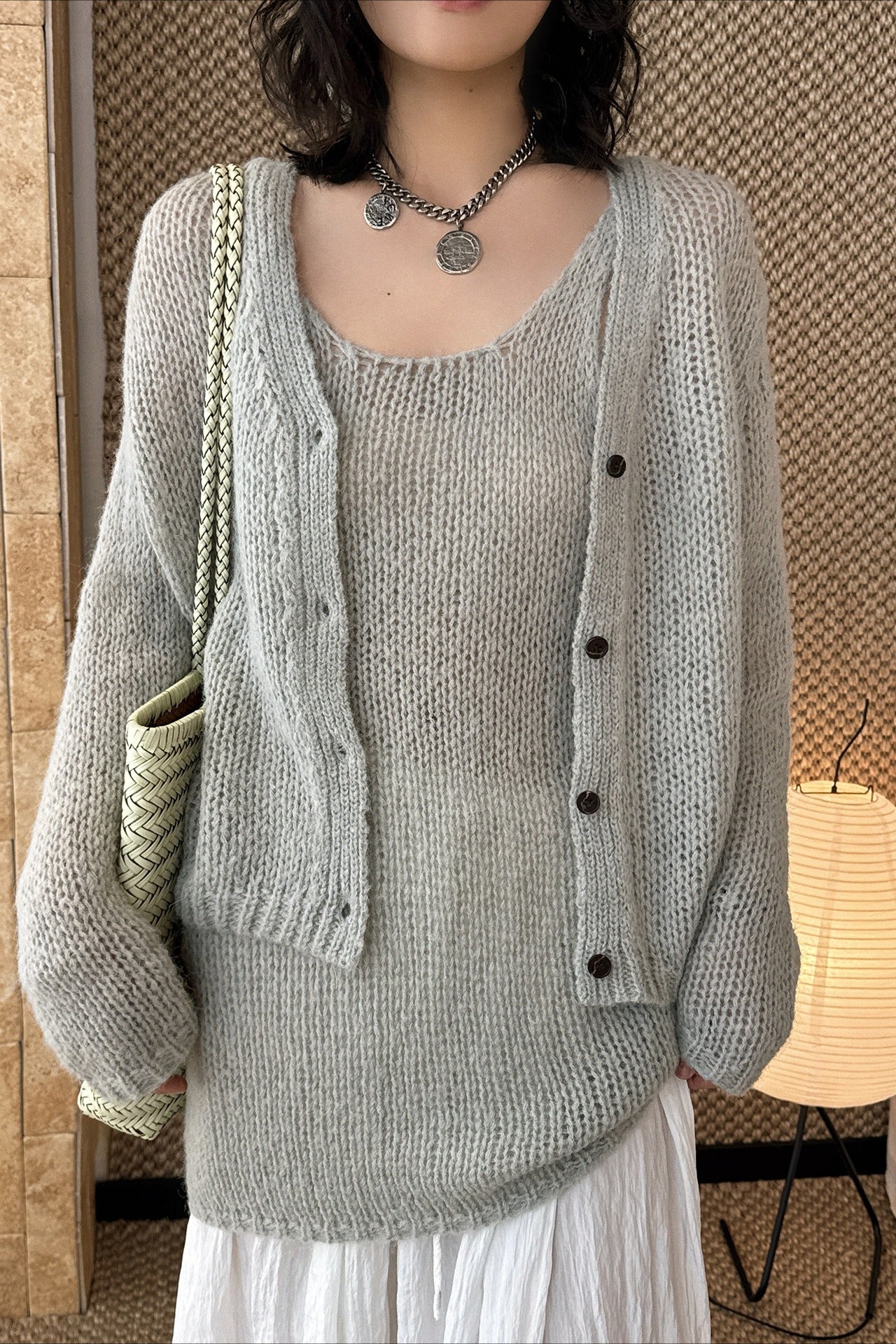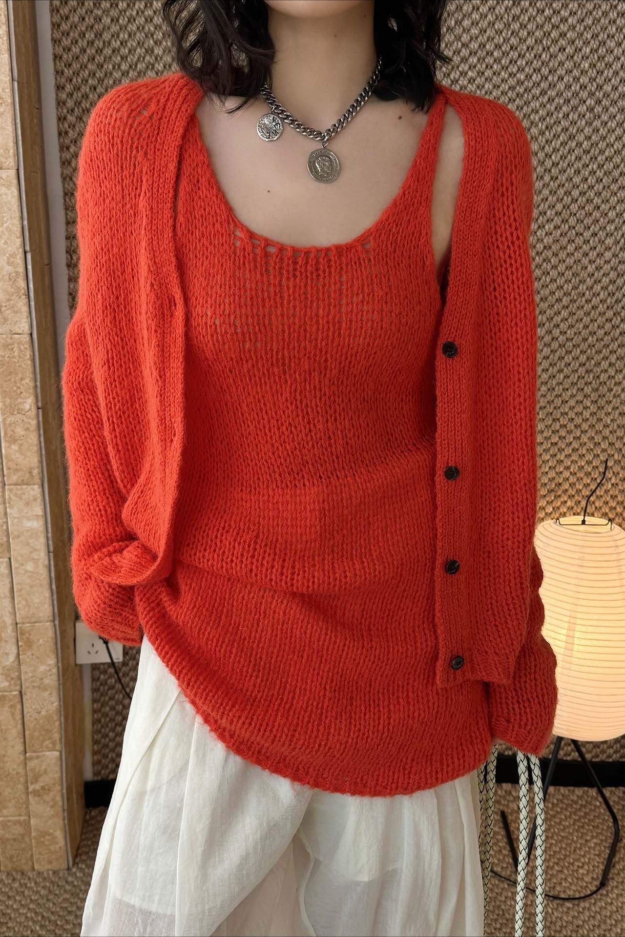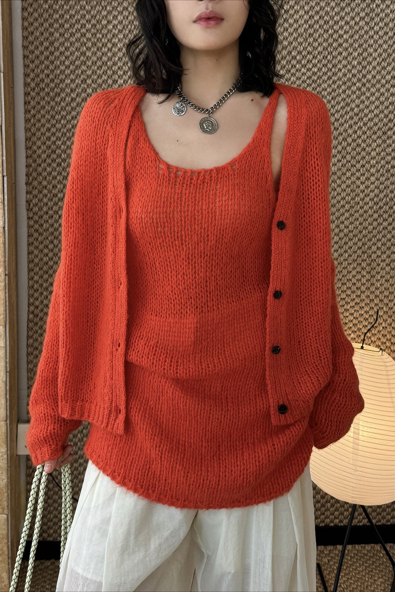 ヘルシーさが印象的な、透かし編みニットアンサンブル。キャミソールとカーディガンのセットで、レイヤードするだけでヘルシーさと女性らしさのあるスタイリングが完成します。程よく肌を透かす編地と、甘さを抑えたデザインが大人の抜け感をプラス。セットではもちろん、単品使いでも着回しやすく、シーズンムードを高めてくれる一着です。春先から初夏まで楽しめます。