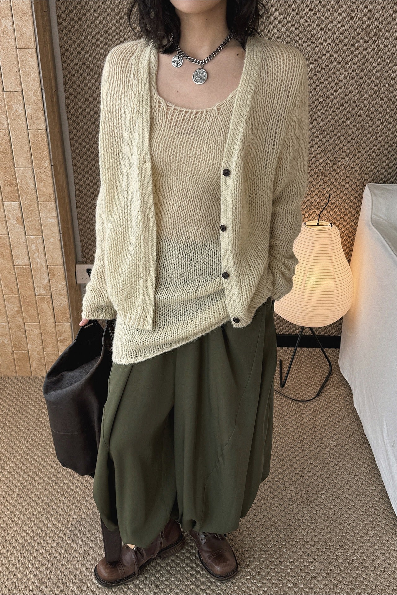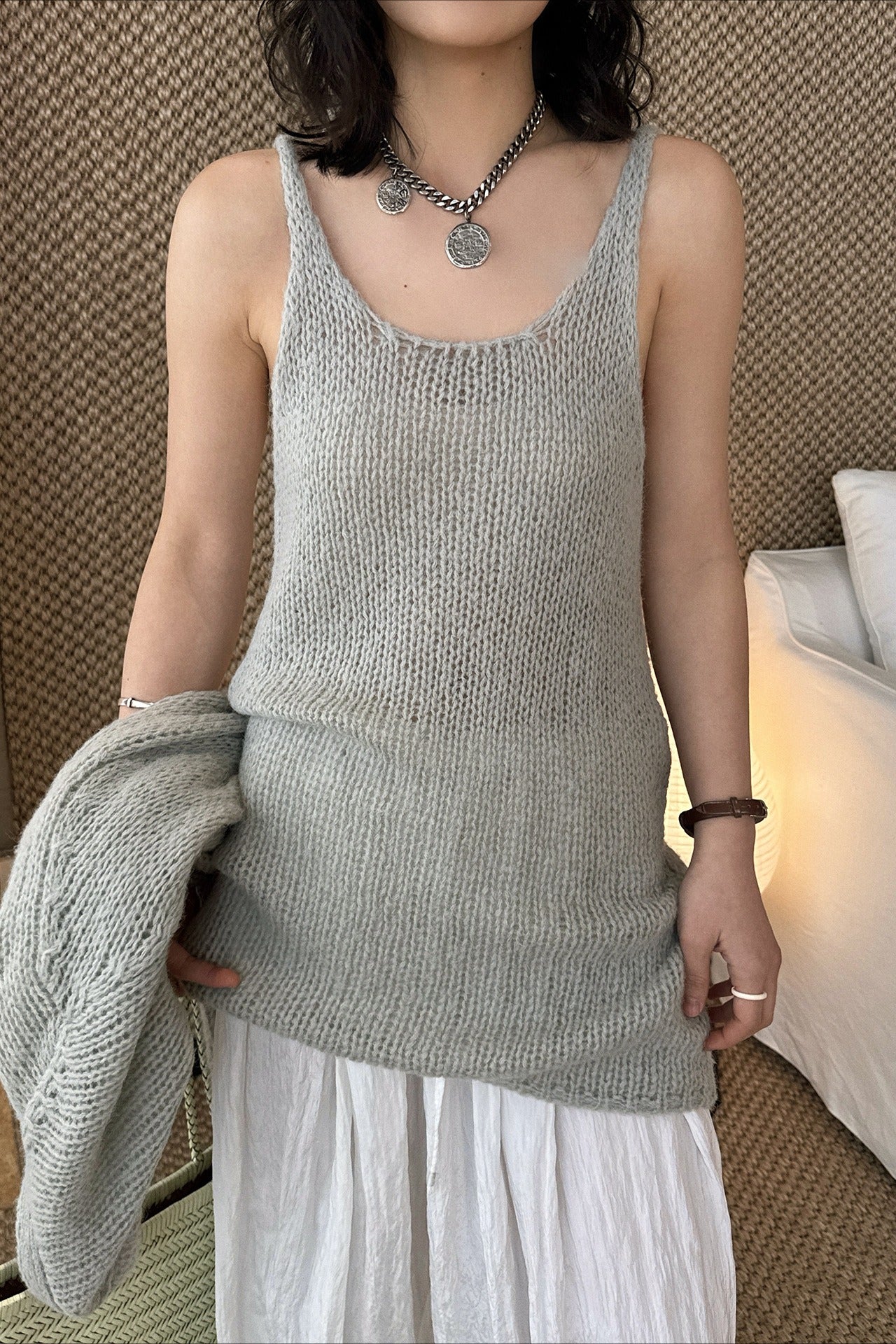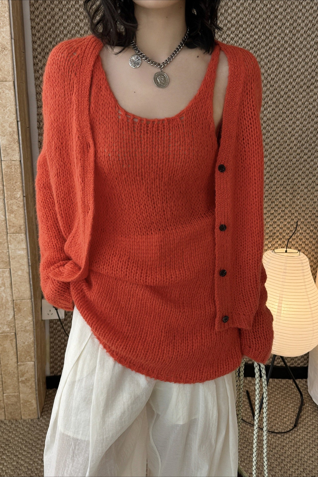ヘルシーさが印象的な、透かし編みニットアンサンブル。キャミソールとカーディガンのセットで、レイヤードするだけでヘルシーさと女性らしさのあるスタイリングが完成します。程よく肌を透かす編地と、甘さを抑えたデザインが大人の抜け感をプラス。セットではもちろん、単品使いでも着回しやすく、シーズンムードを高めてくれる一着です。春先から初夏まで楽しめます。