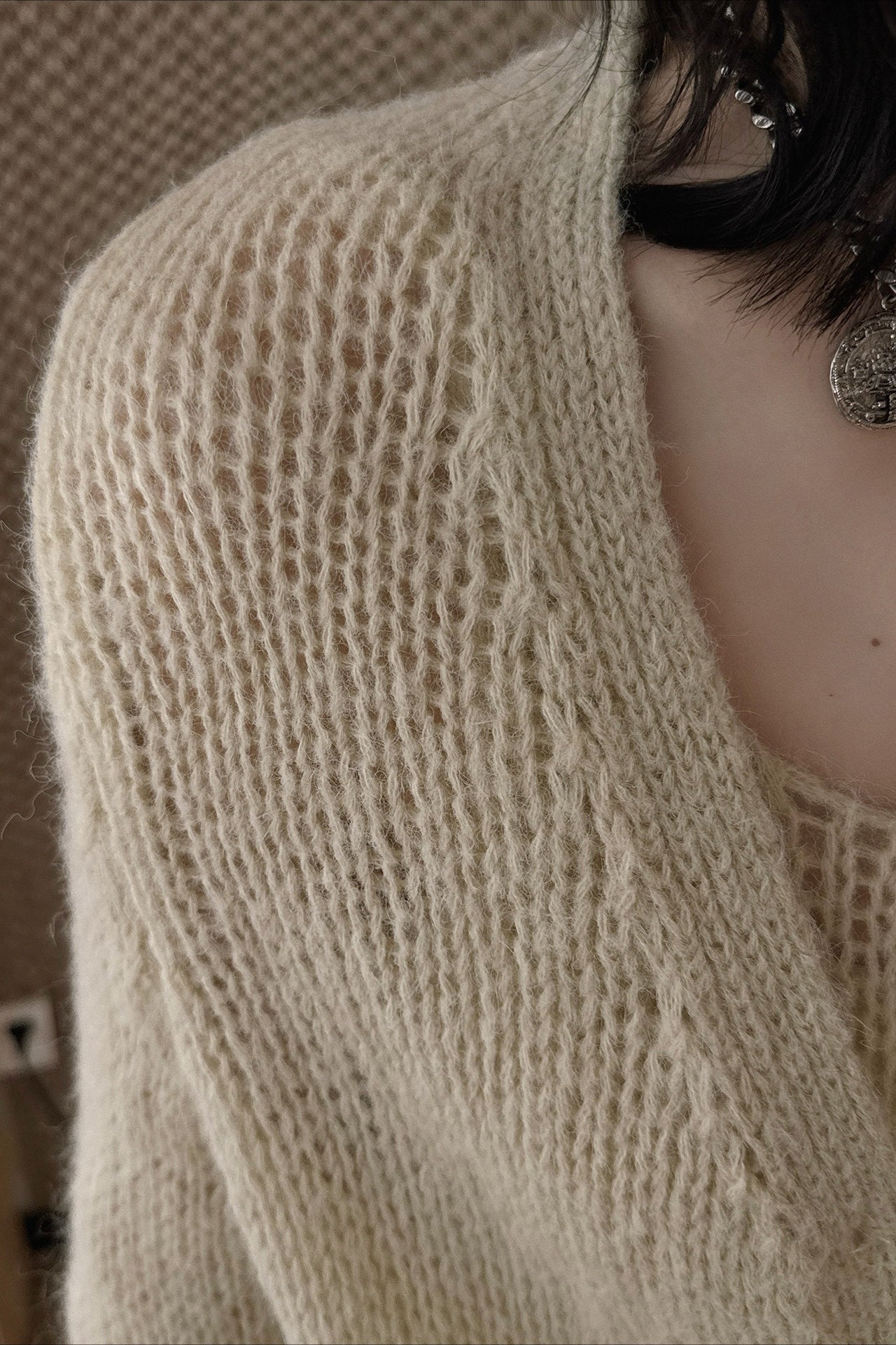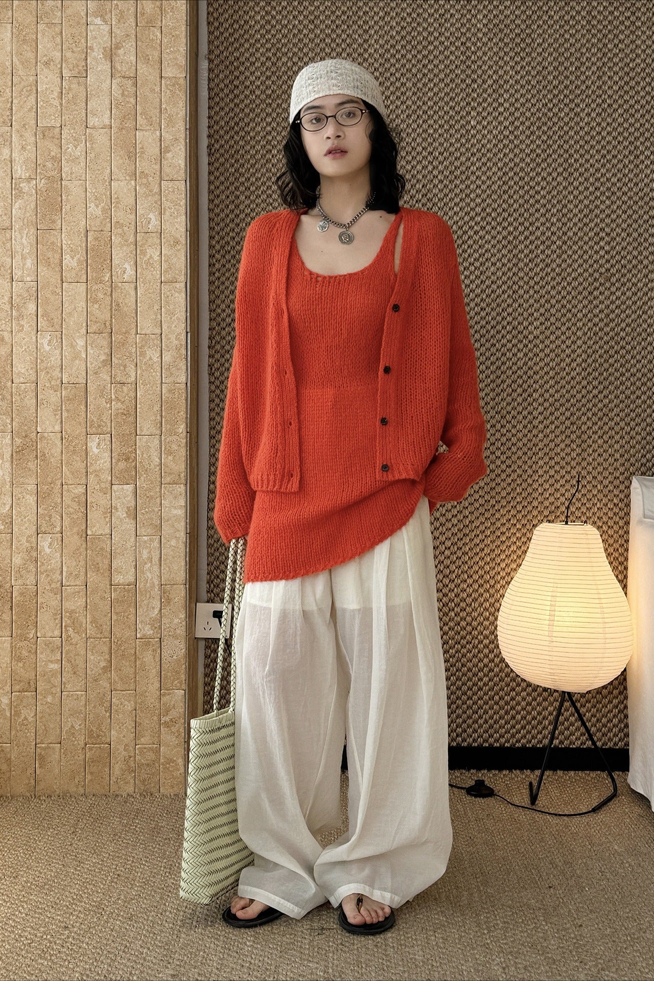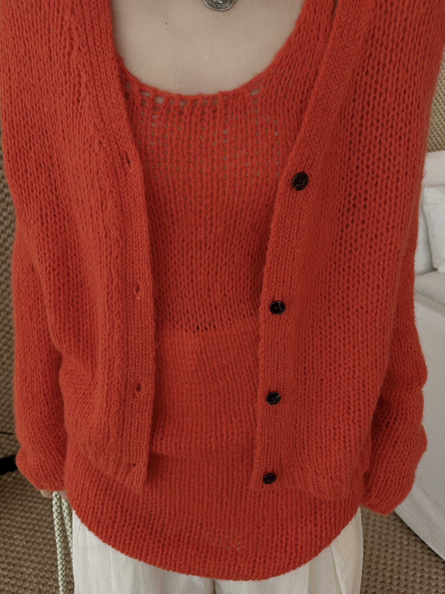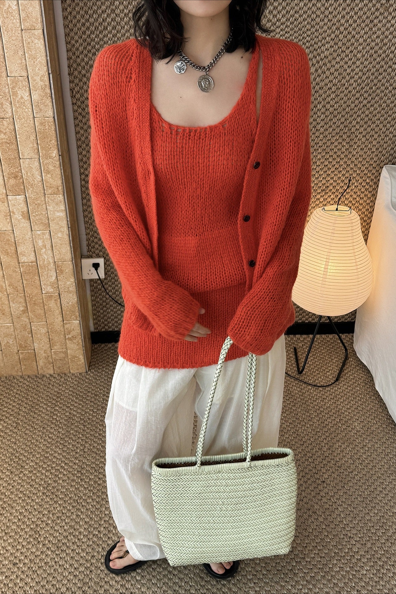 ヘルシーさが印象的な、透かし編みニットアンサンブル。キャミソールとカーディガンのセットで、レイヤードするだけでヘルシーさと女性らしさのあるスタイリングが完成します。程よく肌を透かす編地と、甘さを抑えたデザインが大人の抜け感をプラス。セットではもちろん、単品使いでも着回しやすく、シーズンムードを高めてくれる一着です。春先から初夏まで楽しめます。